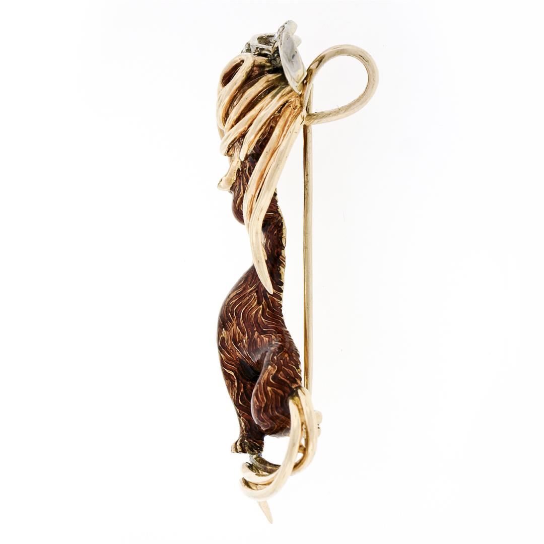 A vintage solid 18k yellow and white gold dog brooch pendant, with brown enamel work and 2 round cut natural rubies (0.10ctw), and 3 round single cut natural diamonds (G- VS2 ; 0.03ctw ). Measures 56.75x28.50mm and weighs a total of 18.75 grams.