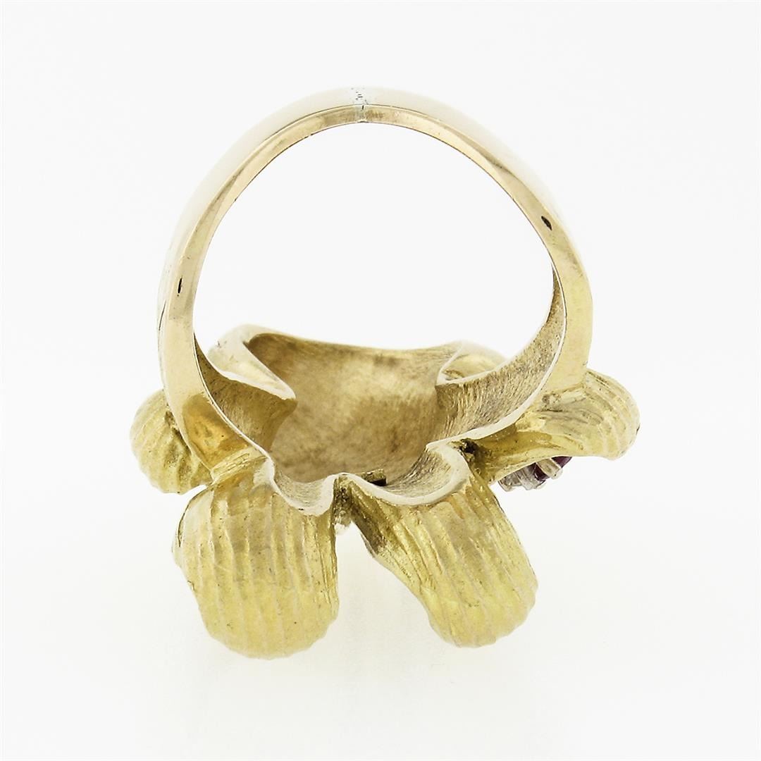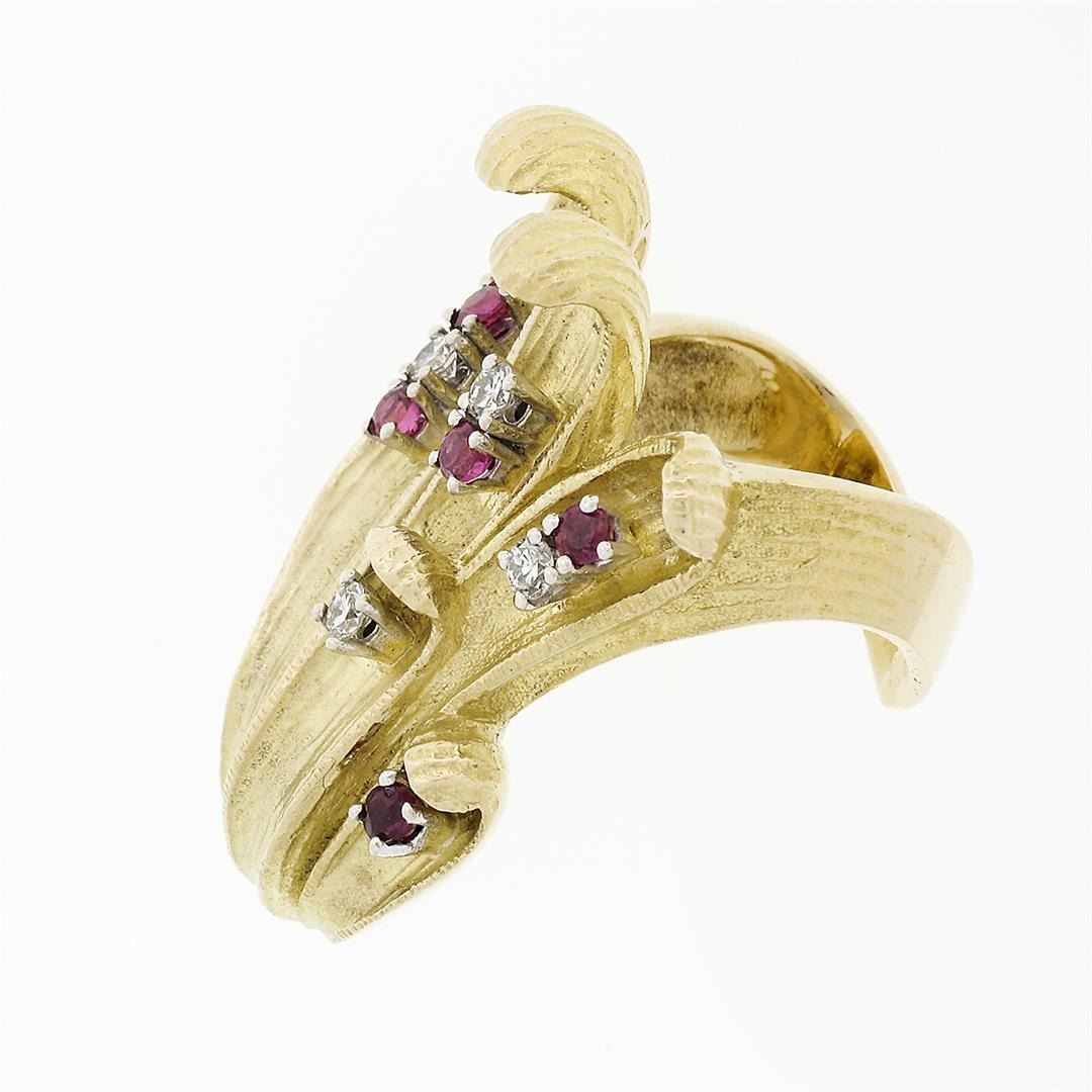A vintage solid 18k yellow gold leaf ring, with 5 round brilliant cut natural rubies (0.30ctw), & 4 round brilliant cut natural diamonds (F/G- VS1/VS2; 0.20ctw). The ring is size 6.5, weighs a total of 21.58 grams, and measures 34.5mm wide.