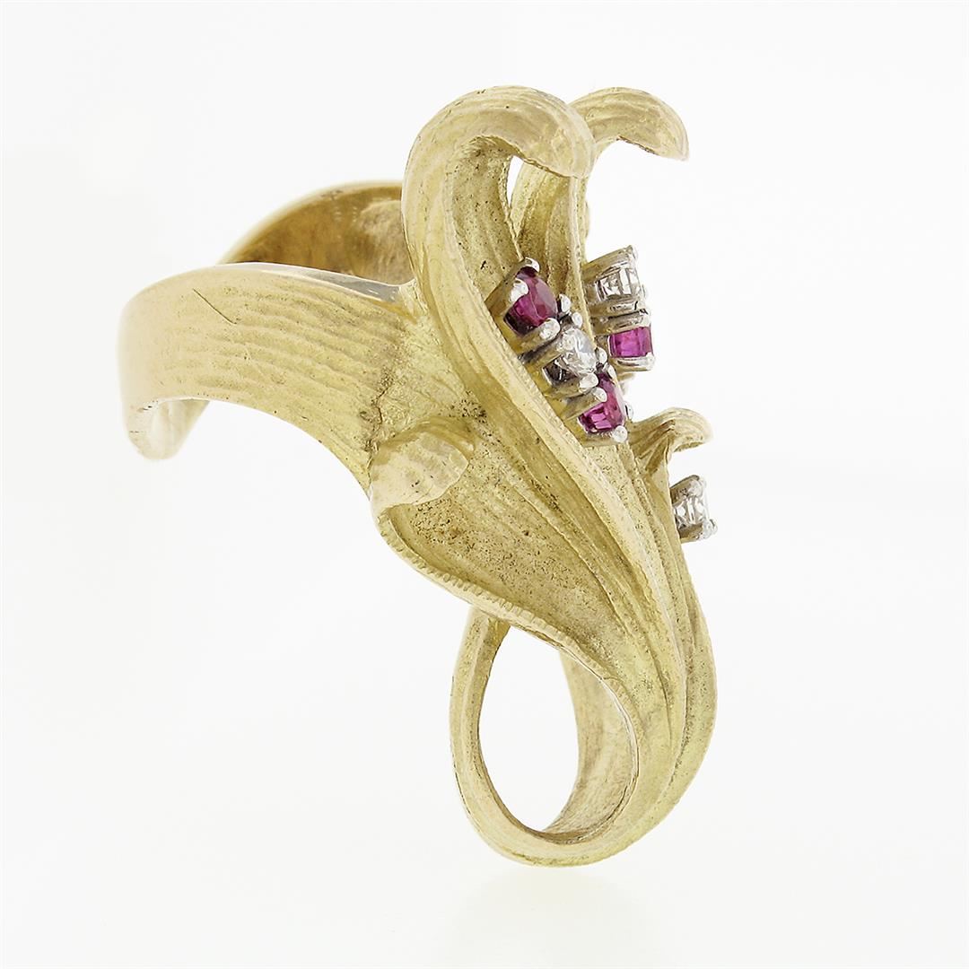 A vintage solid 18k yellow gold leaf ring, with 5 round brilliant cut natural rubies (0.30ctw), & 4 round brilliant cut natural diamonds (F/G- VS1/VS2; 0.20ctw). The ring is size 6.5, weighs a total of 21.58 grams, and measures 34.5mm wide.