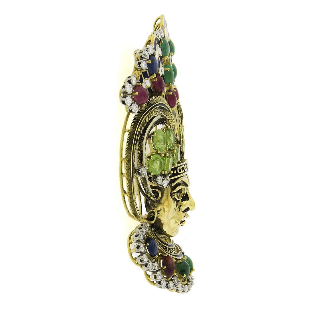A vintage solid 18k yellow gold tribal face brooch, with multi colors enamel work and 10 oval & round cut natural peridots (6.7-7.5 mm x 6-6.4 mm & 6.5mm), 4 round & oval cabochon cut natural sapphires (6.5-7 mm x 5.8-6 mm & 5.75mm), 8 oval cabochon cut natural ruby (6-8.1 mm x 4.5-5.7 mm), 6 oval & round cabochon cut natural emeralds (6.5-7 mm x 5.3-6.5 mm & 7.2mm), and 55 round cut natural diamonds (G/H - VS1-SI2 w/ Few I ; 4.25ctw). Measures 93.7x70.7mm and weighs a total of 76.53 grams.