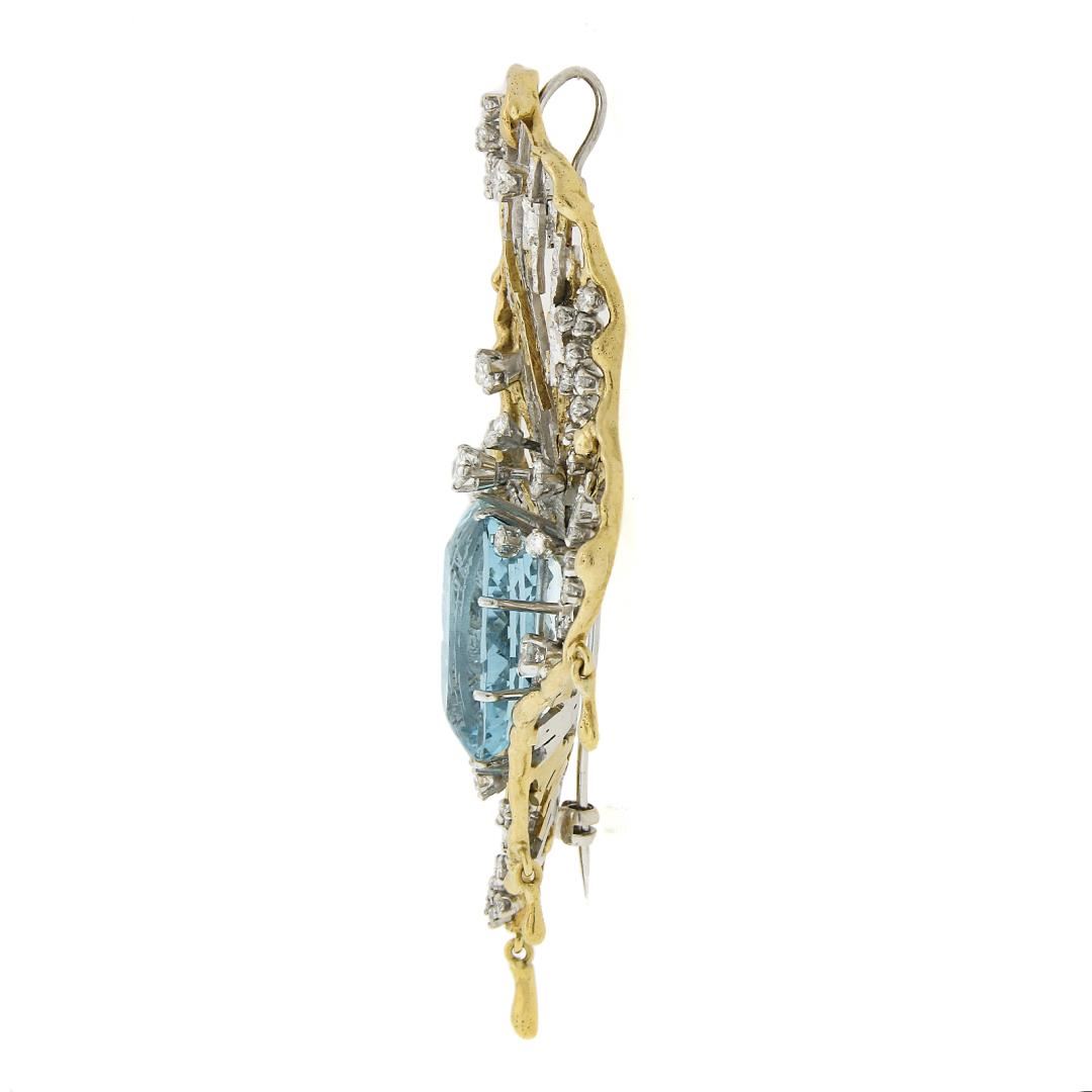 A vintage solid 18k yellow & white gold brooch, with 1 GIA garded elongated cushion cut natural aquamarine (23ct), and 56 round cut natural diamonds (F/G - VS1/VS2 ; 3ctw). Measures 86x41.7mm and weighs a total of 35.50 grams. Comes with all original relevant certifications.