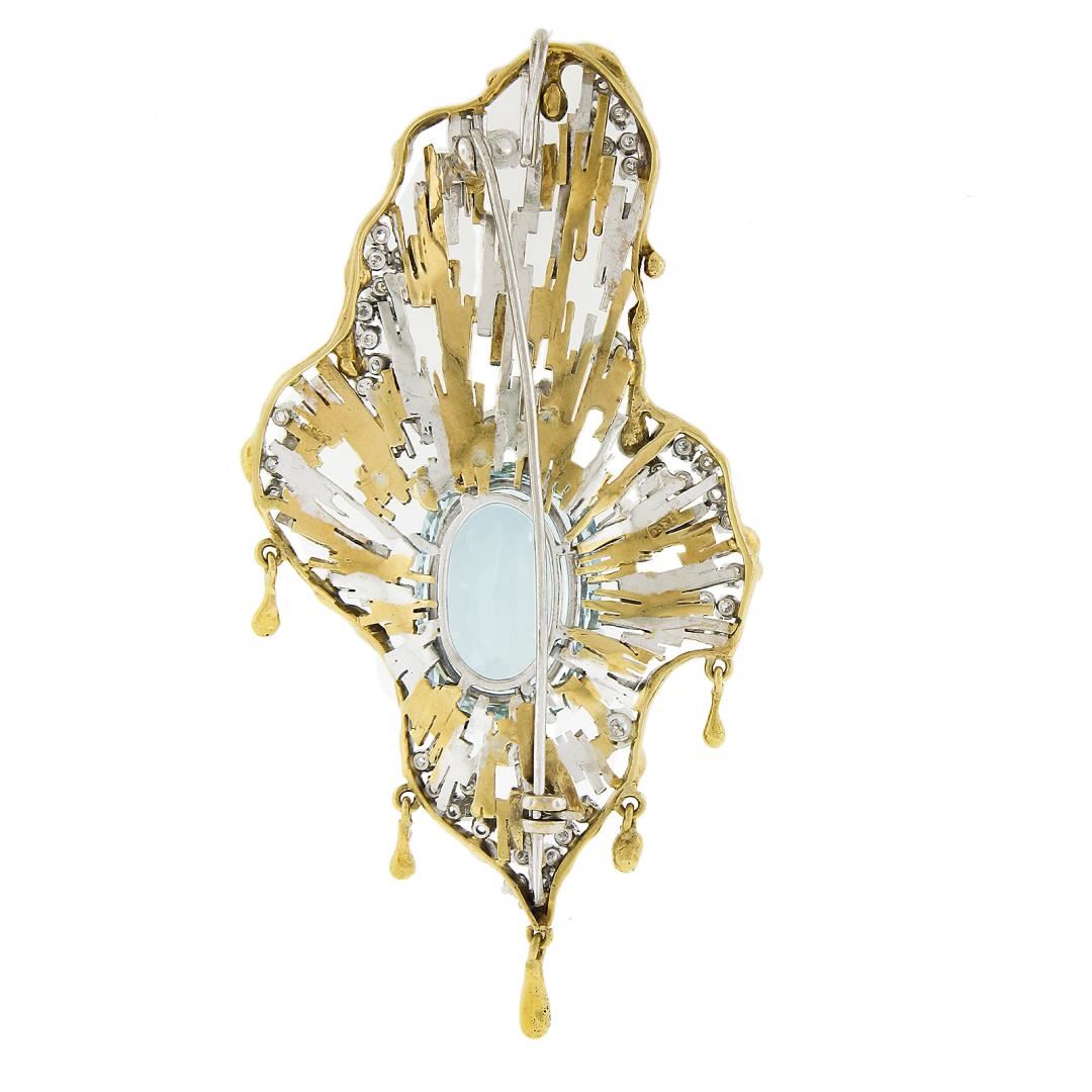 A vintage solid 18k yellow & white gold brooch, with 1 GIA garded elongated cushion cut natural aquamarine (23ct), and 56 round cut natural diamonds (F/G - VS1/VS2 ; 3ctw). Measures 86x41.7mm and weighs a total of 35.50 grams. Comes with all original relevant certifications.