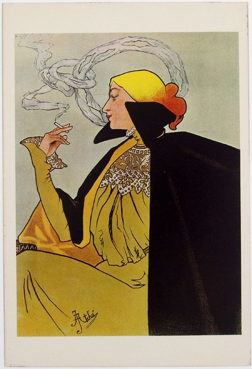 This is a vintage 1969 postcard featuring artwork by Jane Atche titled Proof for Papier Job. Sandy Val Graphics Ltd. SIZE: Approx. 6" x 9". Art Nouveau and Turn-of-the-Century Posters in miniature by Sandy Val, New York.