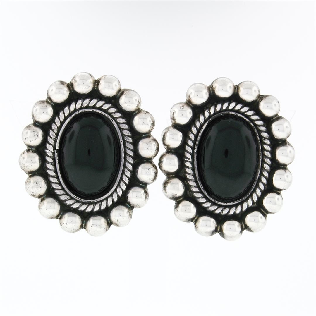 A pair of solid .925 sterling silver button earrings, with 2 oval cabochon cut natural black onyx (17.75x12.90mm). The earrings measure approximately 33.75x28.35mm and weigh a total of 22.8 grams.