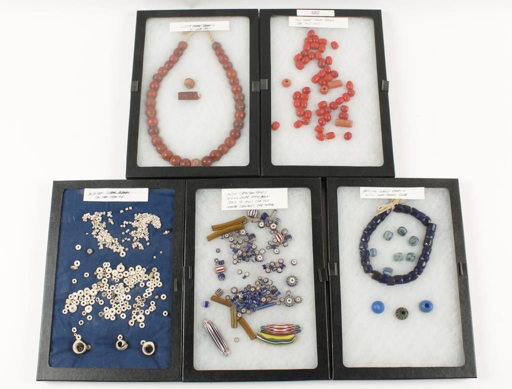 (1) Set of HoHoKam shell beads and Heishi shells. Circa 1200-1400 A.D. Approx. 100 beads, mostly small. (1) Set of misc. Chevron beads. 4, 5, and 6 layer. Most dating from 1800's to 1940's. Various sizes and patterns. Approx. 100 beads. (1) Set of Russian cobalt beads and misc. rare trade beads. Approx 35 beads. (1) Set of red trade beads. Circa mid 1800's. Approx 50 beads. (1) Set of red trade beds. Circa late 1800's. Approx 35 beads.