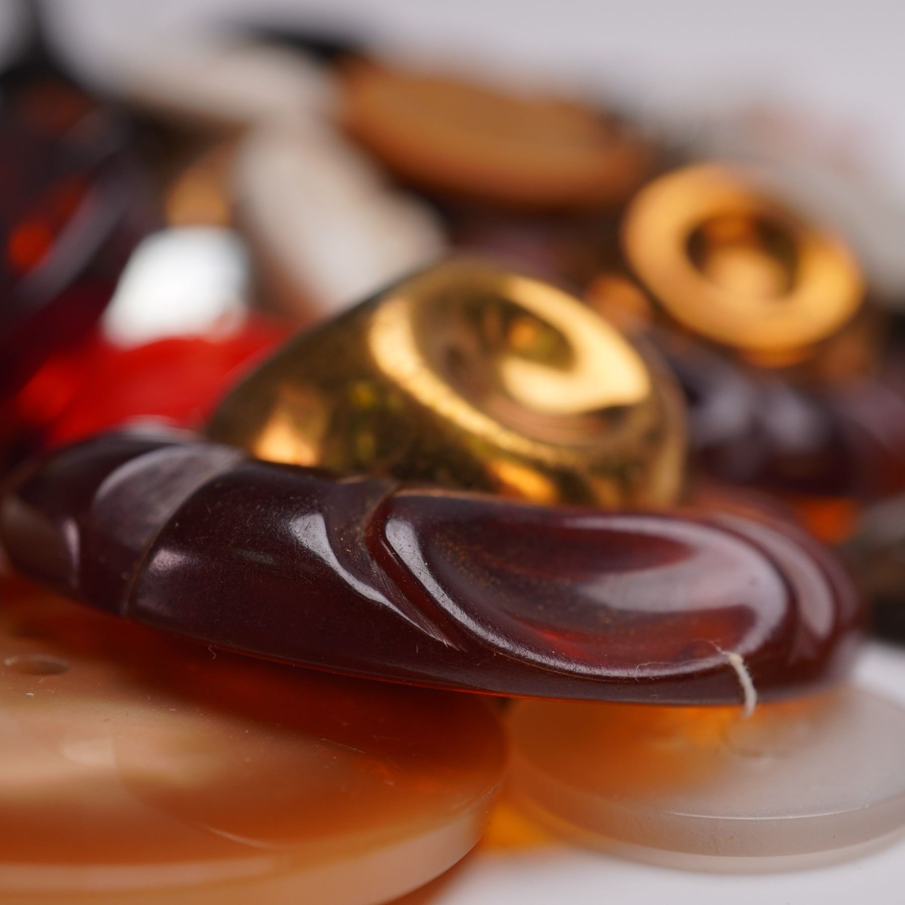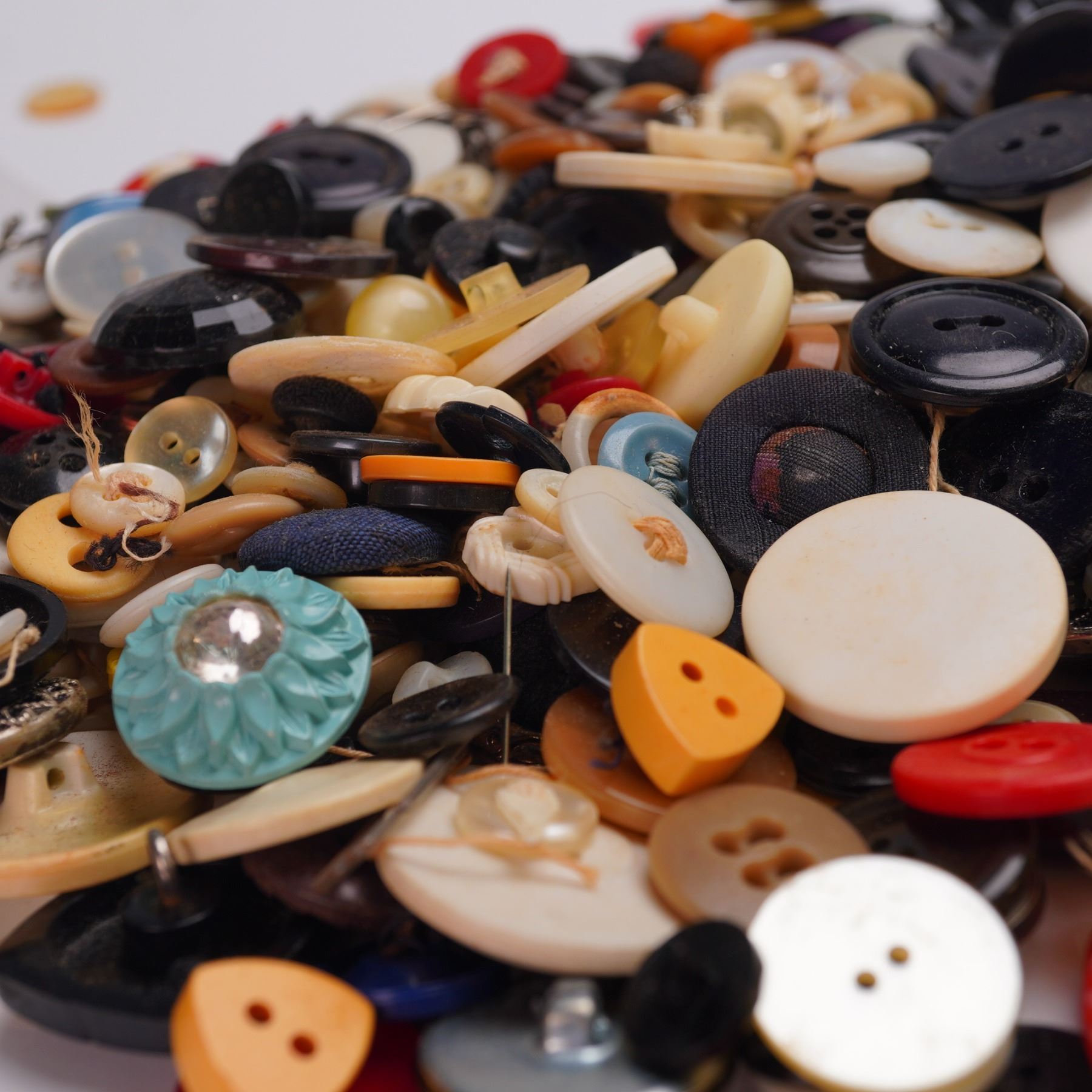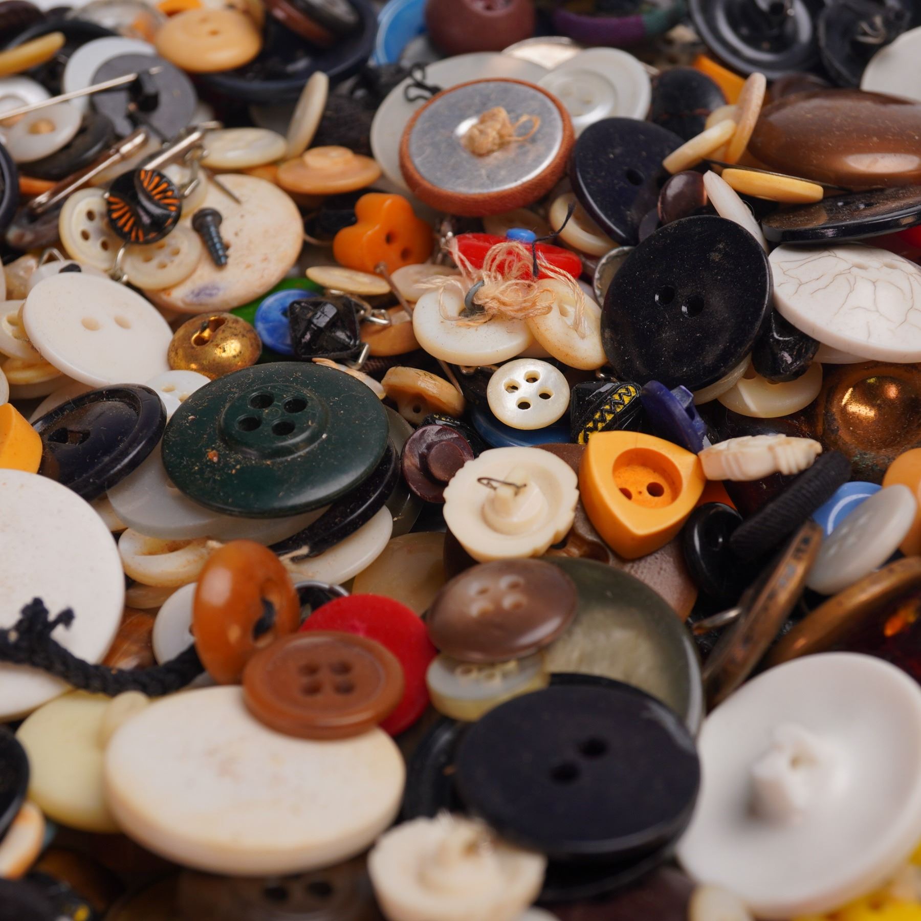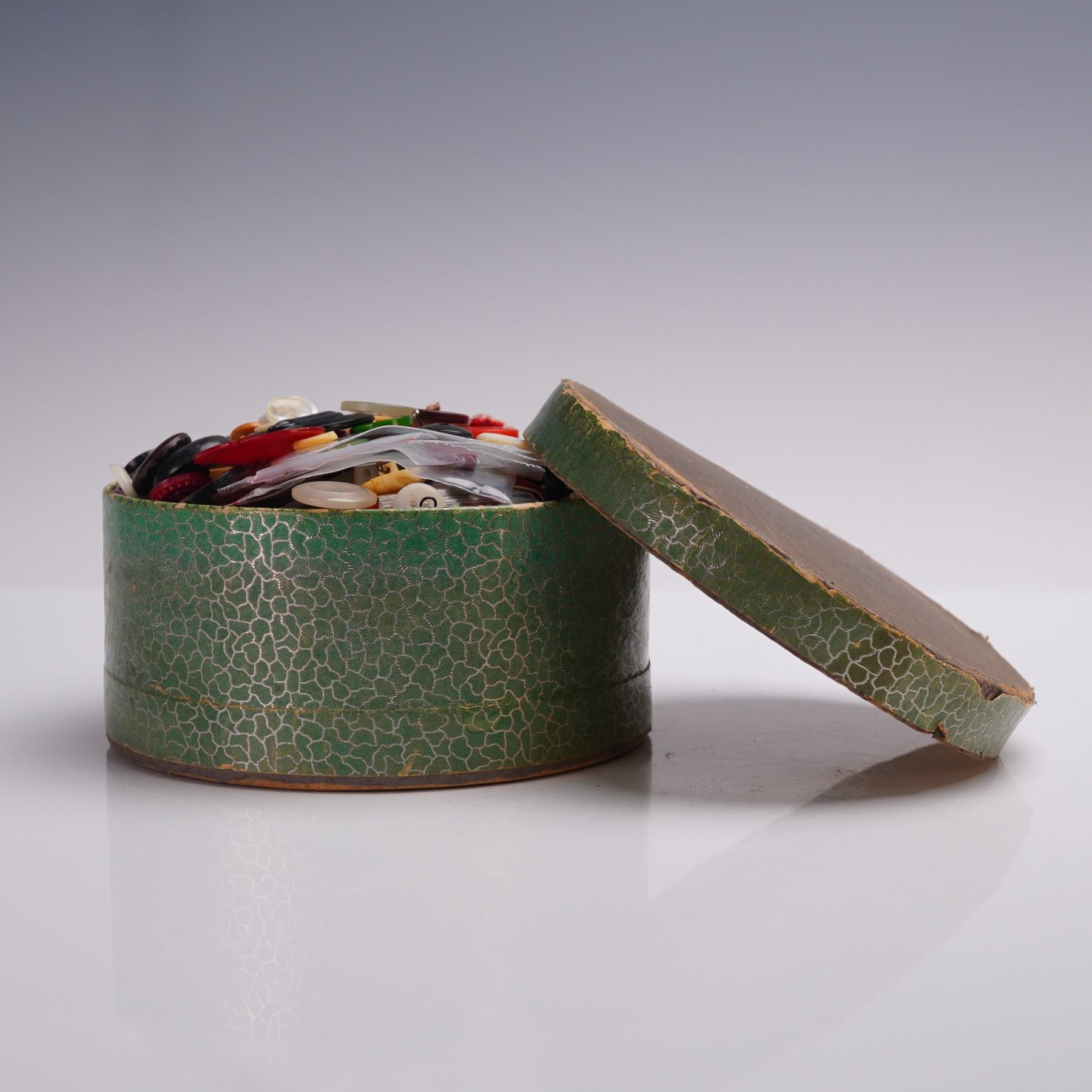Extensive vintage button collection featuring a wide assortment of materials, shapes, and colors including plastic, metal, and fabric-covered examples. Includes novelty styles, some still on cards or in small bags. Housed in a round green storage box with a lift lid. Box measures approx. 5.5"dia.