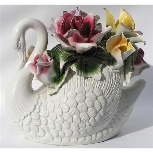 A riot of color bursts from the back of this graceful swan in the form of roses, rosebuds and a lily. Measures 12" across and stands over 10" tall and weighing in at a hefty 4 lbs. this wonderful piece would be stunning in any room of the house. There is a crack on the inside but it doesn't really show on the outside except in one very small place. Unless you know where and how to look for it you can't find it. But it is there and we have tried to show by magnifying with the camera. Marked on the bottom with the classic Capodimonte markings.