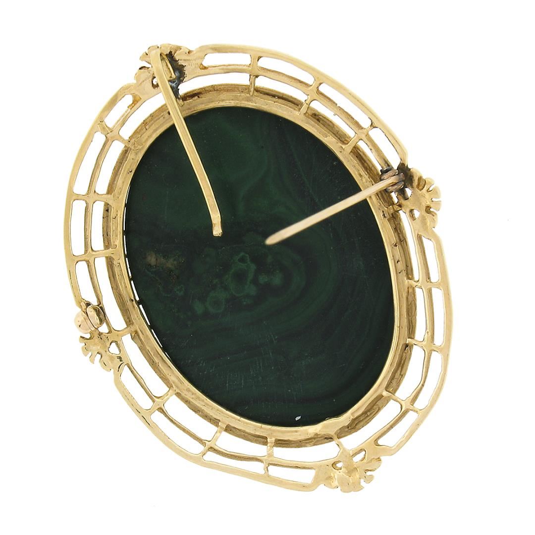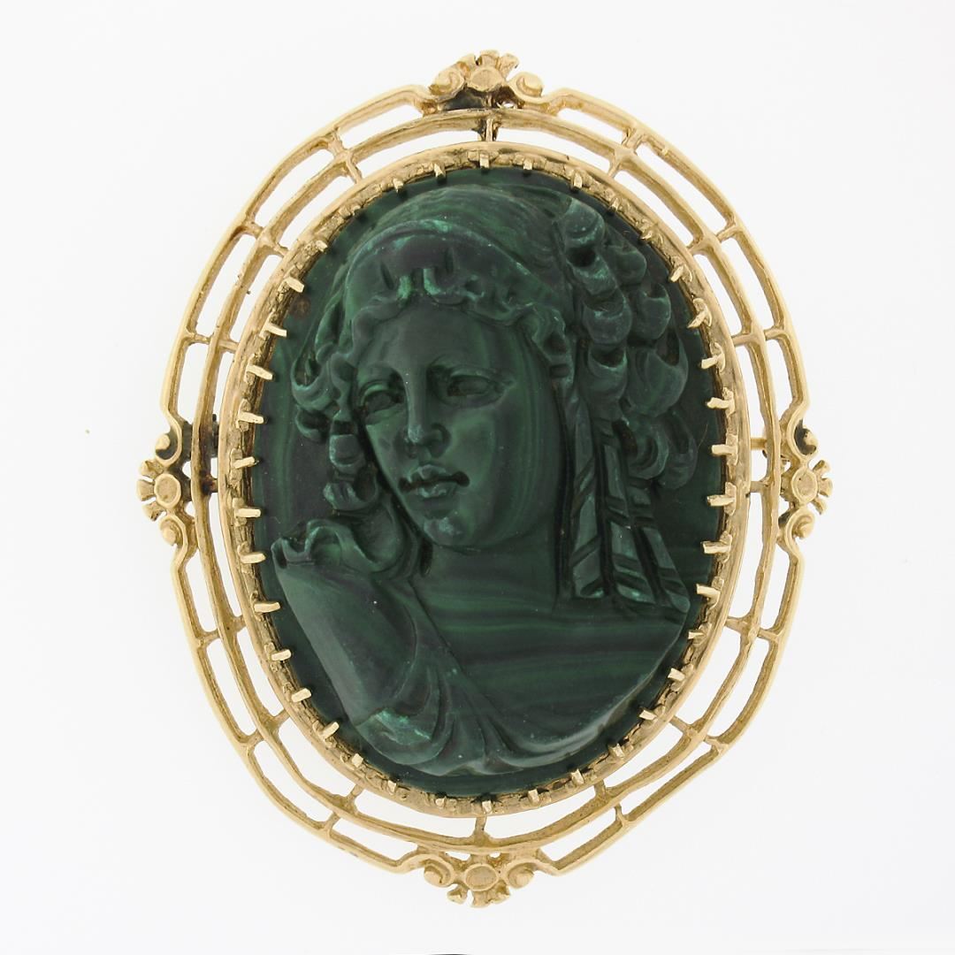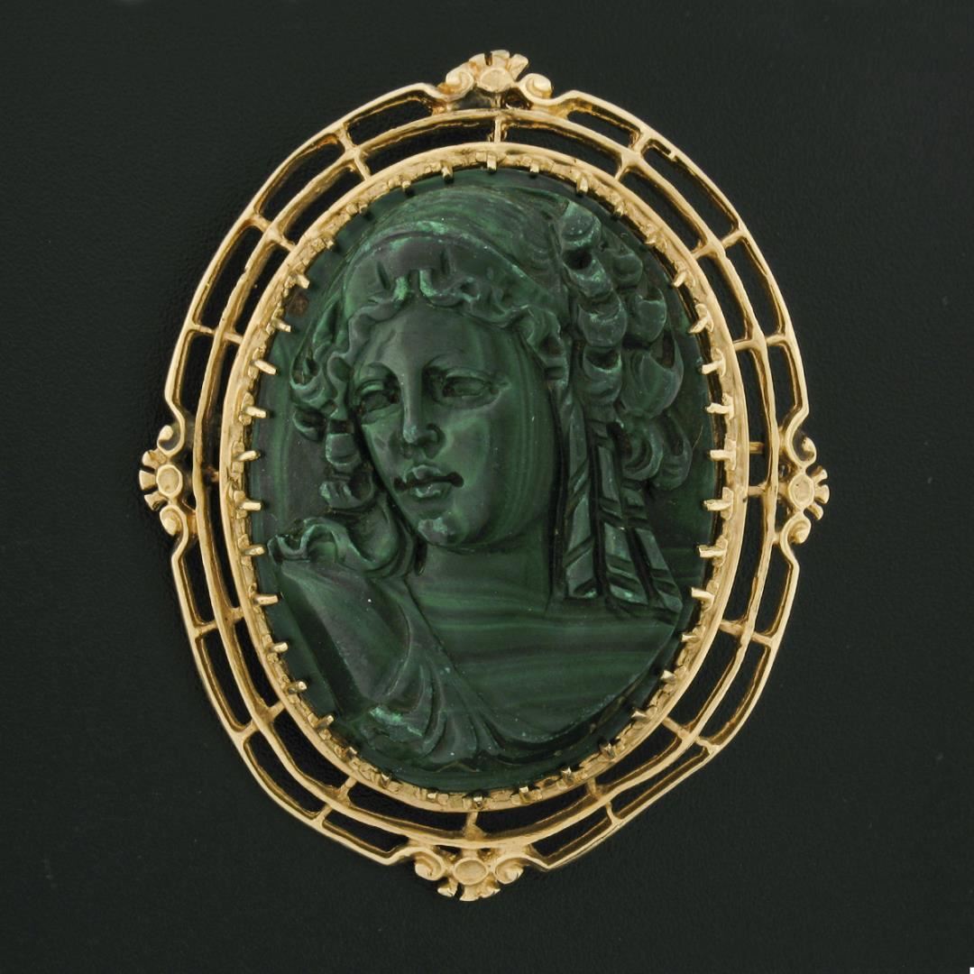 A vintage yellow gold brooch, with 1 carved cameo natural malachite (40.3x30mm). Measures 55.90x45.20mm and weighs a total of 32.53 grams.