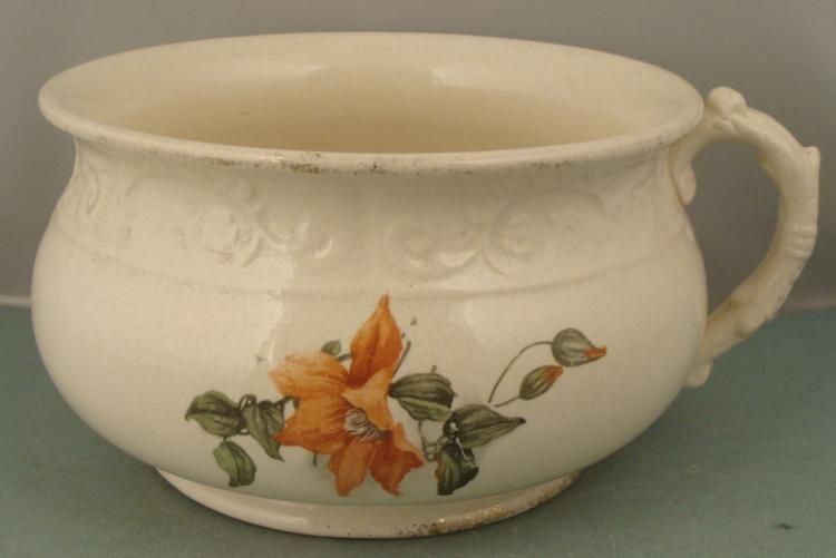 This large ceramic serving bowl has only handle, making it a more unusual piece for washing the hands and face. It is 9" in diameter, and 5" tall. The transfer pattern features red/orange flowers with green leaves on either side. There was once gold trim on the base and on the rim, but only trace amounts remain. There is crazing overall, but no bad cracks or chips. There are no maker marks, but it is definitely vintage. This bowl was well used, but well taken care of. * Bring this different design to your collection.