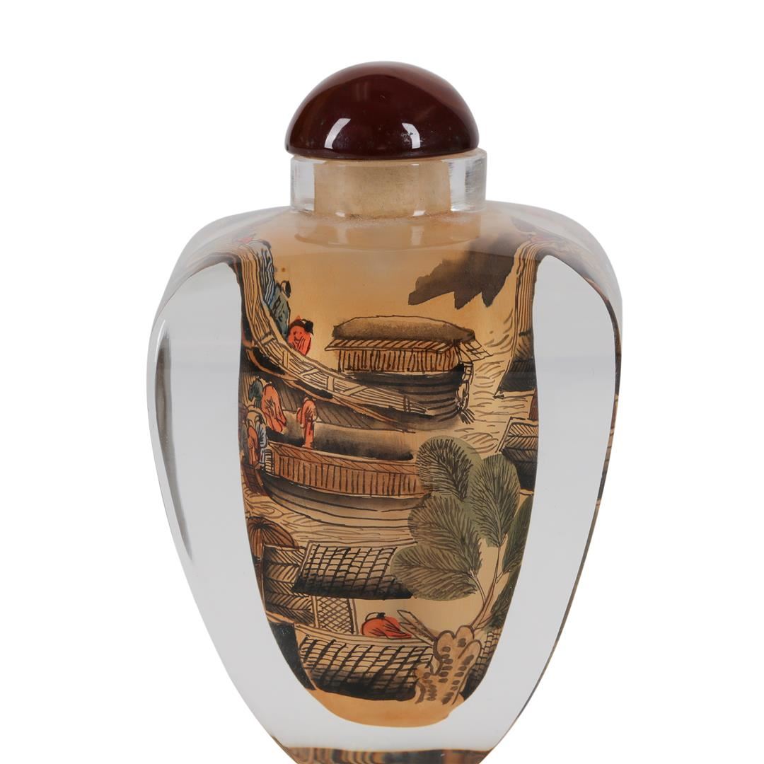 One vintage reverse painted snuff bottle, circa 1980. Features painted scenes throughout, inside the bottle underneath the frosted glass. This is achieved by using a bent brush through the neck of the bottle and painting the inside of the bottle. The bottle measures approximately three and a half inches tall, two and one quarter inch wide and two and one quarter inch deep. It is unsigned and is in very good condition overall with minor wear.