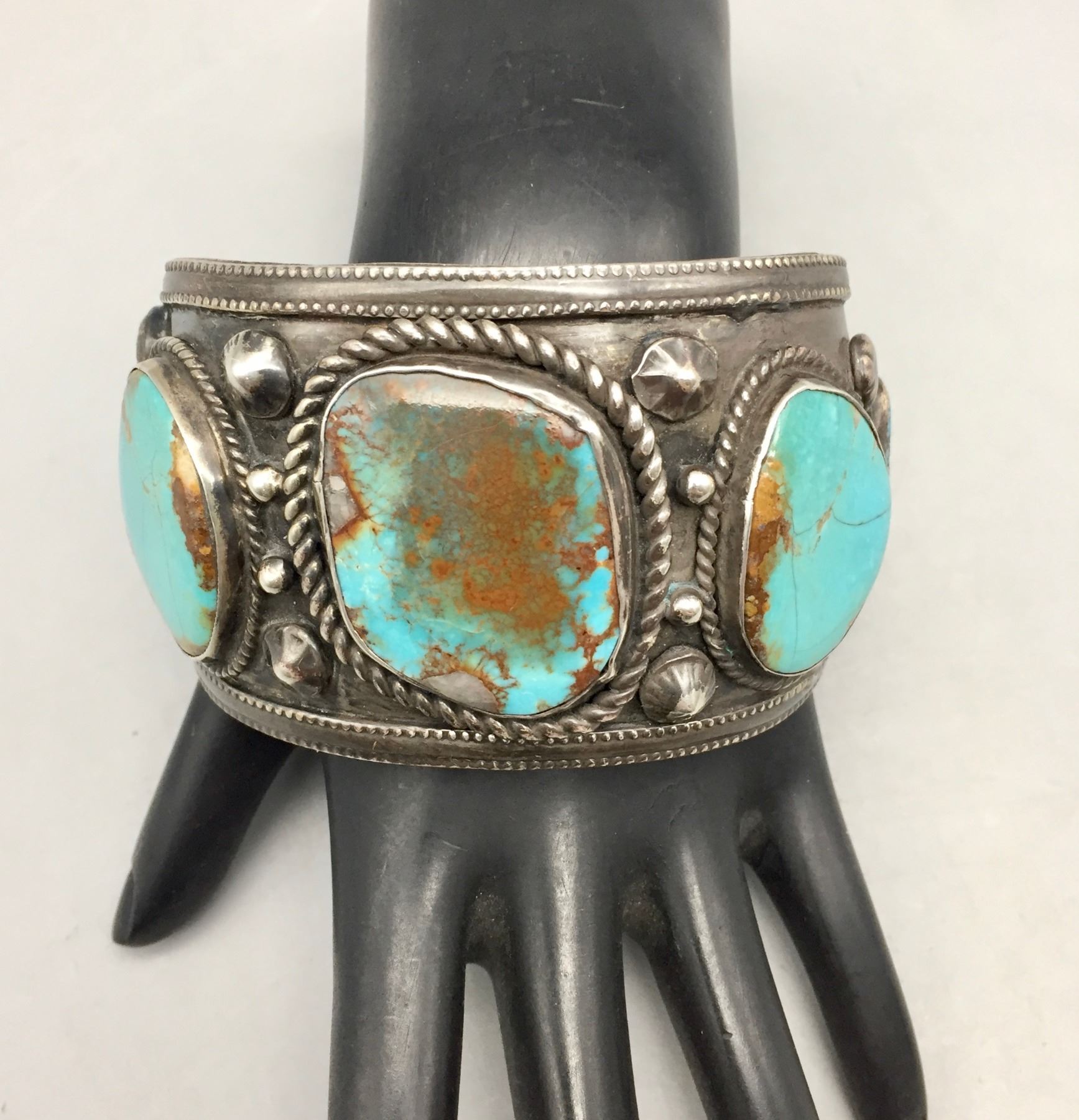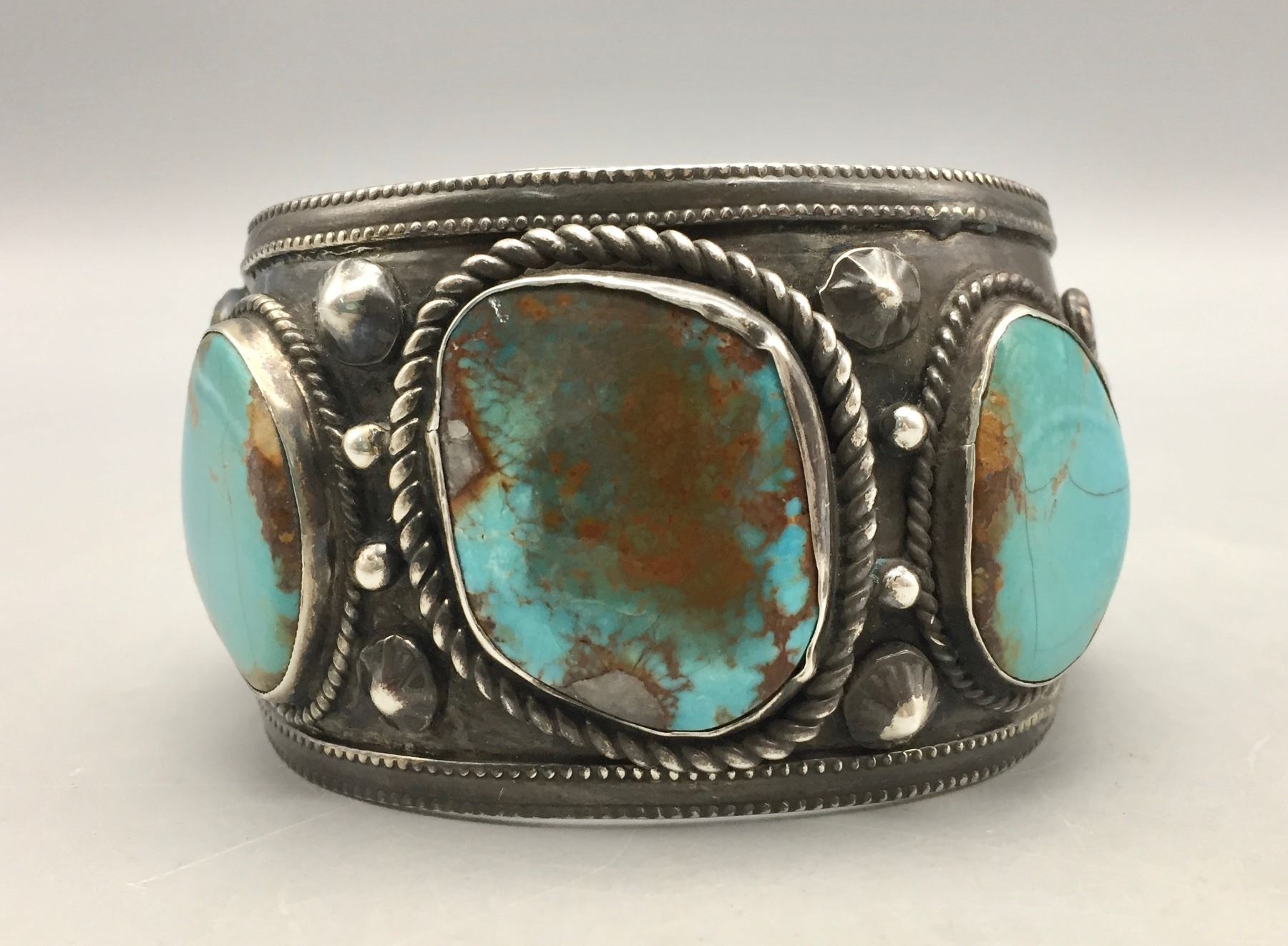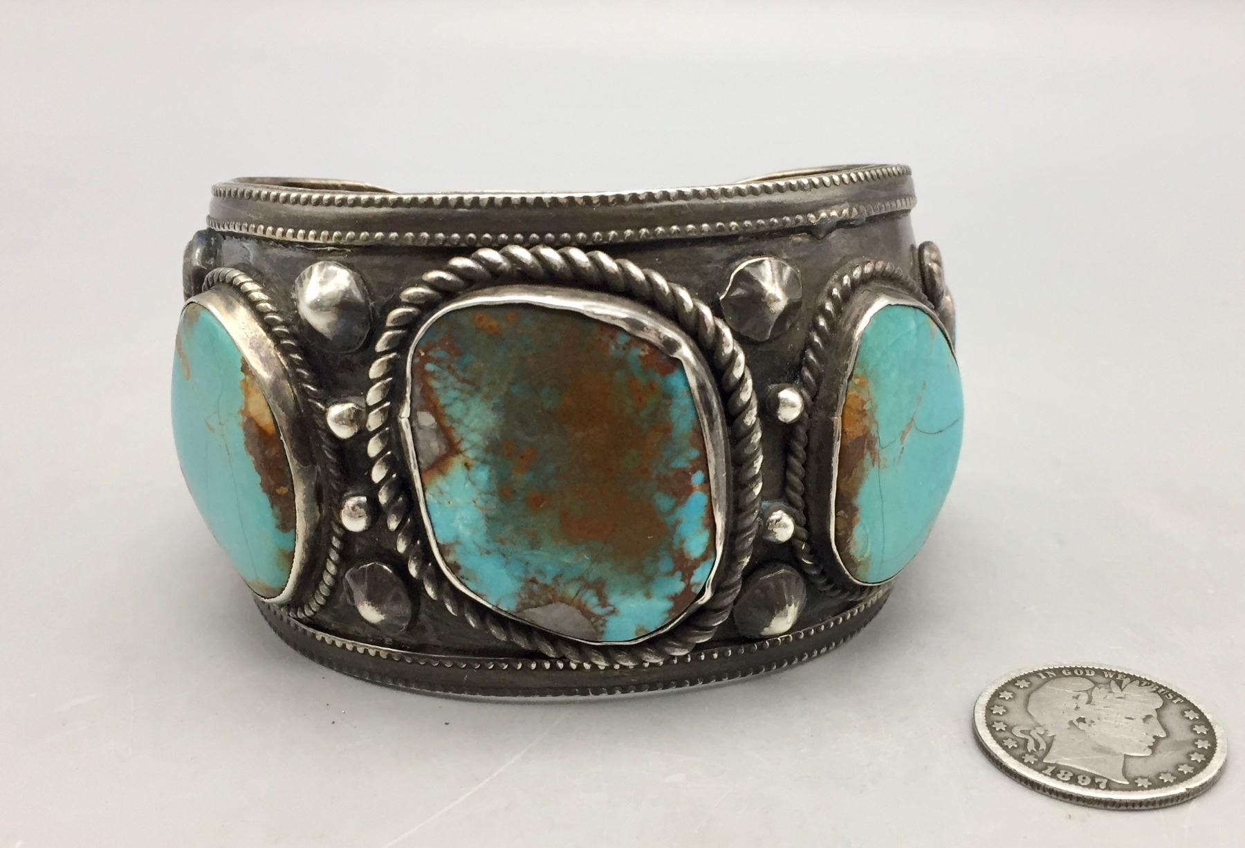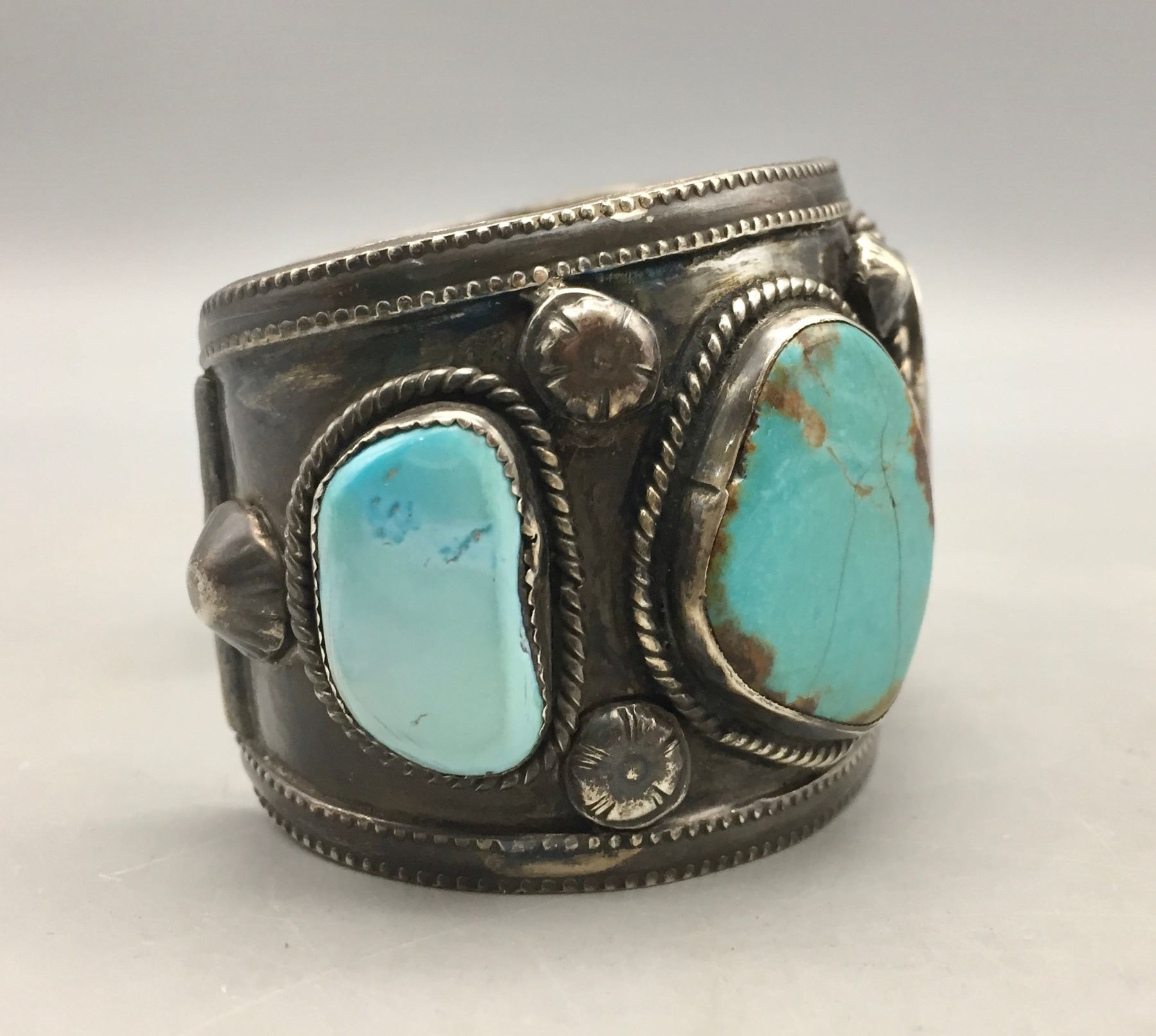 Description: For your collection is a large vintage cuff bracelet, set with five larger turquoise stones. The three stones in the middle have a nice brownish matrix, two of the stones have fine cracks. The two turquoise stones on the ends are a lighter blue color. It is sterling silver. Maker: Unknown. Approx. Age: Vintage. Size: Inside circumference is 7”, additional opening is 1-1/2” (fits a 8-1/2” wrist). 2” wide. Weighs 153.7 grams. Condition: Pretty good for its age, normal wear expected. Please look closely at the pictures - they are an important part of our description. Shipping: There will be a $5 handling / packaging fee for shipping this lot. The actual cost of postage will be added on top of that.