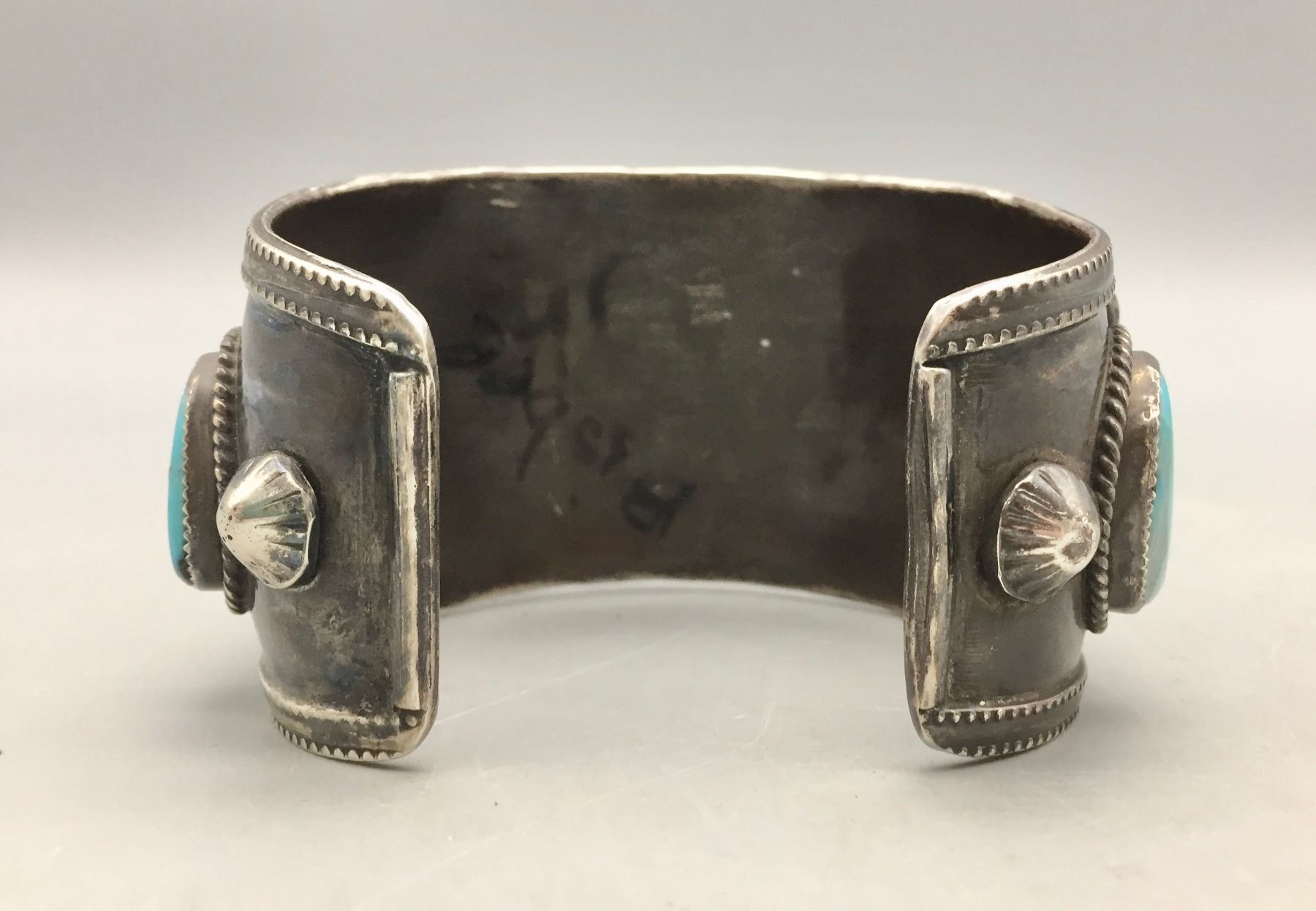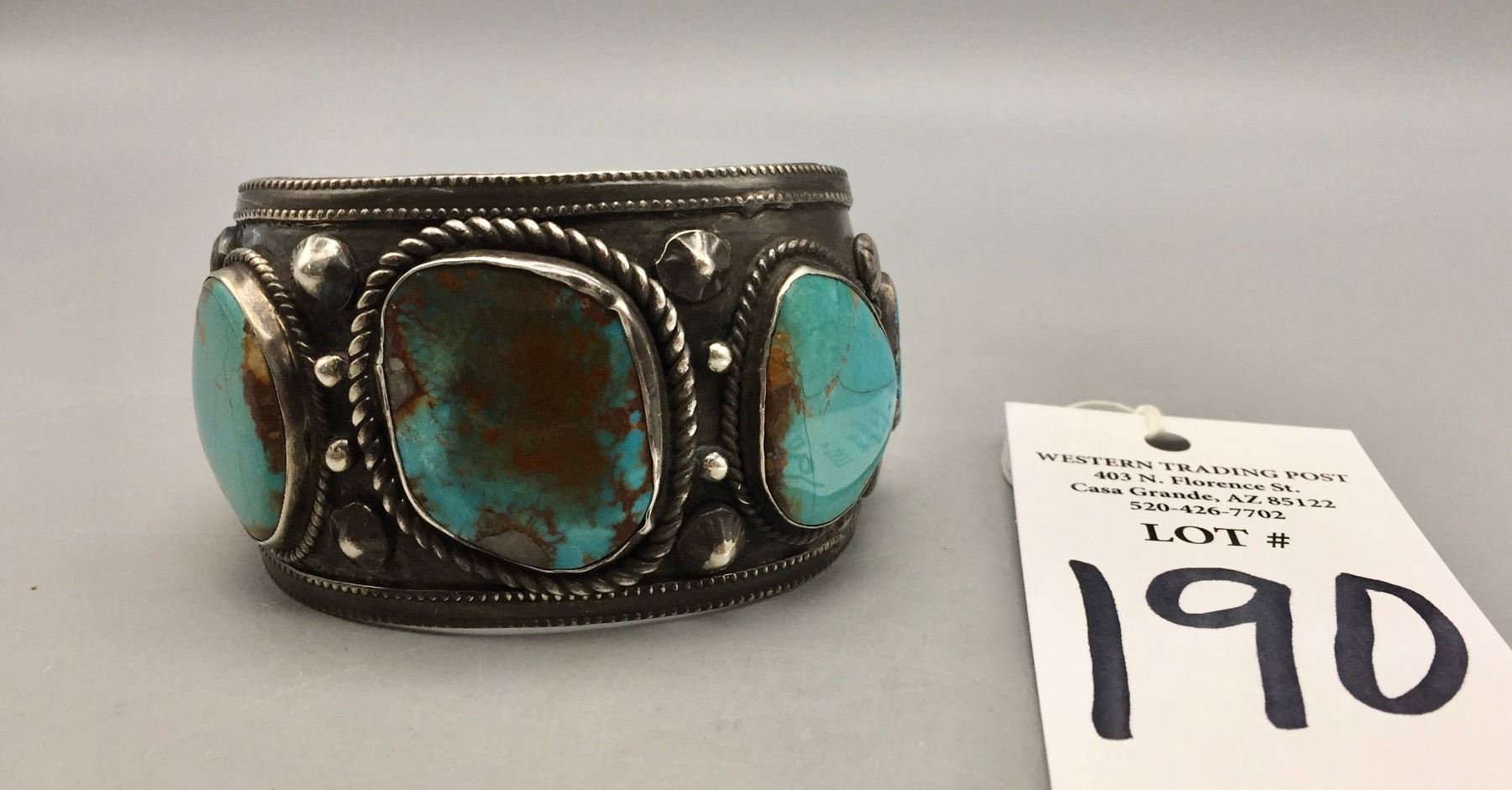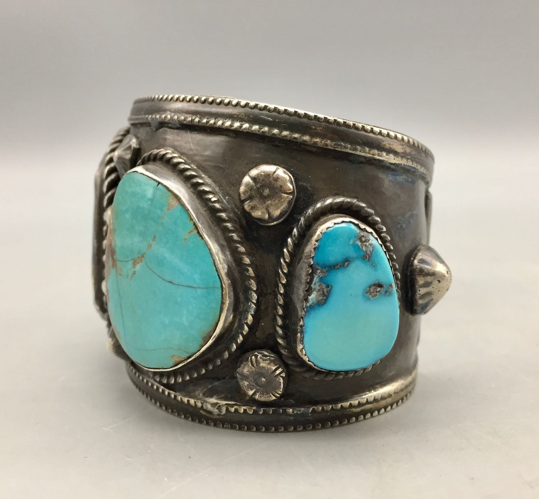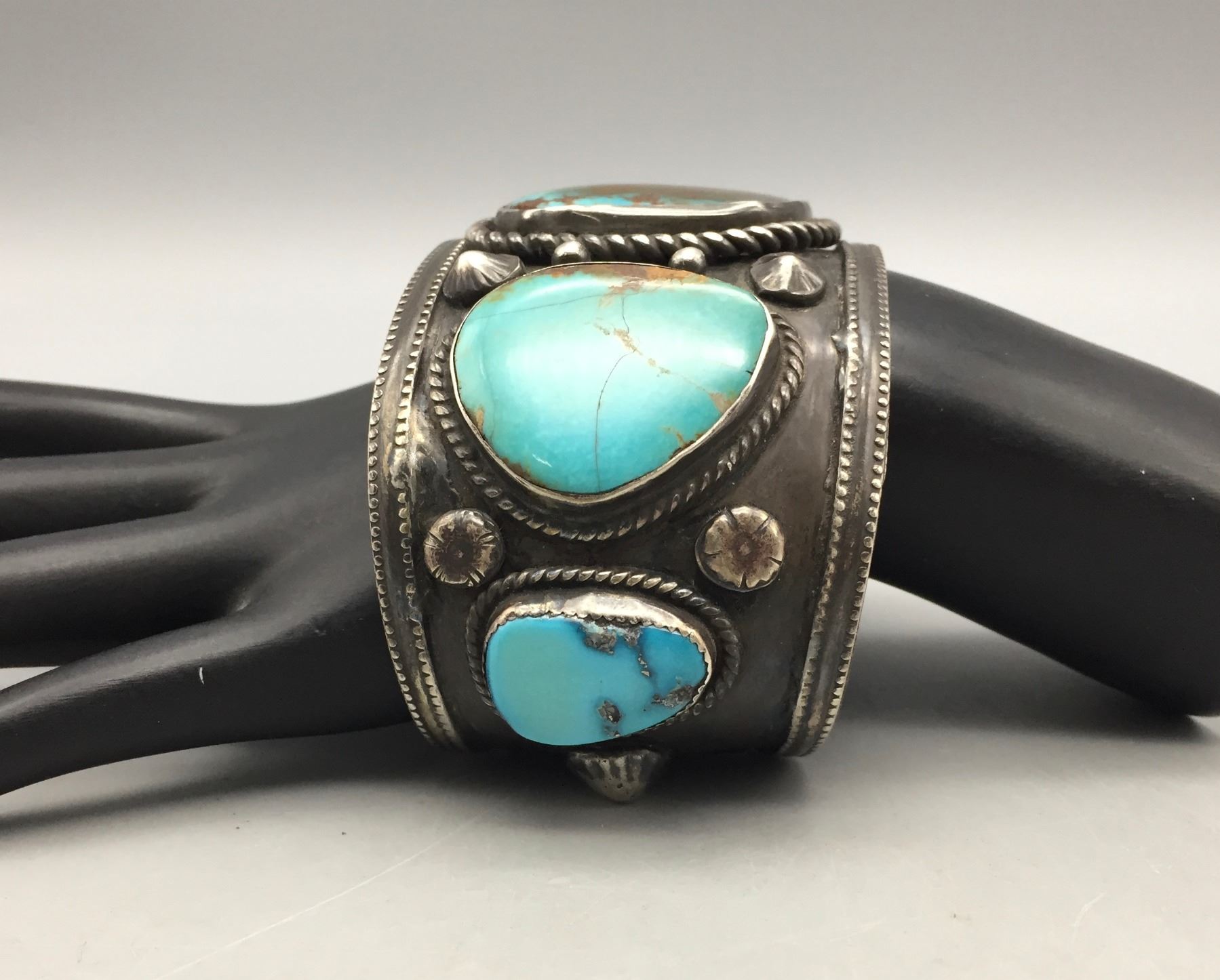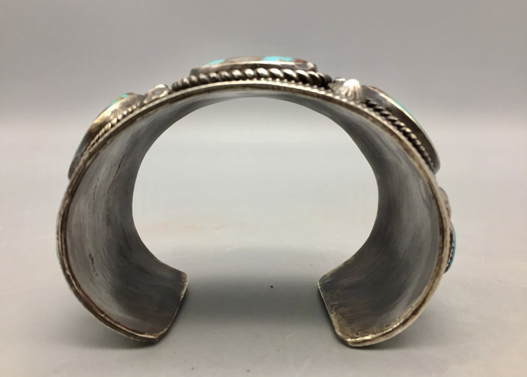 Description: For your collection is a large vintage cuff bracelet, set with five larger turquoise stones. The three stones in the middle have a nice brownish matrix, two of the stones have fine cracks. The two turquoise stones on the ends are a lighter blue color. It is sterling silver. Maker: Unknown. Approx. Age: Vintage. Size: Inside circumference is 7”, additional opening is 1-1/2” (fits a 8-1/2” wrist). 2” wide. Weighs 153.7 grams. Condition: Pretty good for its age, normal wear expected. Please look closely at the pictures - they are an important part of our description. Shipping: There will be a $5 handling / packaging fee for shipping this lot. The actual cost of postage will be added on top of that.