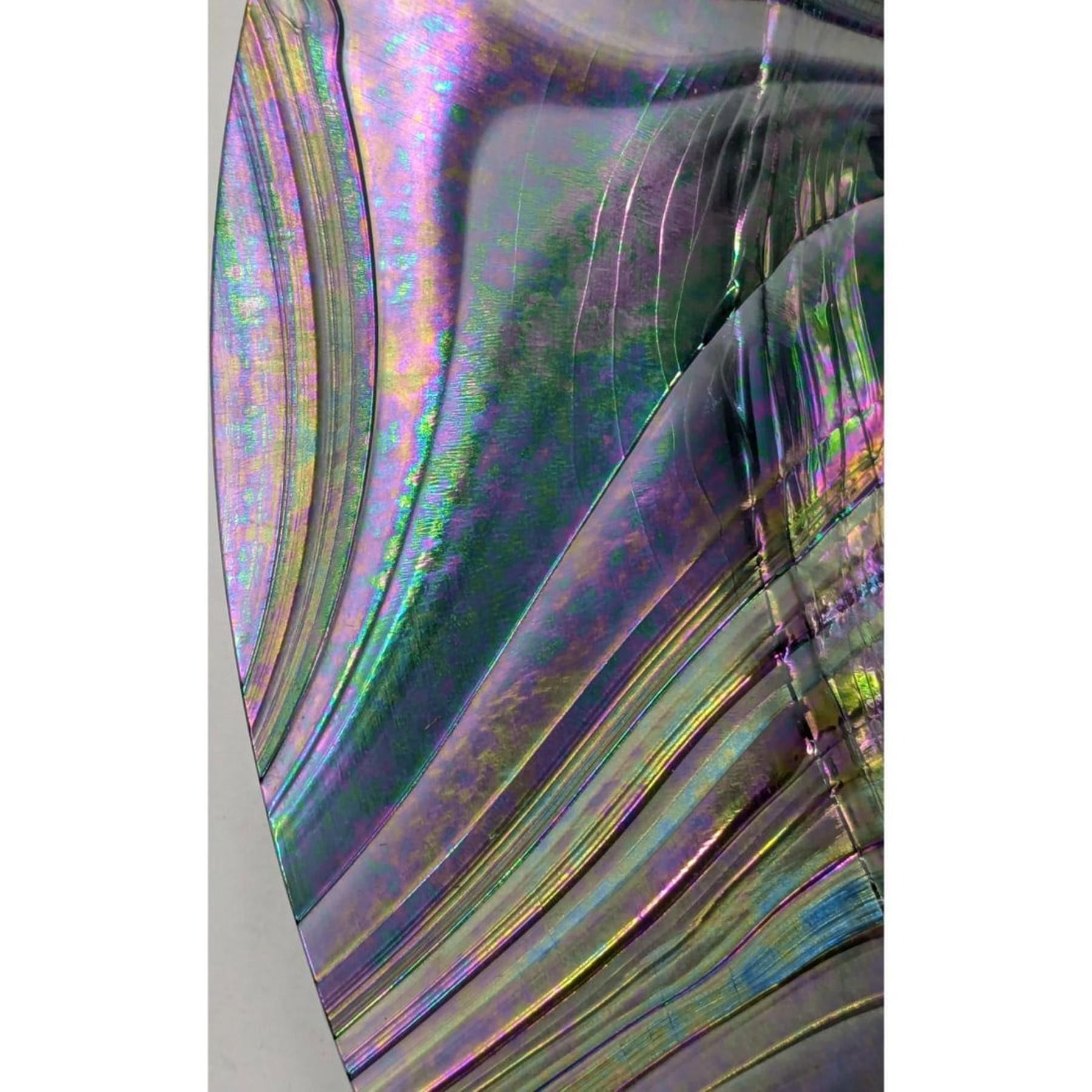 ***RE-LISTED DUE TO BUYER NOT PAYING*** Large Vintage Iridescent And Opalescent Oil Slick Glass Platter With Metal Stand, Stamped On Back. Measures approx. 18" in diameter.