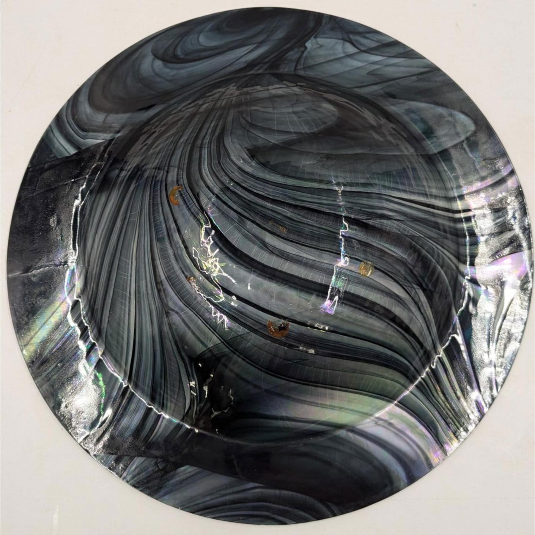 Large Vintage Iridescent And Opalescent Oil Slick Glass Platter With Metal Stand, Stamped On Back