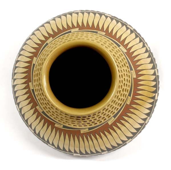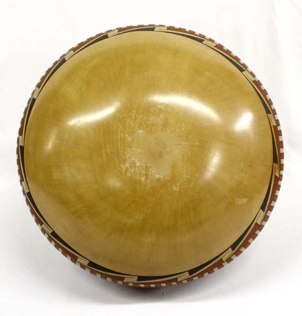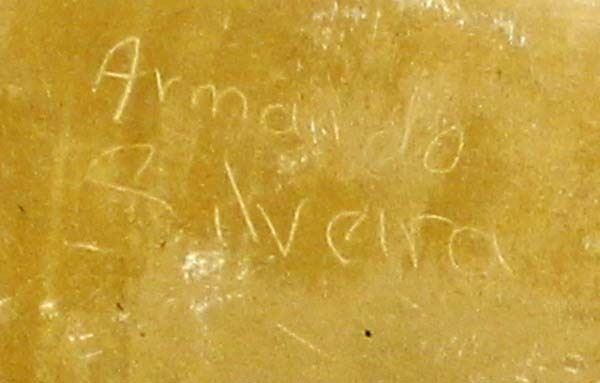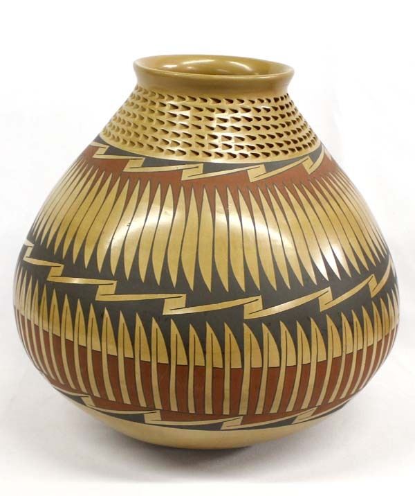Large Vintage Mata Ortiz Polychrome Pottery Olla by Armando Silveira, measures 13'' x 14'', textured neck, stylized feather designs, signed on the bottom