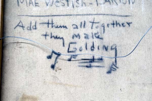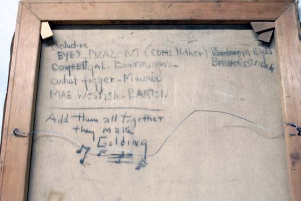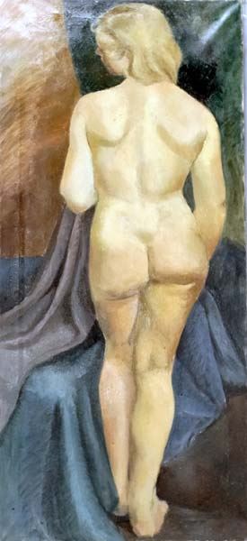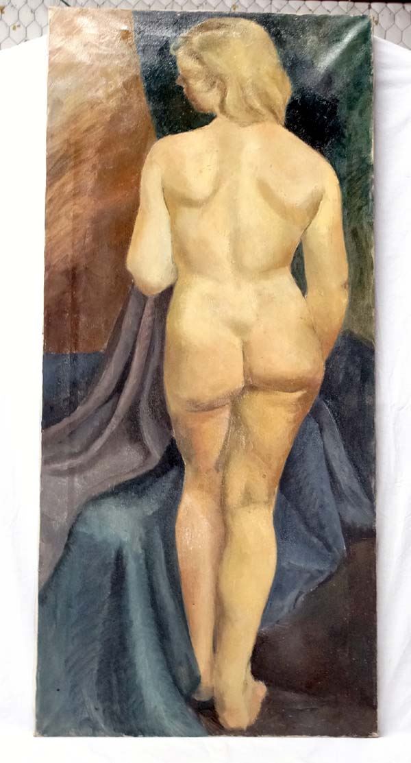 Large Vintage NM Estate Original Nude on Canvas, measures 44''L x 20''W, back of canvas reads ''seductive EYES_ PIZAZ M (COME hither) Eyes Breakfast nook coyEEst GAL. Brannigan_ cutist figger-Maurier MAE Westish-Barton Add them all together they make Golding''
