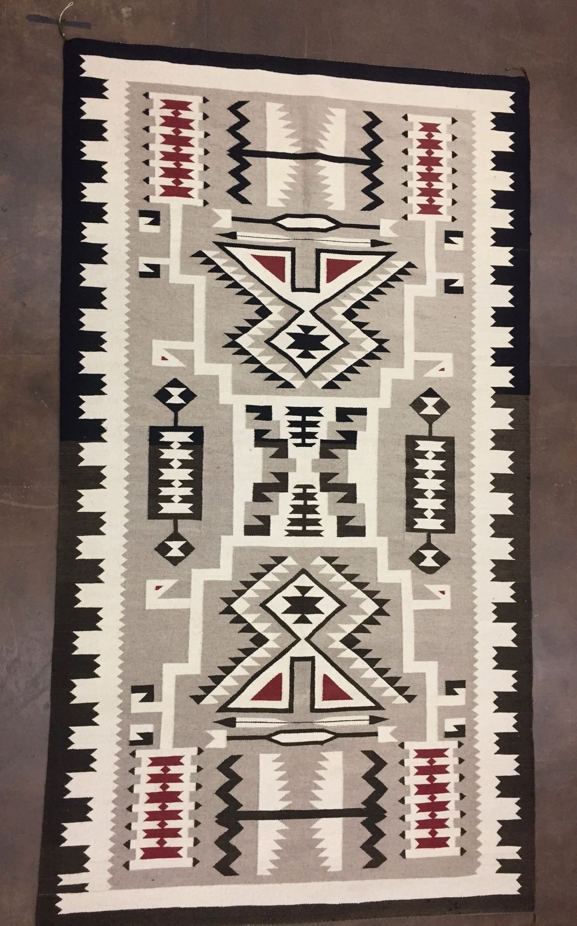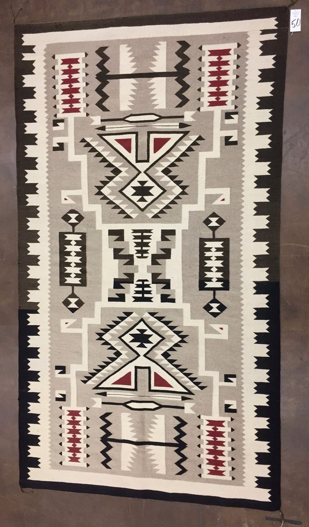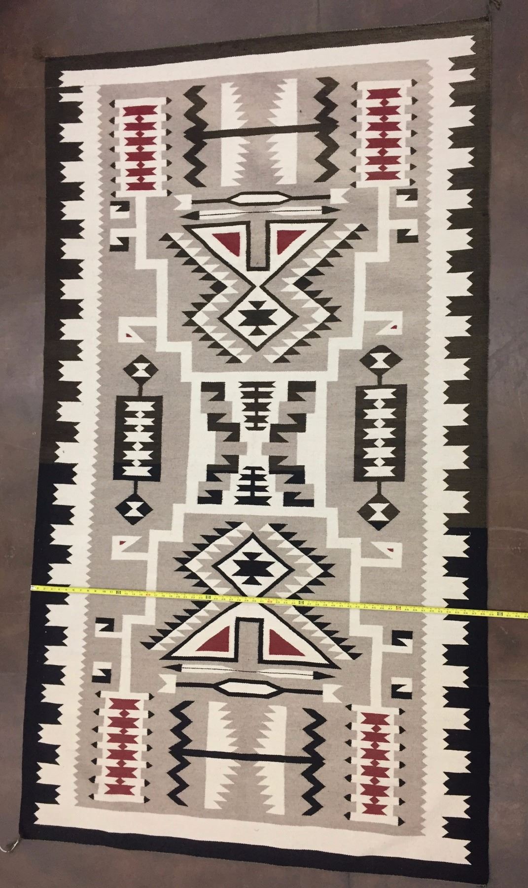 Maker: Unknown Navajo Weaver. Approx. Age: Vintage. (Circa mid-century). Size: Measures 58 1/2” w x 104” l. Additional Info: Very nice, large, vintage Navajo Storm Pattern rug. Hand spun and hand-dyed. Condition: Good for its age. Normal wear expected. Please note differences in dye color where the changed batches. Please look closely at the pictures - they are an important part of our description. Shipping: There will be a $7 handling / packaging fee for shipping this lot. The actual cost of postage will be added on top of that.