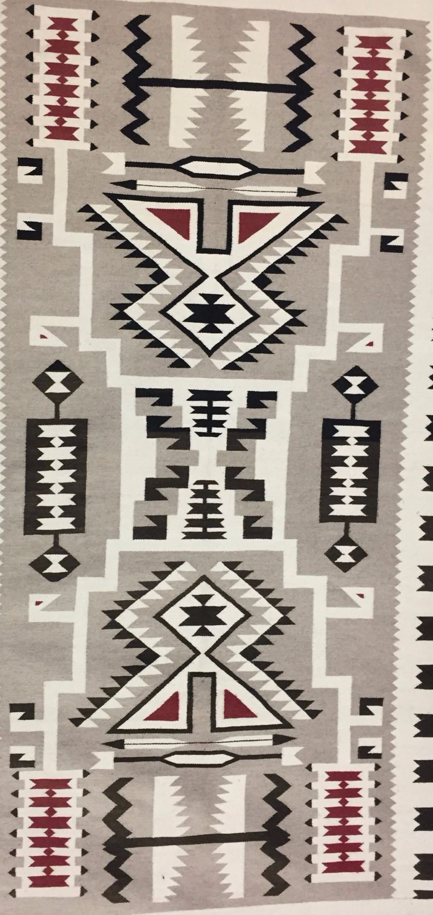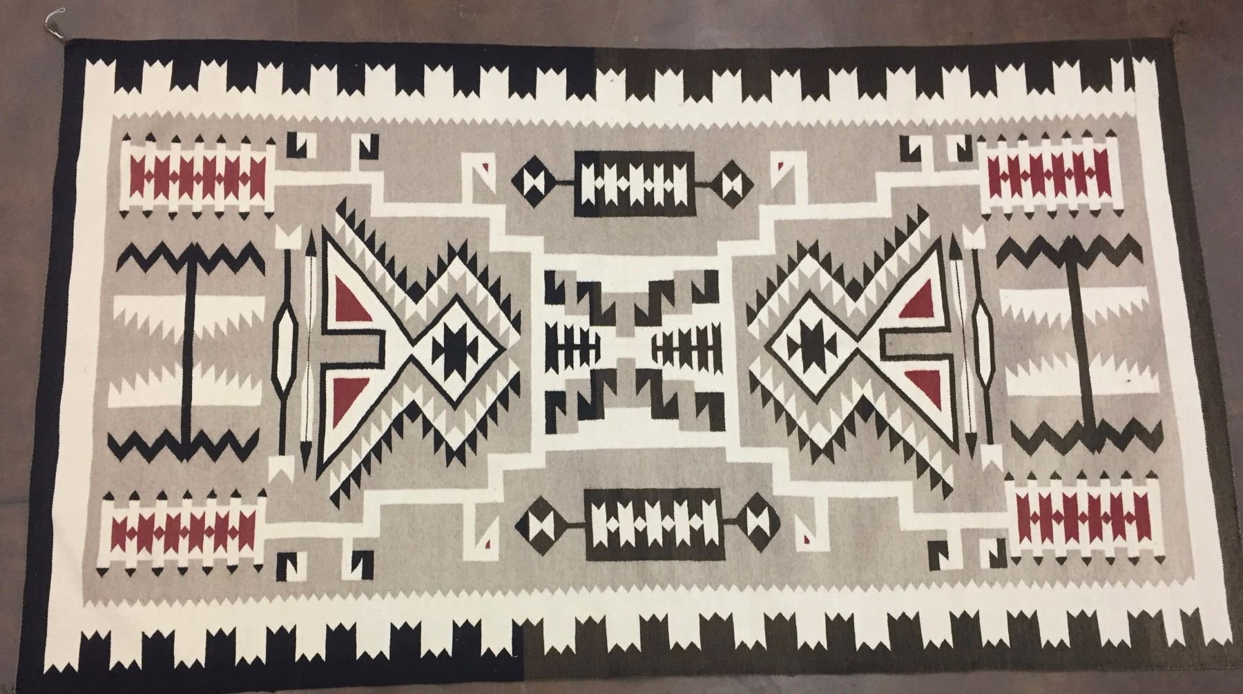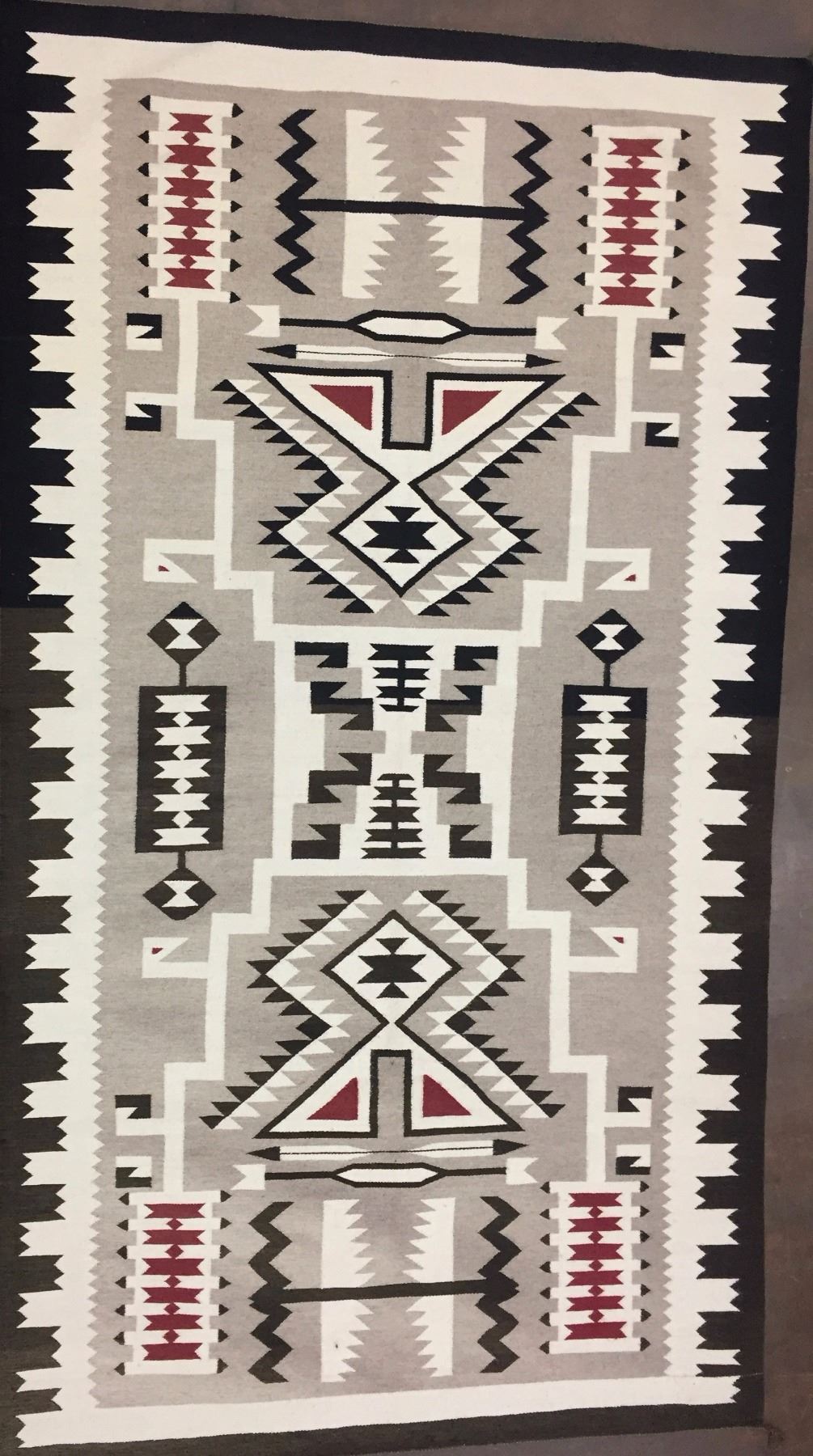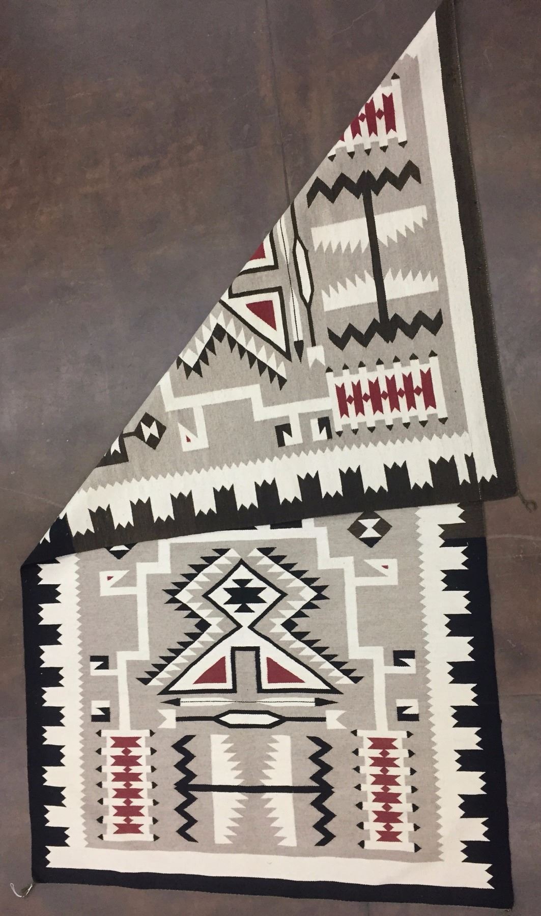 Maker: Unknown Navajo Weaver. Approx. Age: Vintage. (Circa mid-century). Size: Measures 58 1/2” w x 104” l. Additional Info: Very nice, large, vintage Navajo Storm Pattern rug. Hand spun and hand-dyed. Condition: Good for its age. Normal wear expected. Please note differences in dye color where the changed batches. Please look closely at the pictures - they are an important part of our description. Shipping: There will be a $7 handling / packaging fee for shipping this lot. The actual cost of postage will be added on top of that.