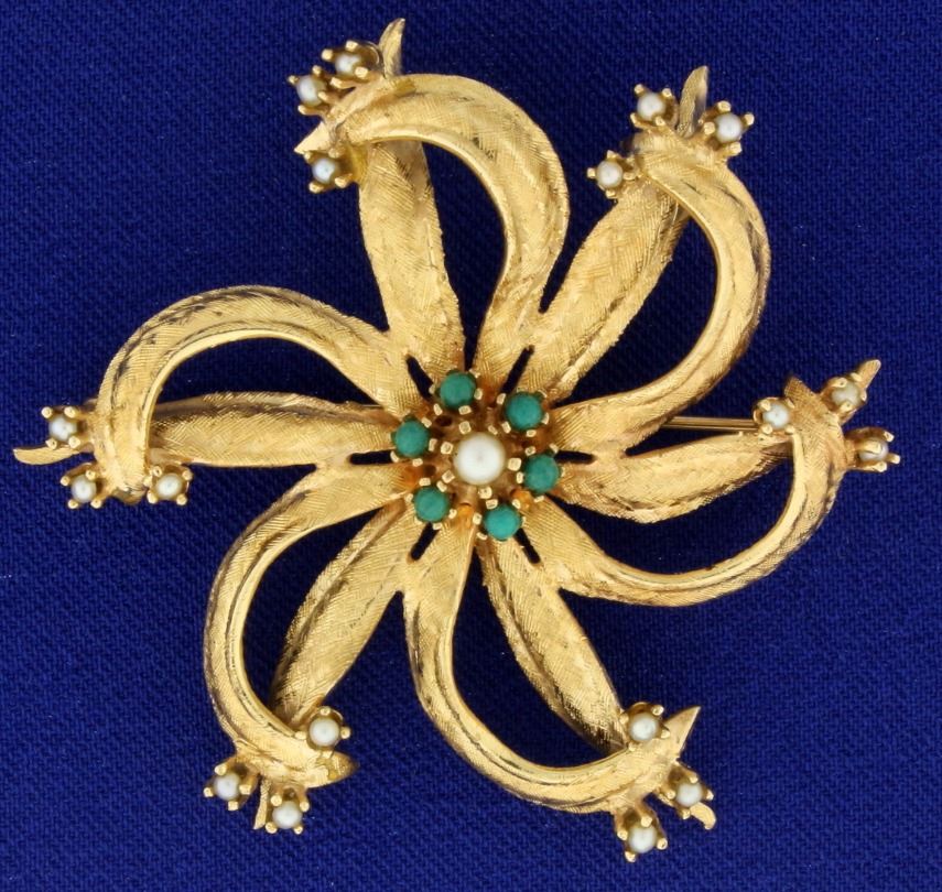 In 14k yellow gold, containing a center 3mm pearl surrounded by six 3mm painted seed pearls. Also contains three 2mm seed pearls on the end of each of the six petals. 13.9.g