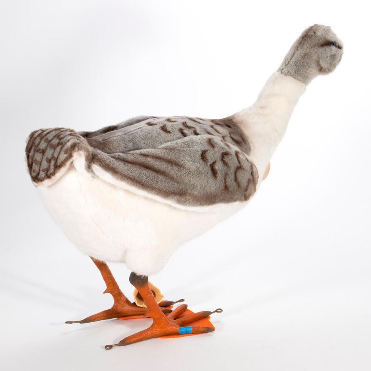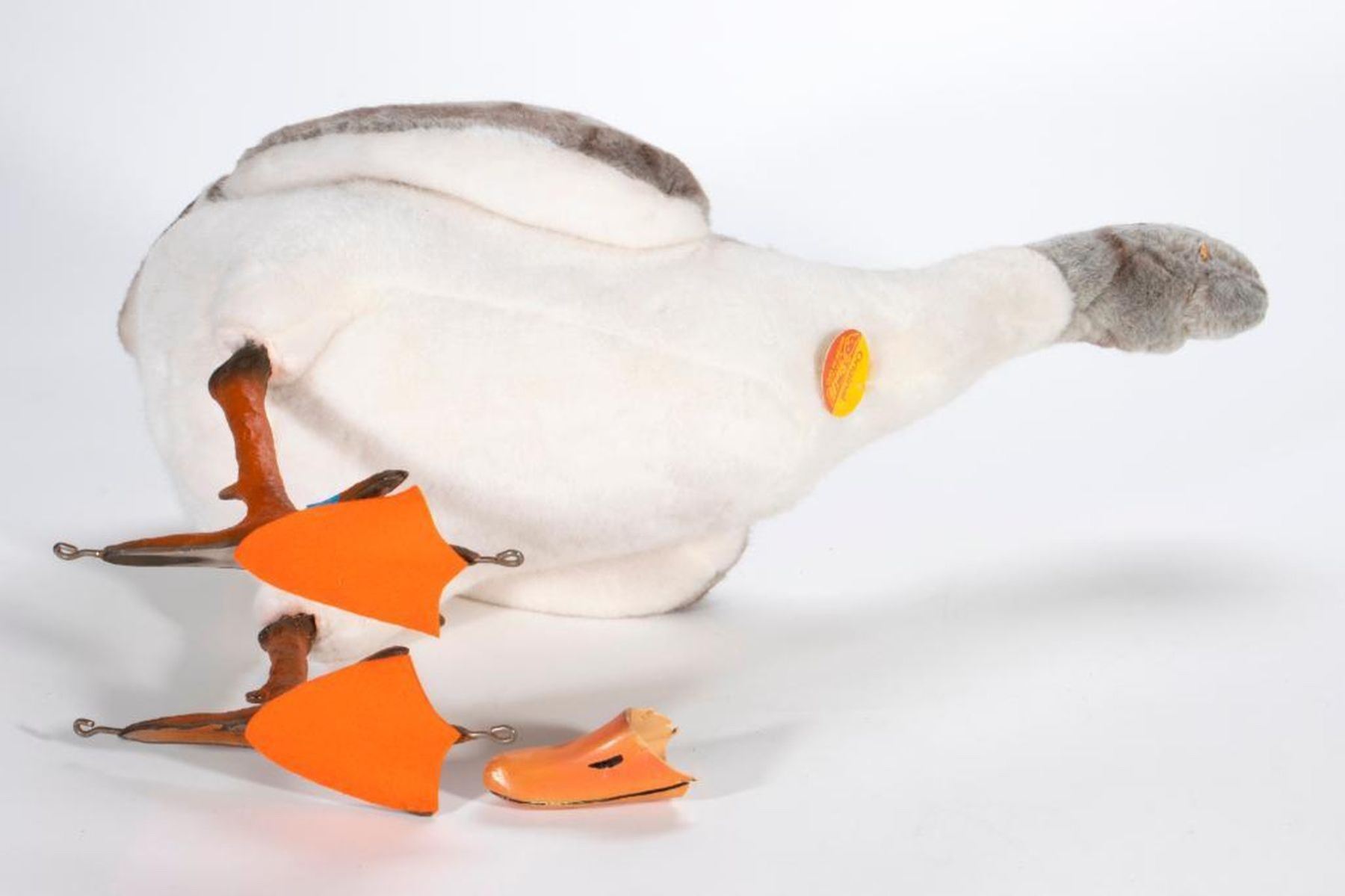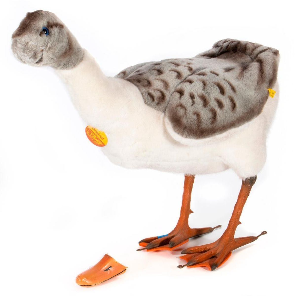 Large vintage Steiff Goose Original FAO Schwarz store display. Retains original tag and button. The beak needs to be re-attached, has a broken toe. Measurement at largest 25 inches.