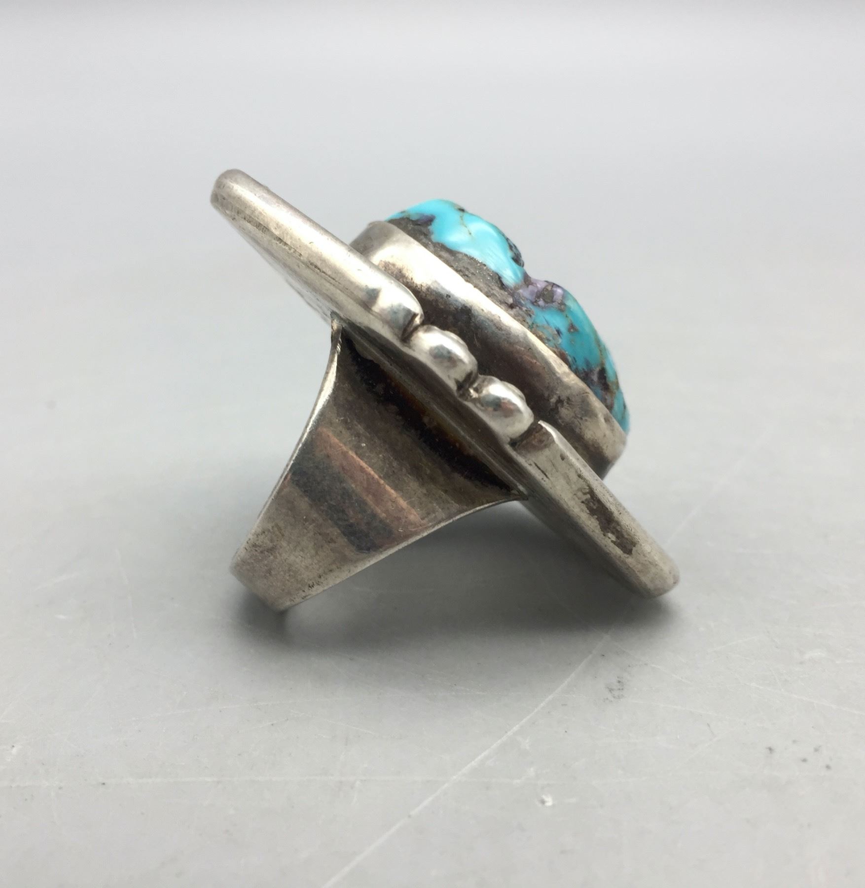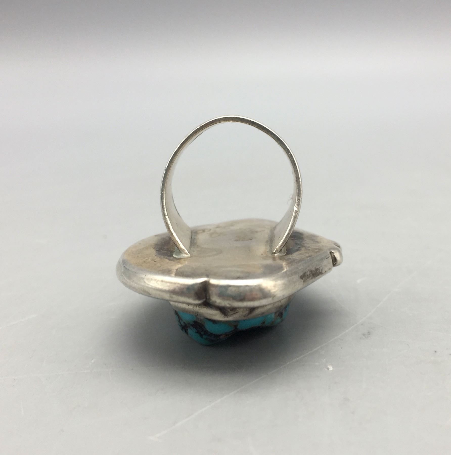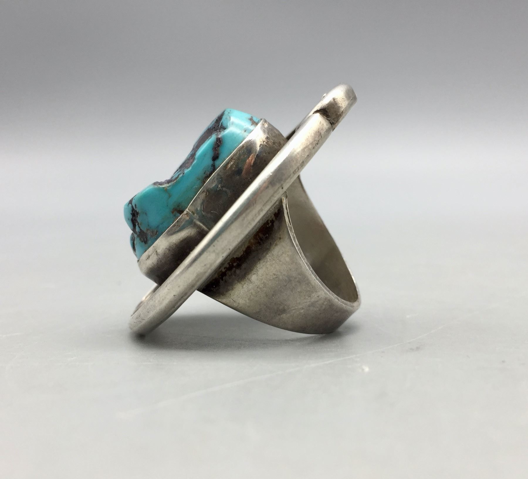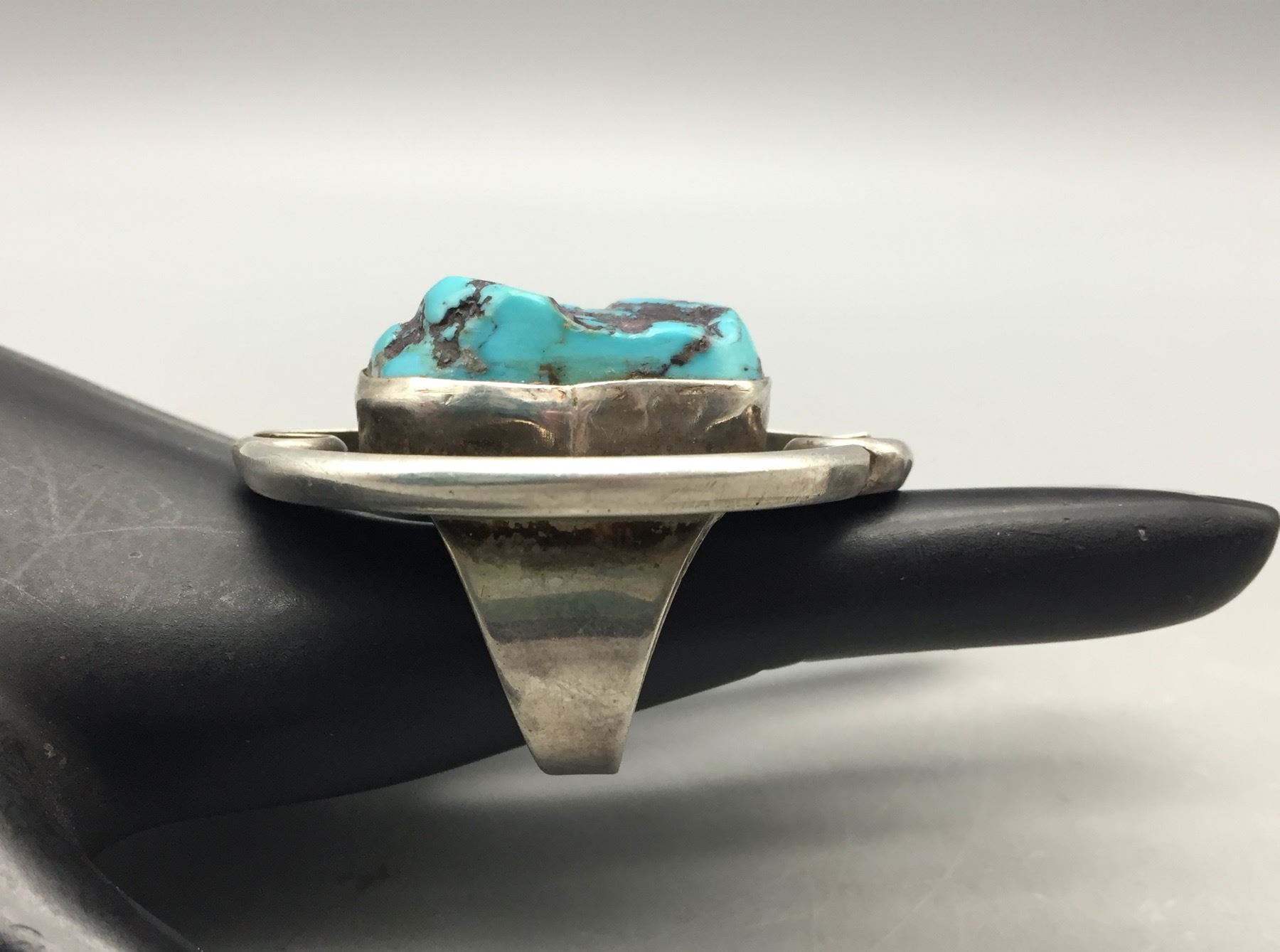 Description: For sale in this lot is a beautiful, vintage turquoise ring set with a large turquoise nugget. Although simple silver work, it is a statement kind of ring. Sterling silver. Maker: Unknown. Approx. Age: Vintage. Size: Size 9. 2†long X 1-5/8†wide. Weighs 30.3 grams. Condition: Good for its age, normal wear expected. Please look closely at the pictures - they are an important part of our description. Shipping: There will be a $5 handling / packaging fee for shipping this lot. The actual cost of postage will be added on top of that.
