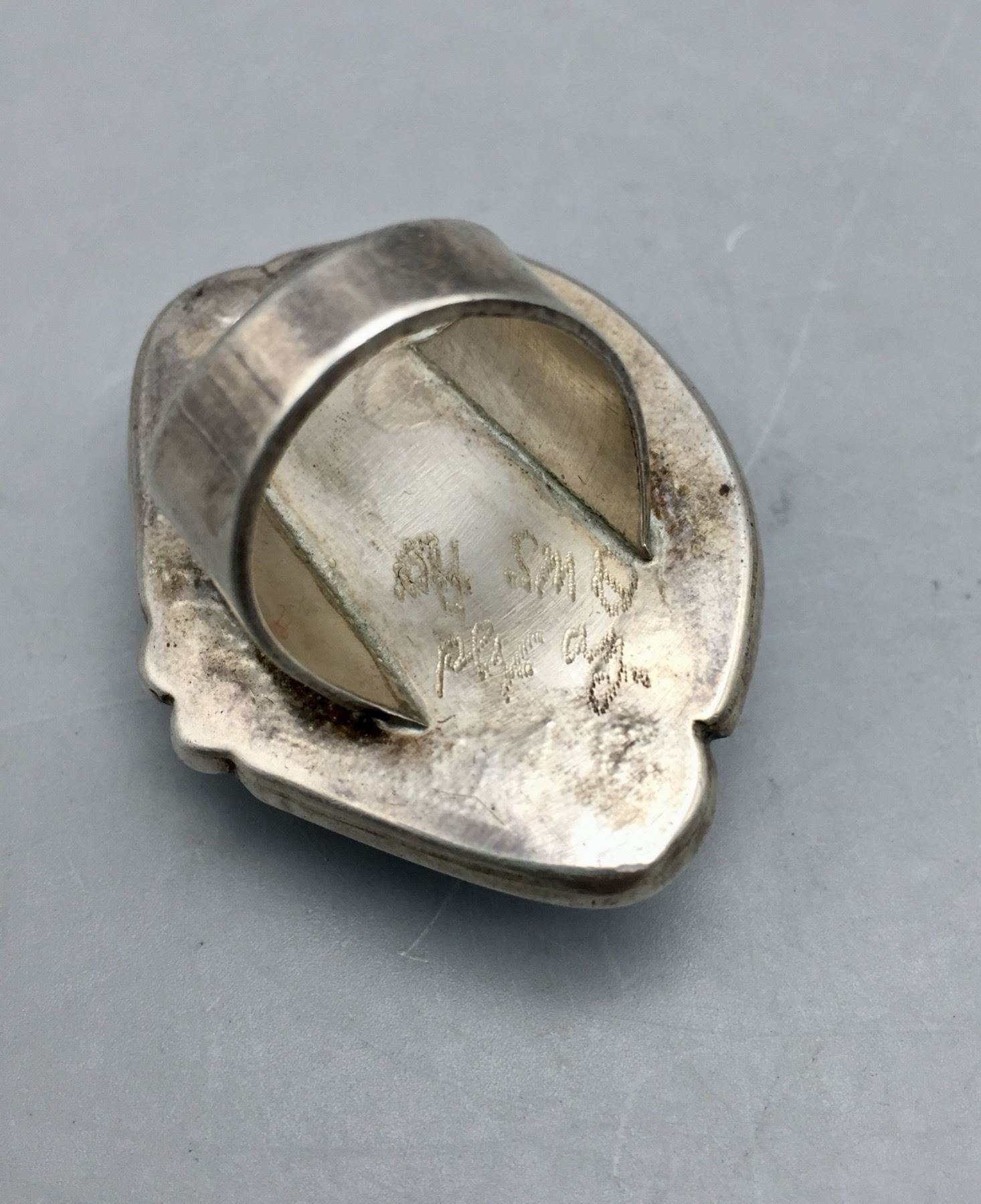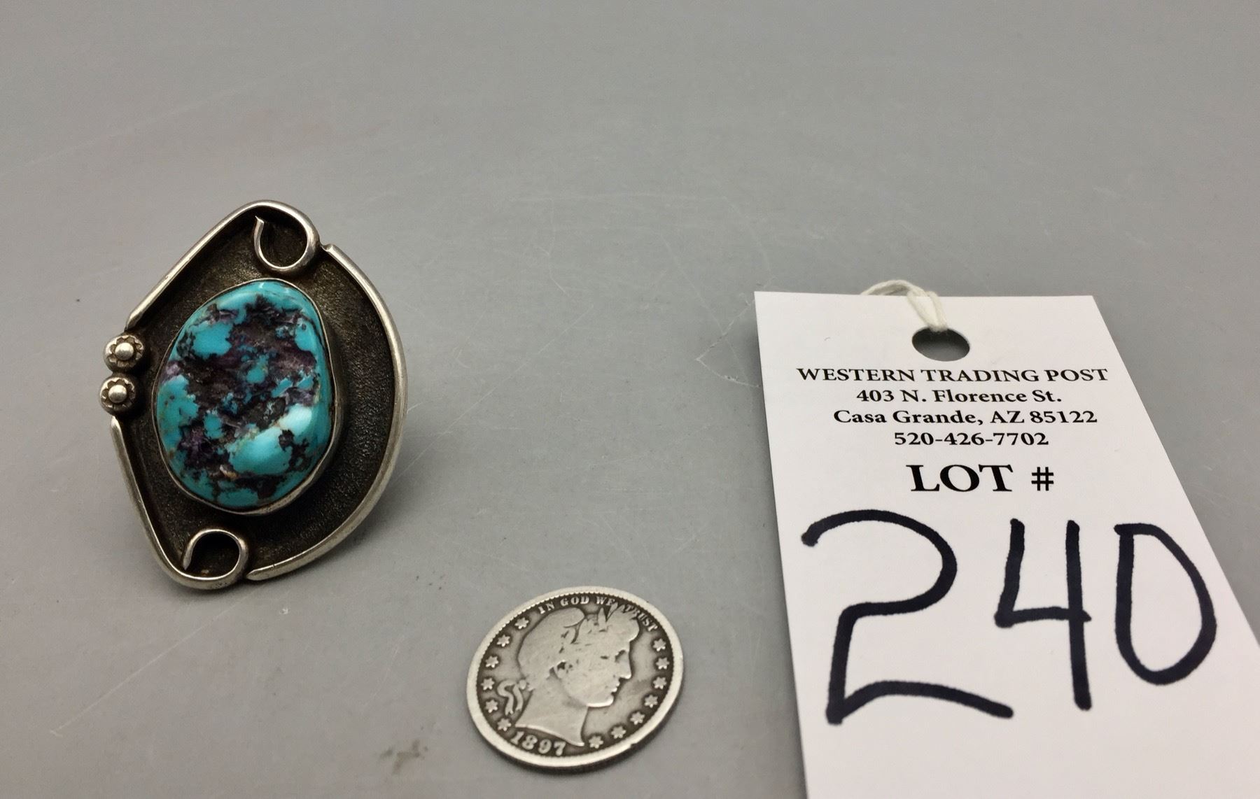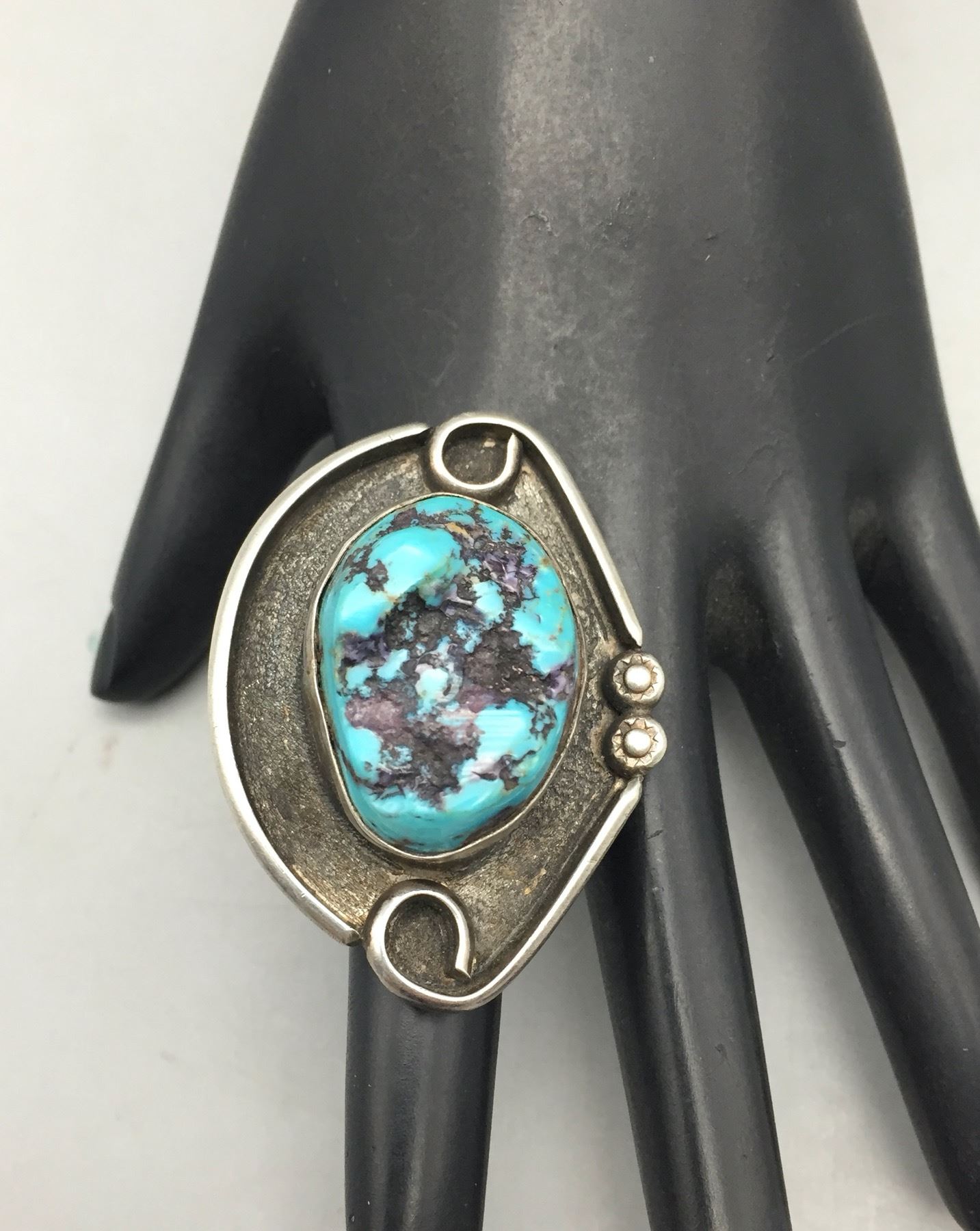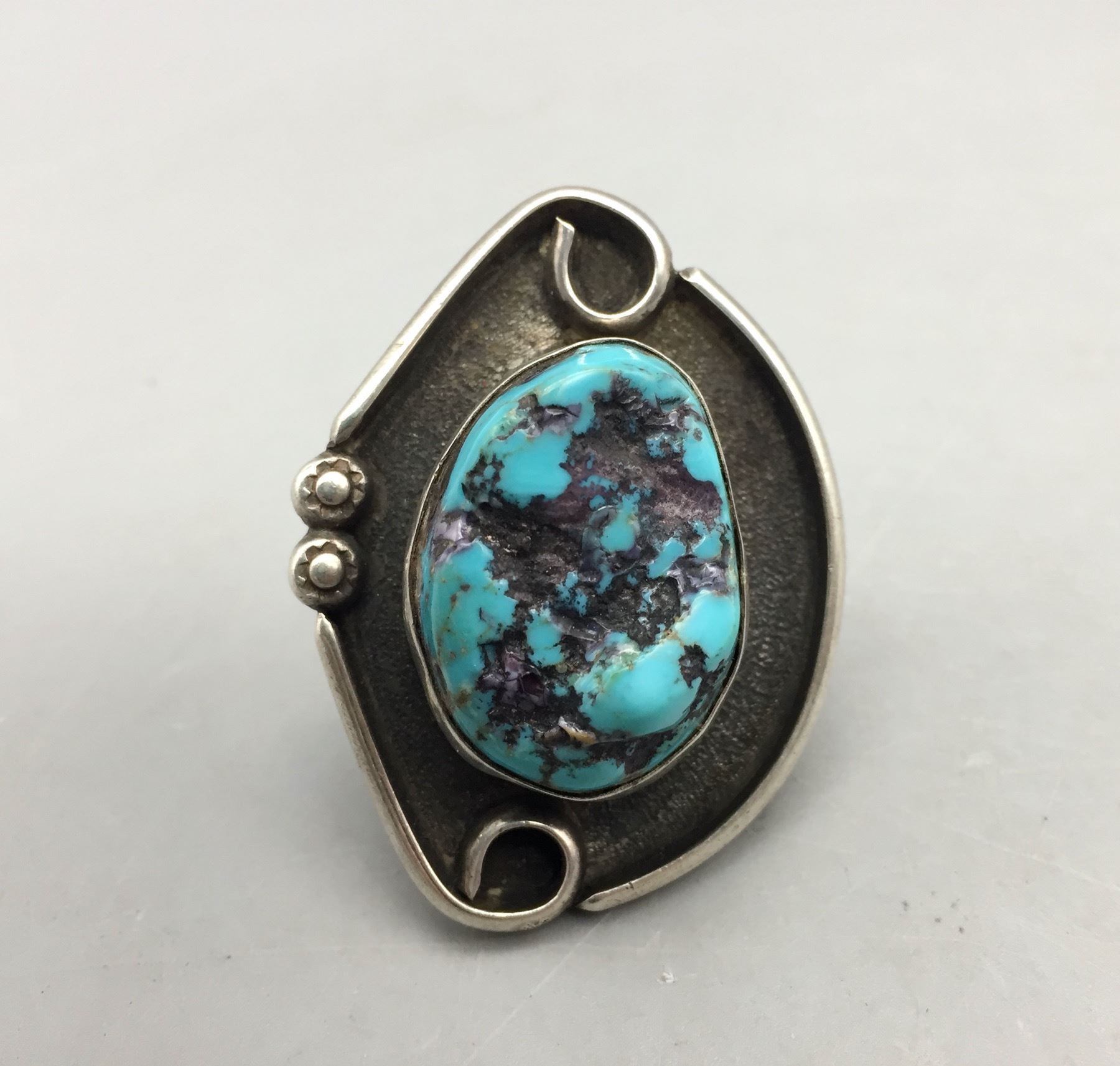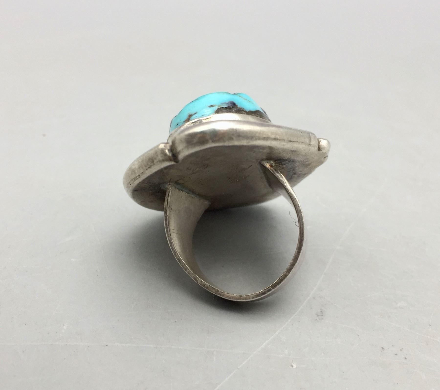 Description: For sale in this lot is a beautiful, vintage turquoise ring set with a large turquoise nugget. Although simple silver work, it is a statement kind of ring. Sterling silver. Maker: Unknown. Approx. Age: Vintage. Size: Size 9. 2†long X 1-5/8†wide. Weighs 30.3 grams. Condition: Good for its age, normal wear expected. Please look closely at the pictures - they are an important part of our description. Shipping: There will be a $5 handling / packaging fee for shipping this lot. The actual cost of postage will be added on top of that.