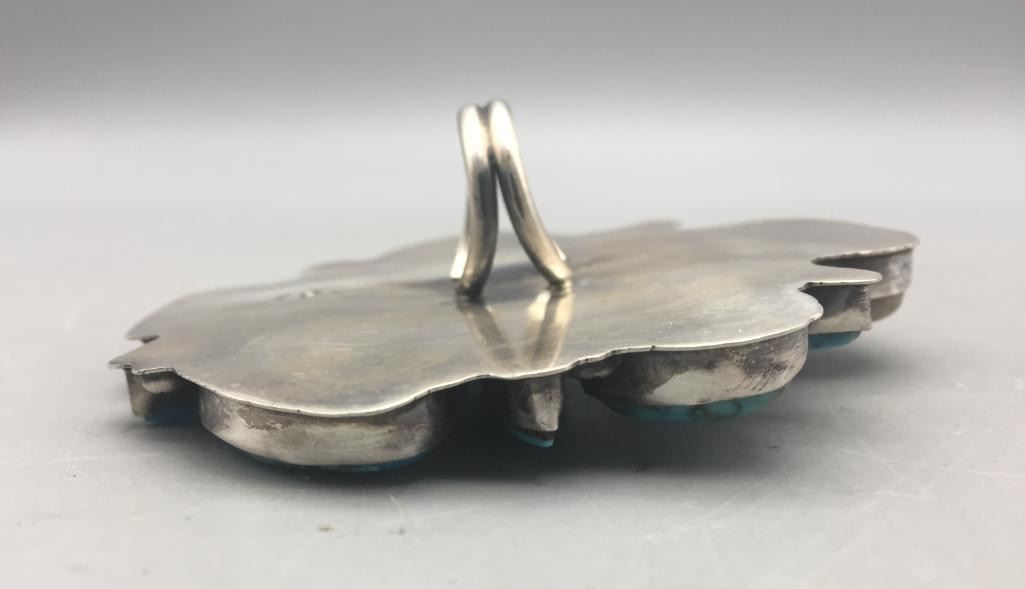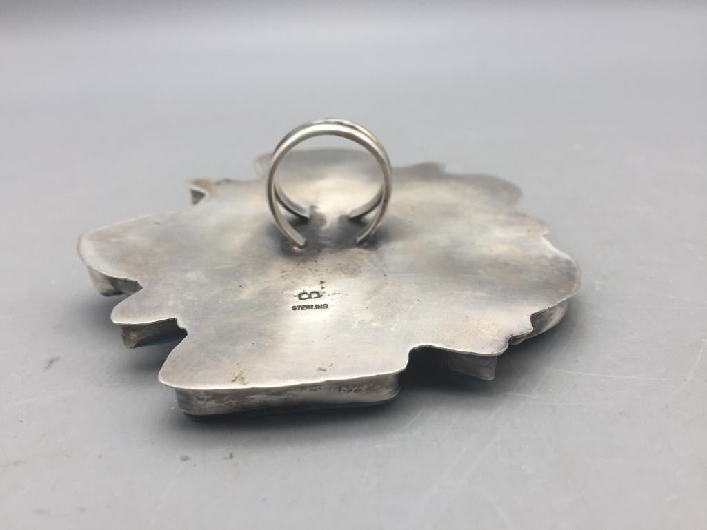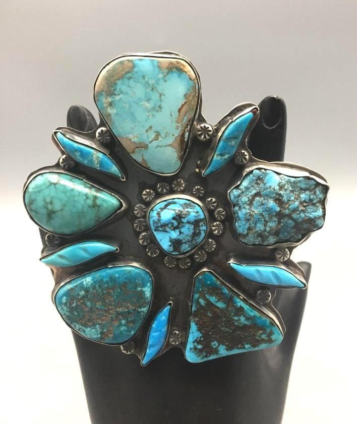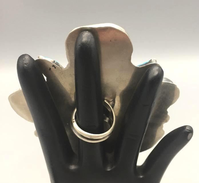 Presented for sale in this lot is an "OMG is that really a ring," vintage style turquoise ring featuring 11 different turquoise stones with sterling silver accents. Take a look! Maker: Hallmarked with a B. Approx. Age: Fairly modern. Size: 8. Ring is 3-1/2" long and weighs 72.8 grams. Condition: Good for its age, normal wear expected. Please look closely at the pictures - they are an important part of our description. Shipping: There will be a $5 handling, packaging fee for shipping this lot. The actual cost of postage will be added on top of that.