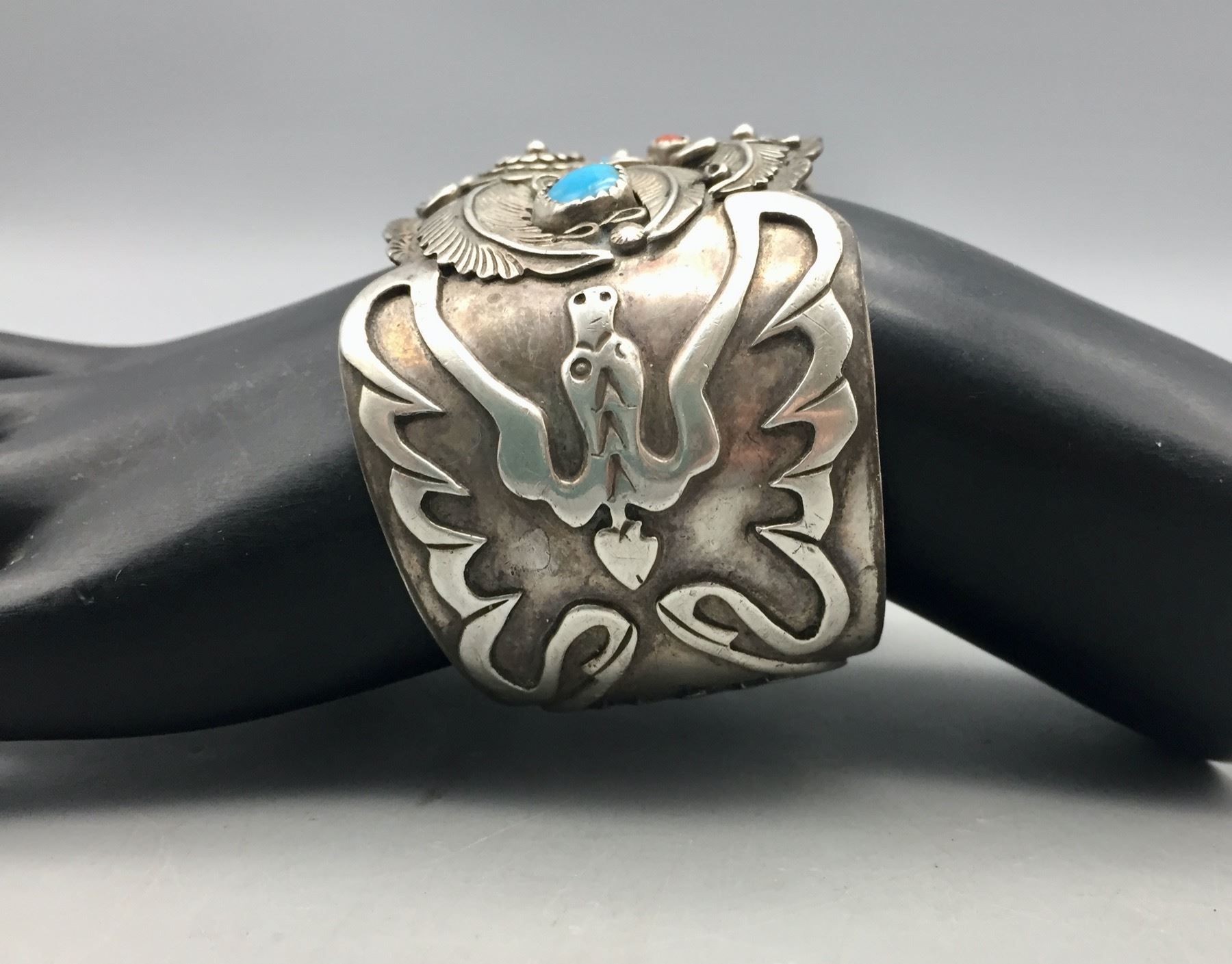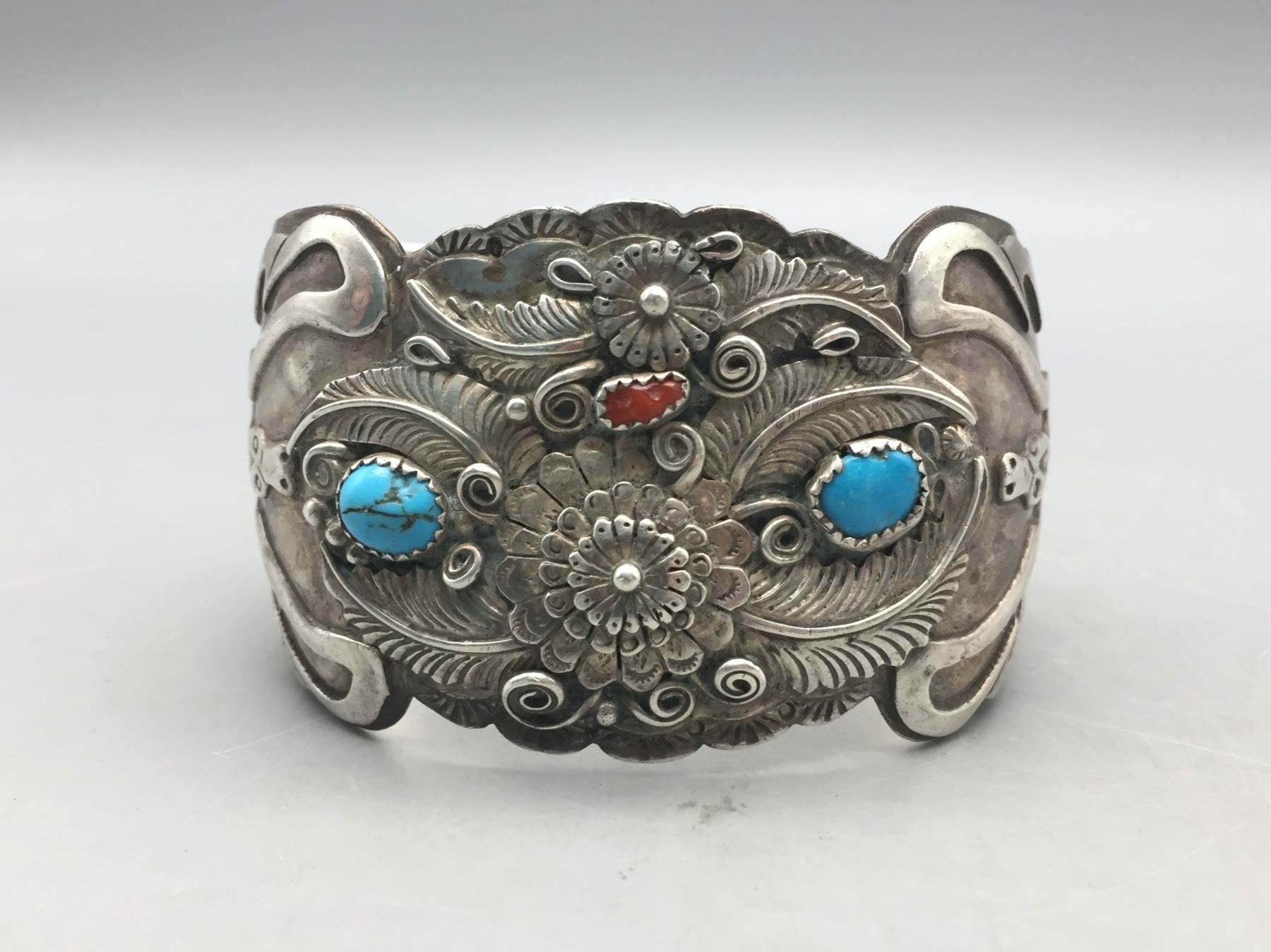 Description: Offered for sale in this lot we have a large vintage turquoise and coral bracelet featuring an intricate water bird design with lots of floral appliqué. Marked as sterling silver.                                                                                                            Maker: Hallmarked HC.                                                                                                                 Approx. Age: Vintage.                                                                                                            Size: Inside circumference measures 6 inches. Opening is an additional 1-3/8 inches, fitting a 7-3/8 inch wrist. Width is 1-3/4 inches. Weighs 86.5 grams.                                                                                                                                                                                                                                 Condition: Good for its age, normal wear expected.                                                                                                                Please look closely at the pictures - they are an important part of our description.                                Shipping: There will be a $5 handling, packaging fee for shipping this lot. The actual cost of postage will be added on top of that.