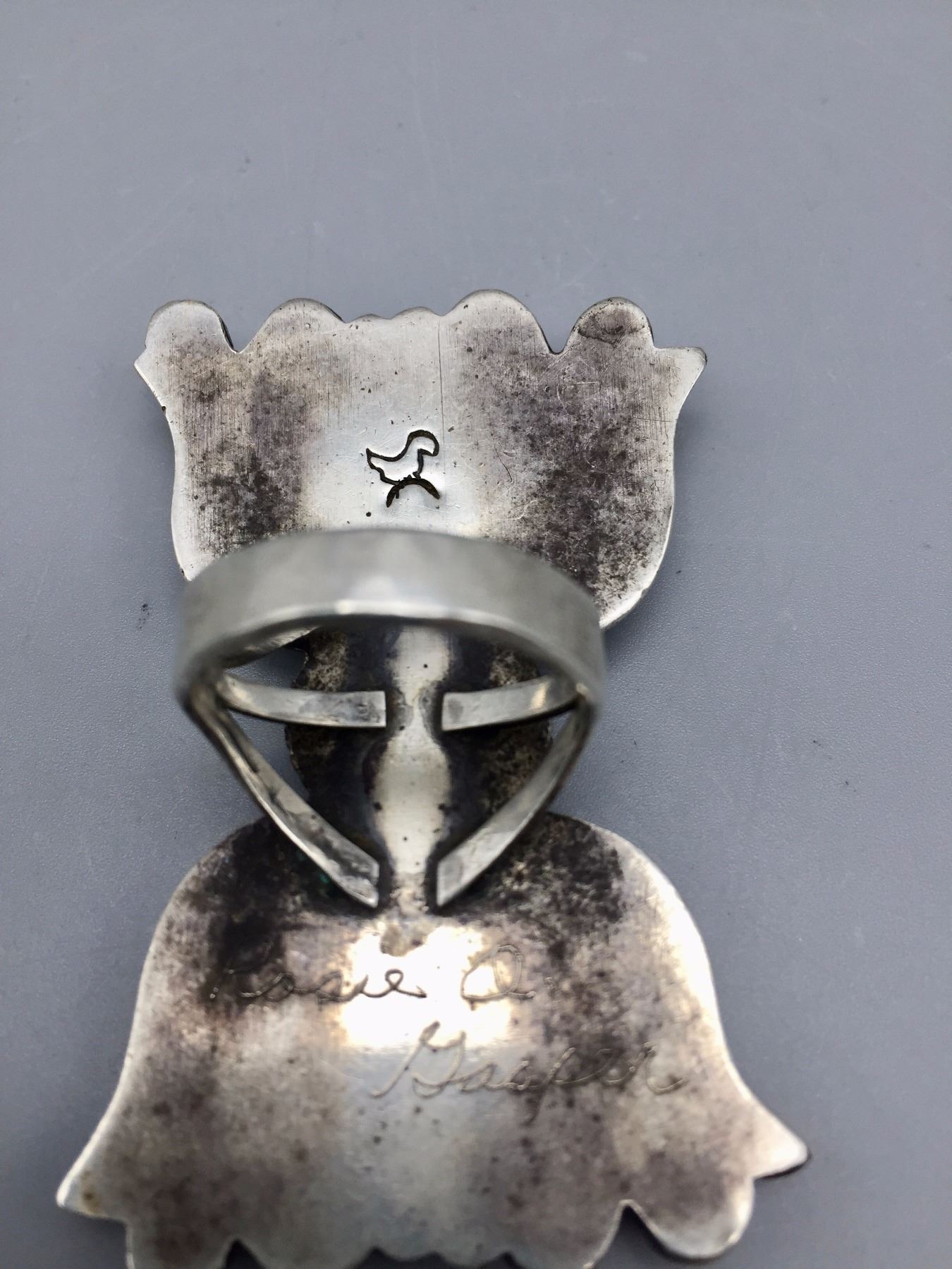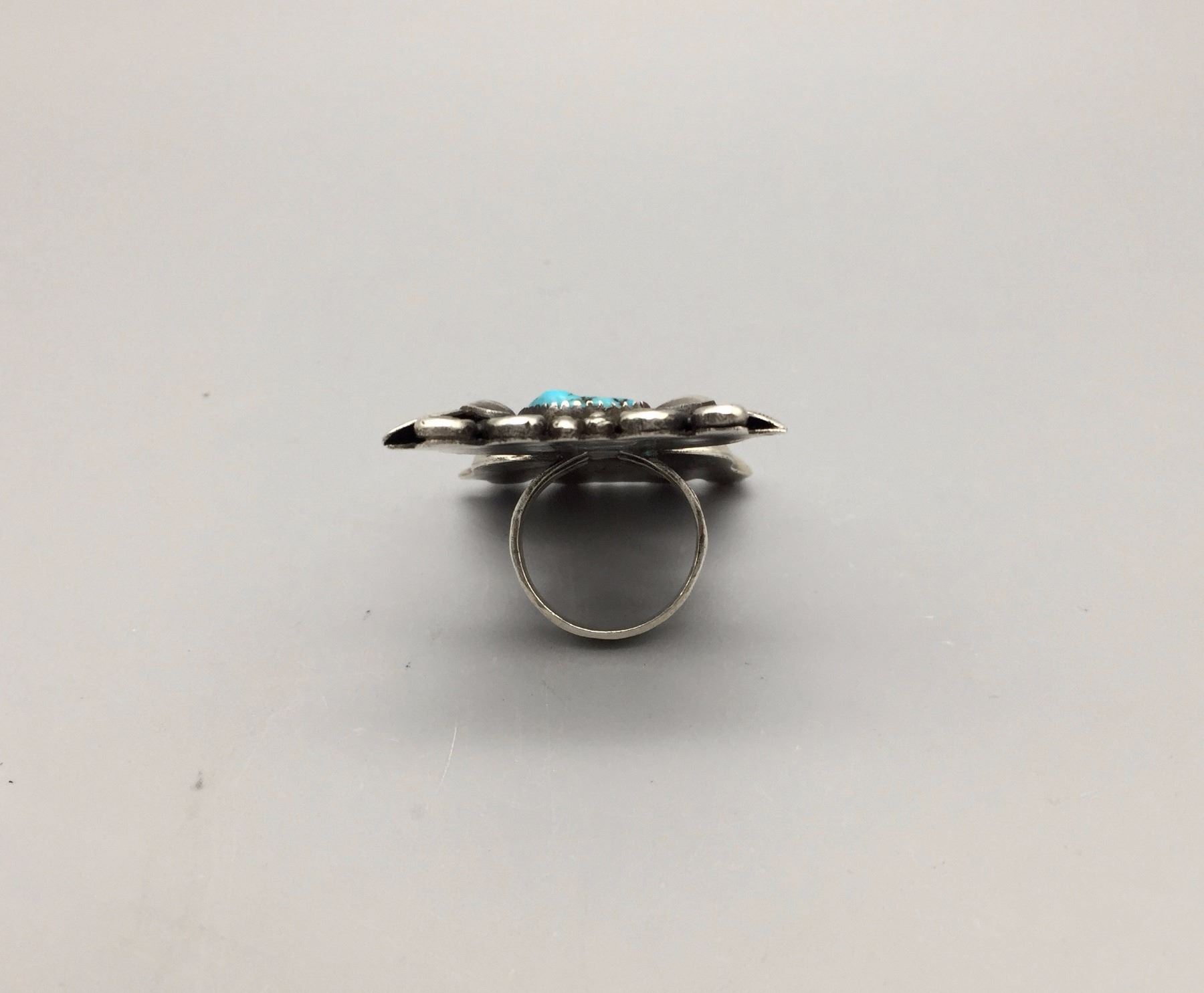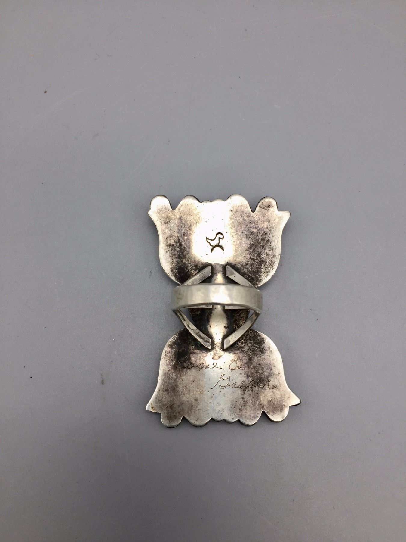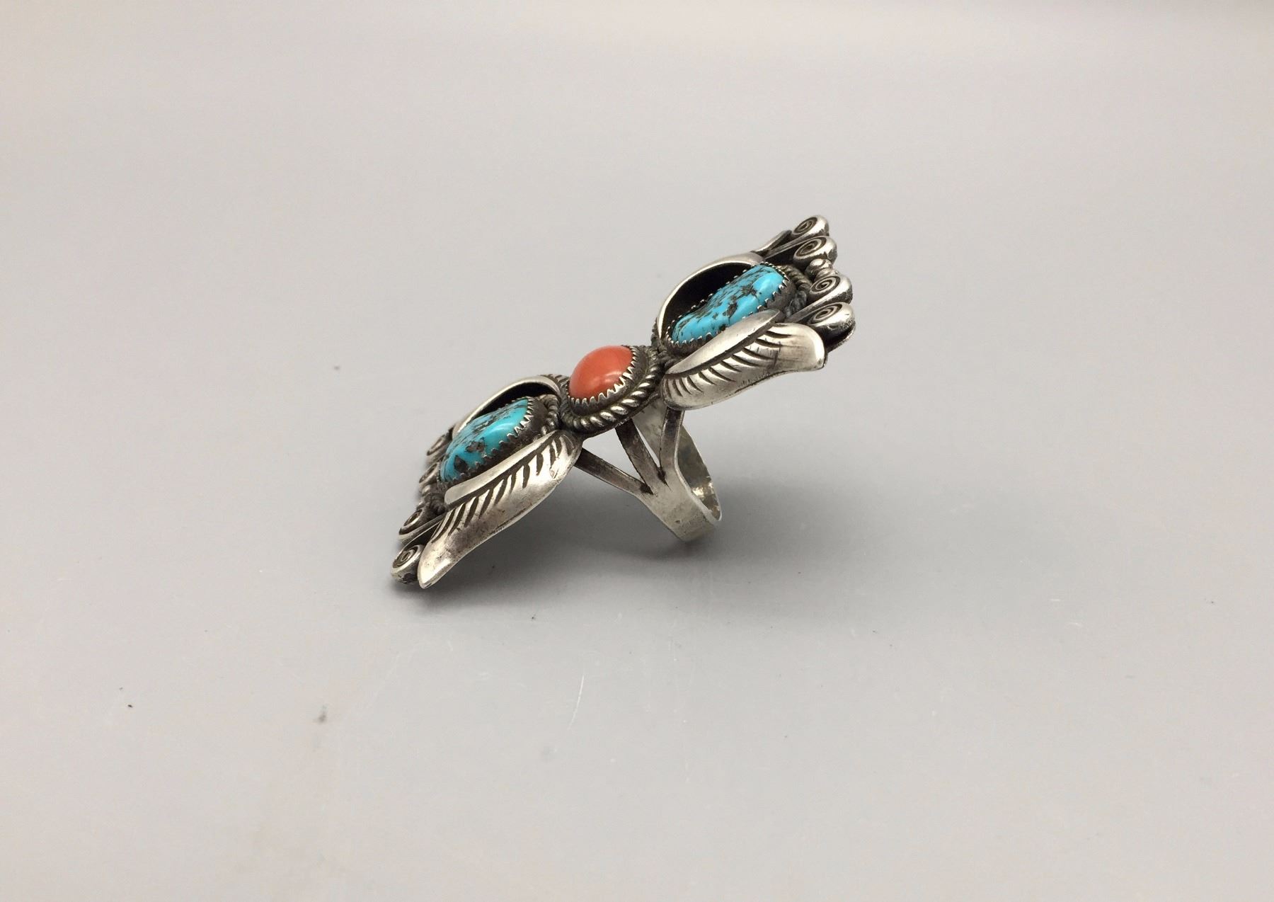Description: A large, STATEMENT, hand embellished, sterling silver ring with two turquoise and one coral cabochon. Maker: Rosie Gasper, Zuni. Approx. Age: Vintage, circa 1970s. Size: Sz 9.5 and weighs 28.8 g. Condition: Good for its age, normal wear expected. Please look closely at the pictures - they are an important part of our description. Shipping: There will be a $5 handling / packaging fee for shipping this lot. The actual cost of postage will be added on top of that.