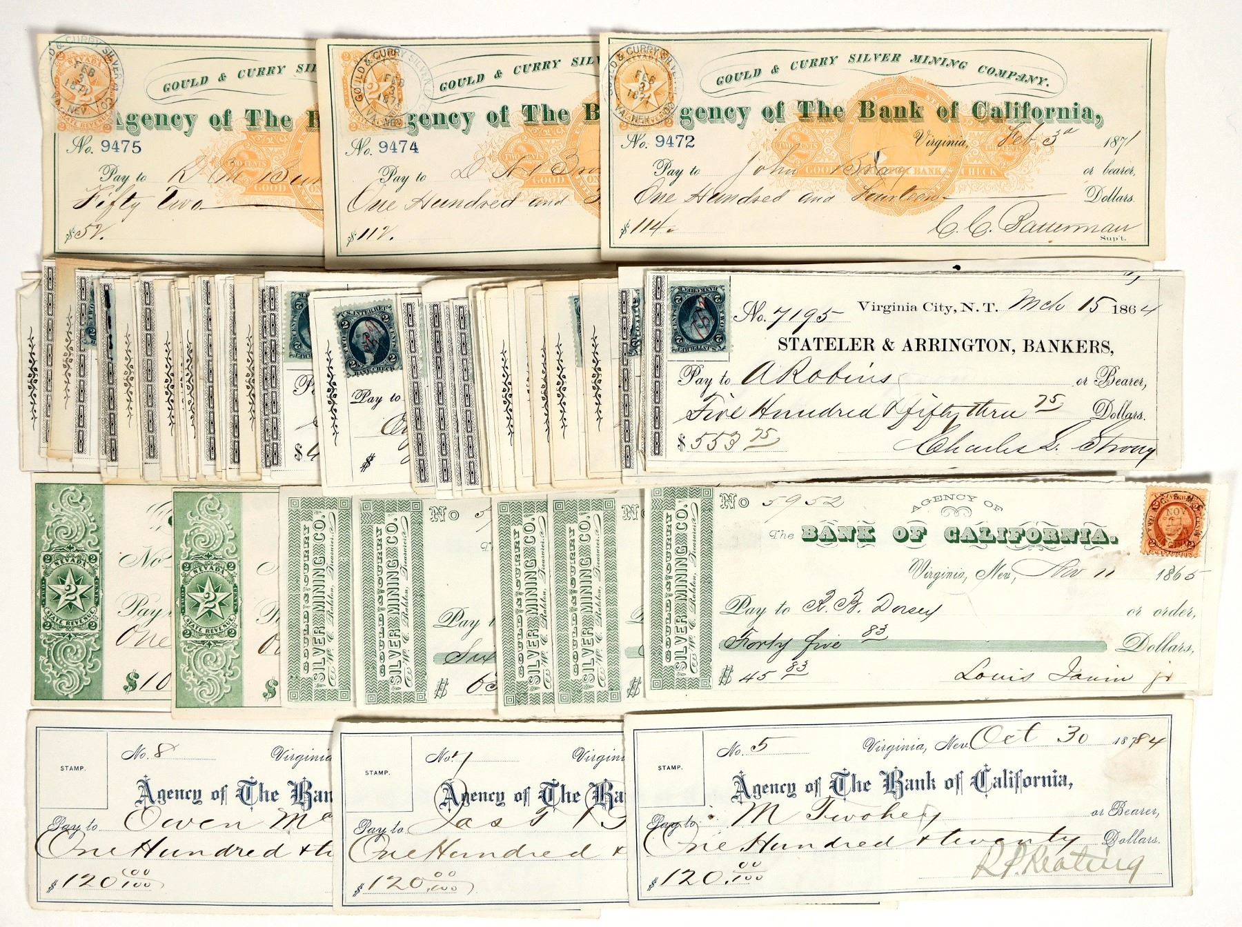 Lot of 73. Collection includes: 60 Stateler & Arrington territorial checks issued 1863-64, signed by either Charles Strong or Charles Bonner as supt., some with red bank cancels; three 1871 Gould & Curry checks with RN-C plus tied NV adhesive revenue, signed by CC Batterman; two 1869 Gould & Curry checks with RN-B and printed green NV stamp, signed by Isaac Requa; five 1865 G&C checks signed by Louis Janin; and three 1884 Bank of California checks signed by RP Keating. Please inspect.