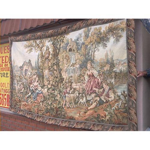 Stunning Tapestry. Very enormous. Measures 112"Wide by 64"Tall. Believe it's machine made, because it's perfectly done. Hand stitched backing, with hanging hooks stitched on as well. Has 5" border, which frames the beautiful scene. Simply one of the best you will ever see. Have to see it in person to really get a feel of it's size and beauty. Worth a lot more than what we are asking. Little to large for my house, or this baby would be going home with me. Hope you enjoy it.