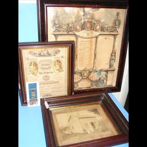 Large Walnut Framed Photo Civil War Soldier, etc. large group of family related items including mariage certificate, Civil War Soldier outside house, Company E Roster 118NY Volunteer plus Civil War Ribbon for NYS 118th.<Br>