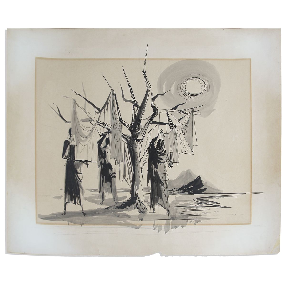 Ray Bradbury personally owned art by Joseph Mugnaini. Ink and watercolor painting depicts three figures hanging pieces of fabric from the branches of a bare tree, with mountain peaks on the horizon. Art is signed, ''Mugnaini / 1960''. Measures 30.5'' x 25.5''. Toning and a chip to bottom edge, else near fine. With a COA from the Ray Bradbury estate.