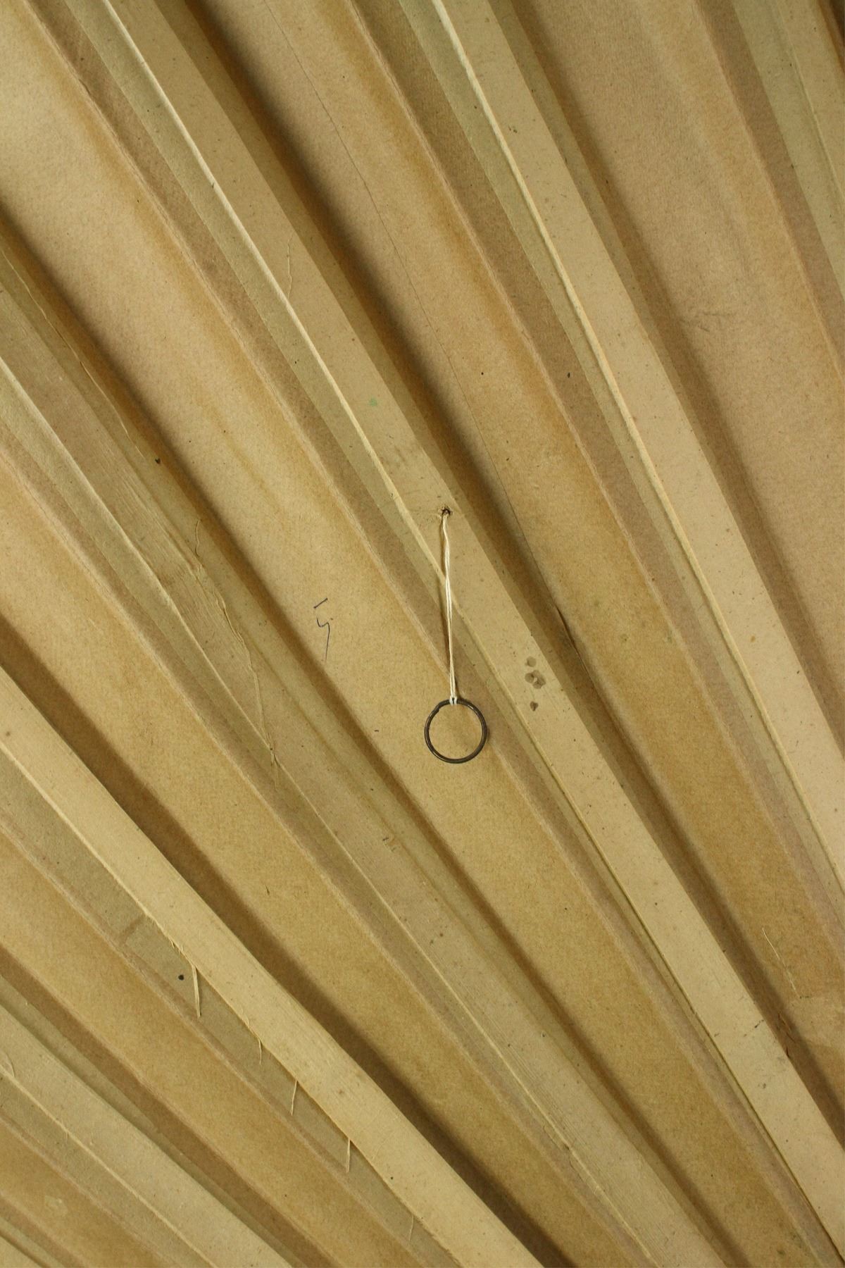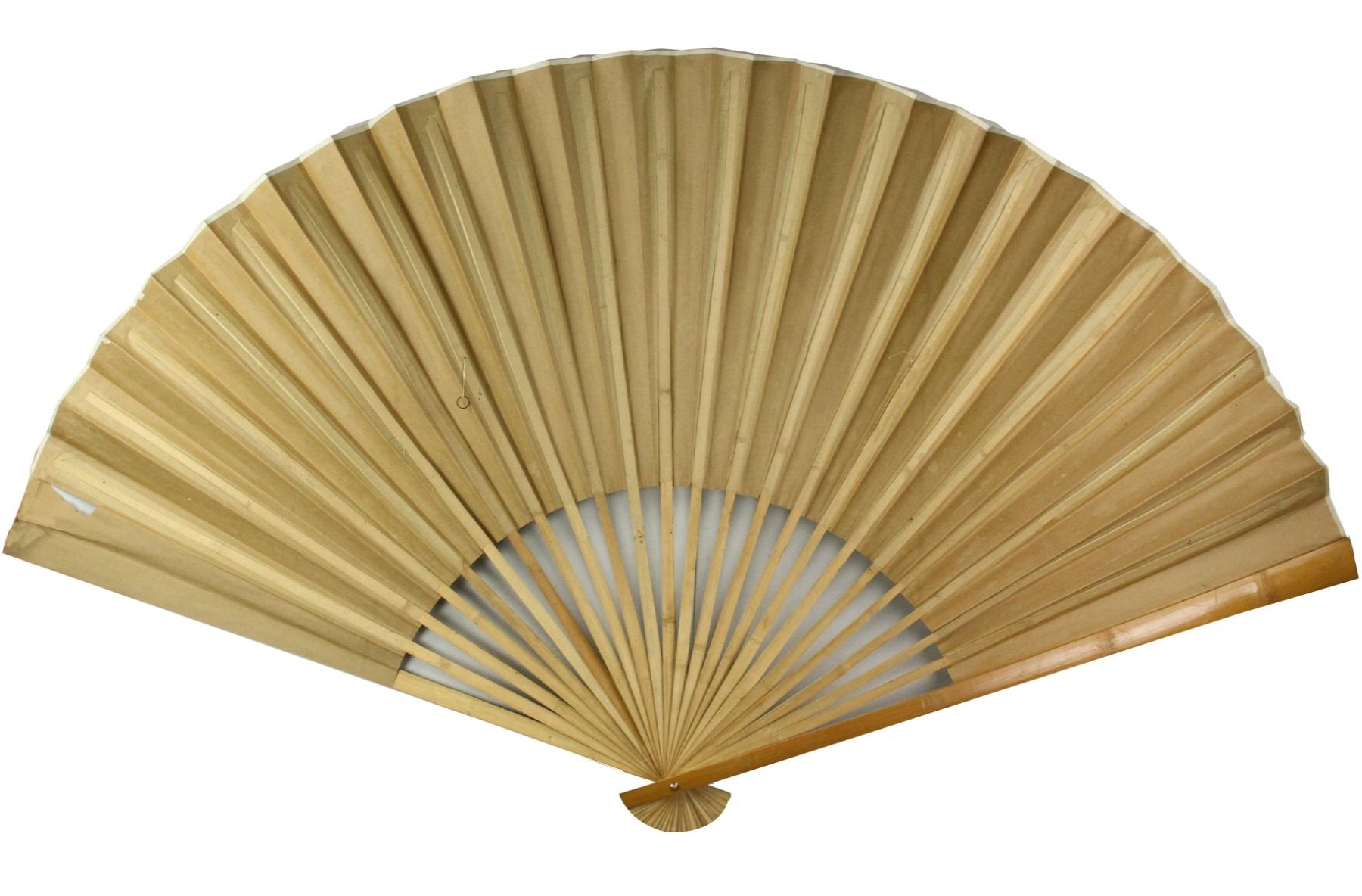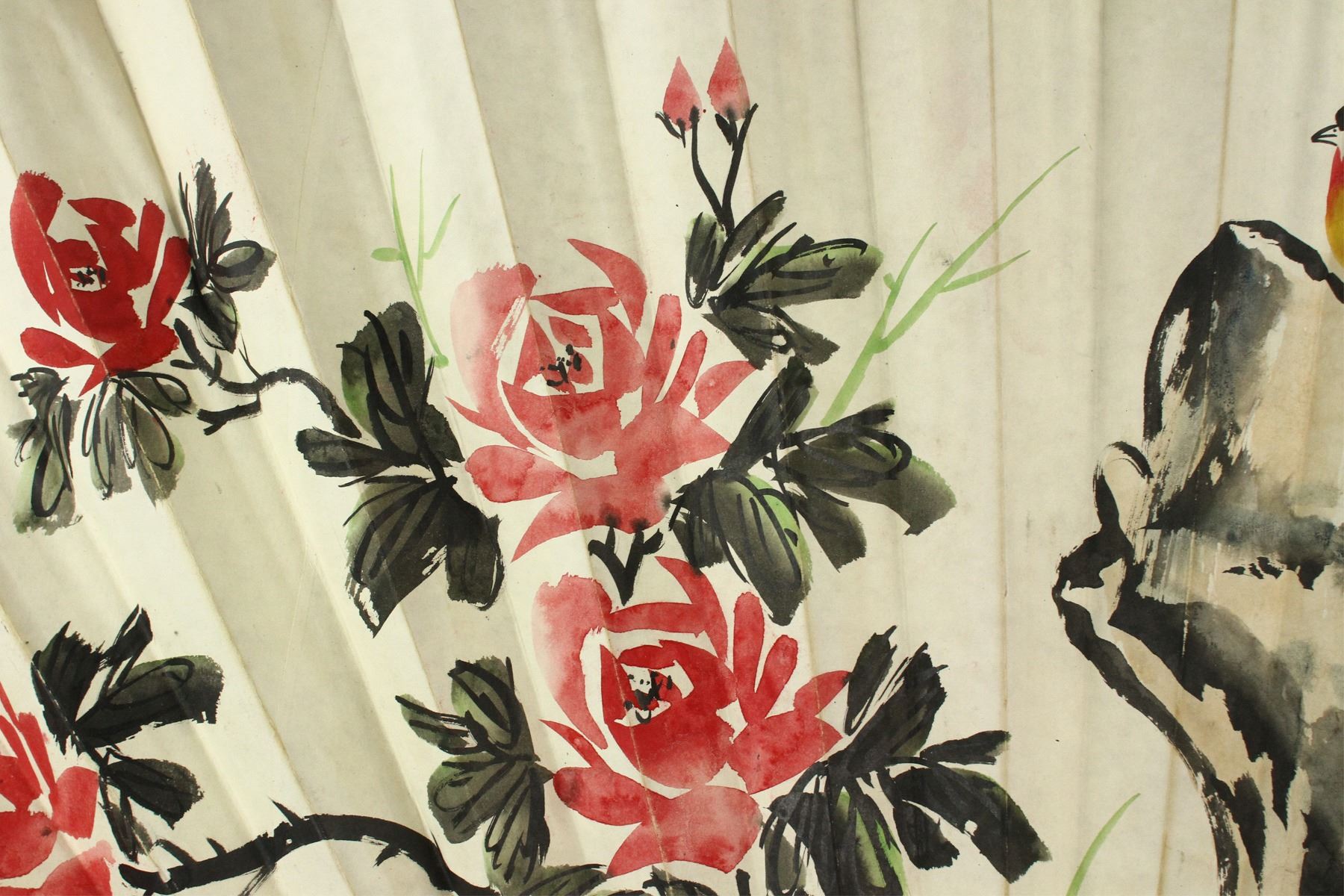 Songbirds perch on stone with flowers; Chinese ink and watercolour on paper; fan painting; condition issues: 2 inch tear on right side and a small tear on the top; L: 102 cm