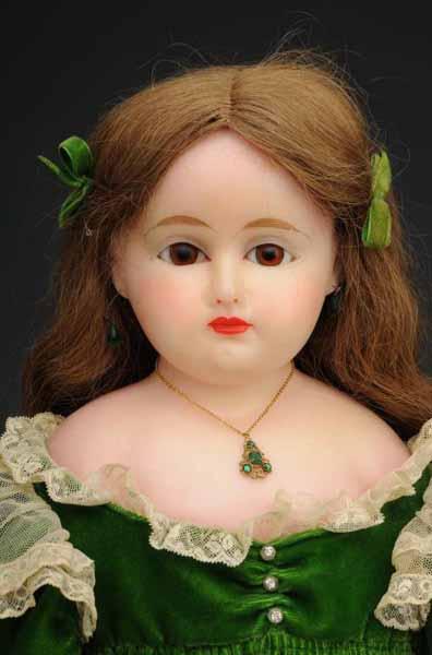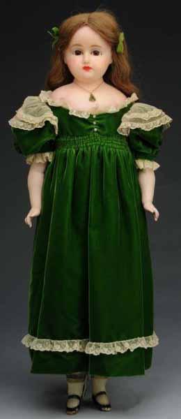 Description Germany, Ca. 1890. Wax shoulderhead (rewaxed, several cracks on plate), inset brown glass eyes, painted eyebrows, closed mouth, pierced ears, vintage human hair wig. Cloth body with wax over composition arms and legs with molded shoes and stockings. Redressed in green velvet. Condition (Very Good). Size 29" T.