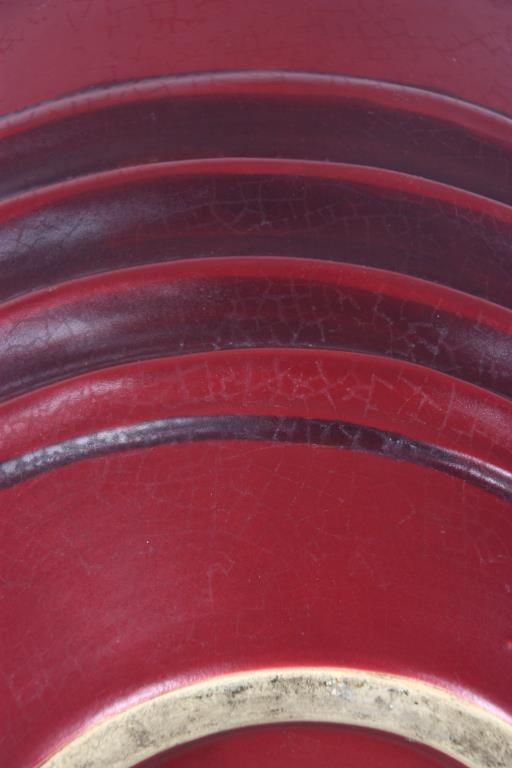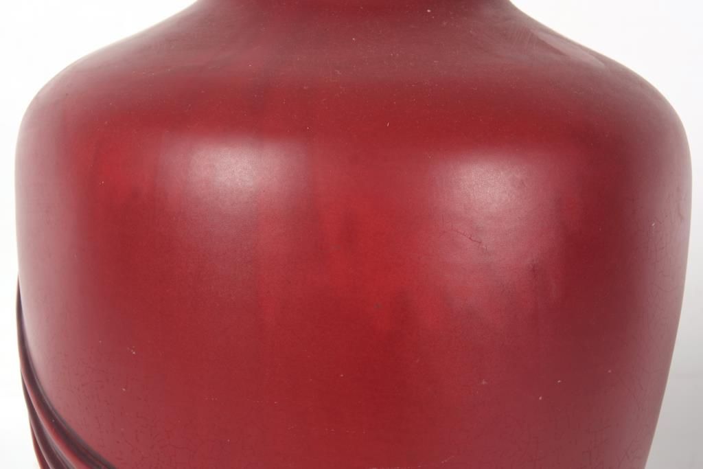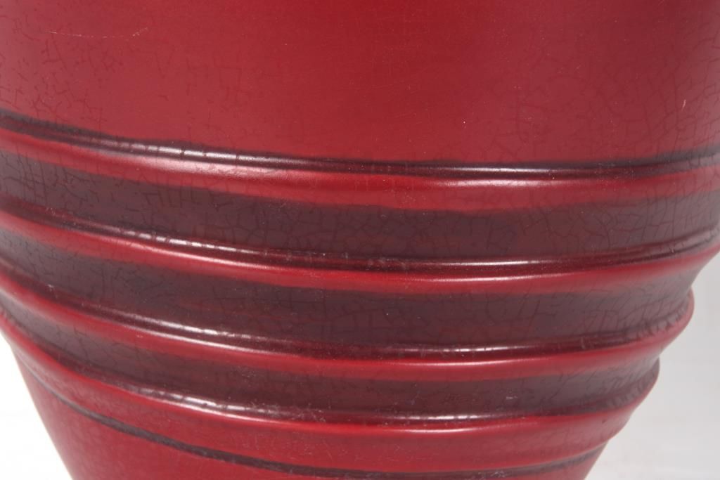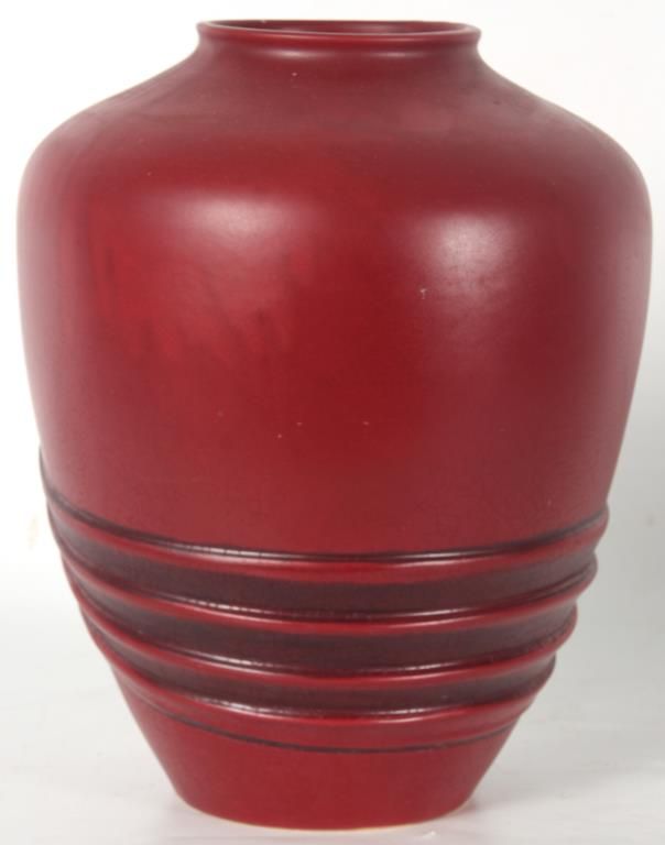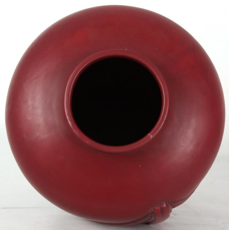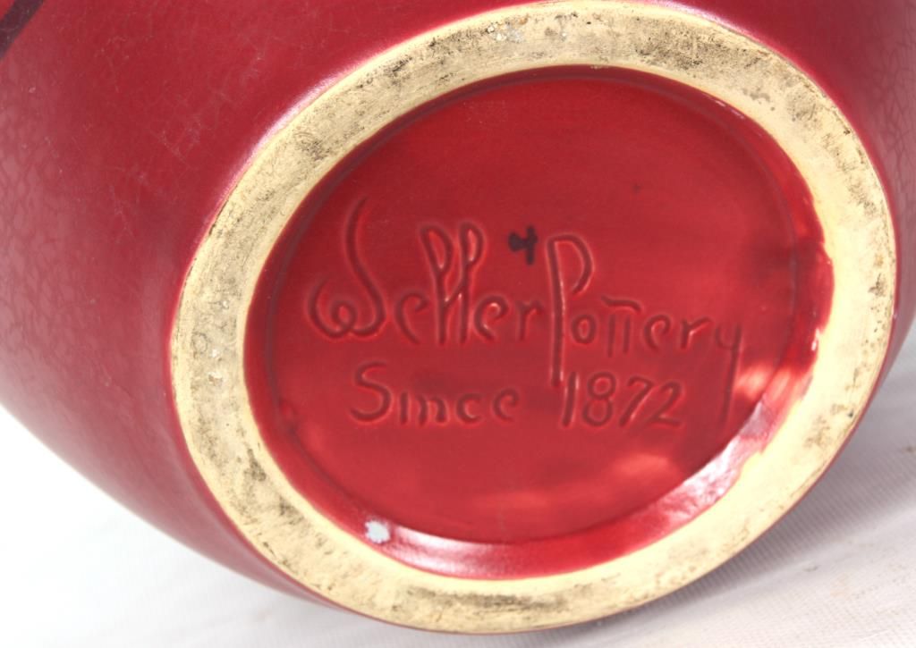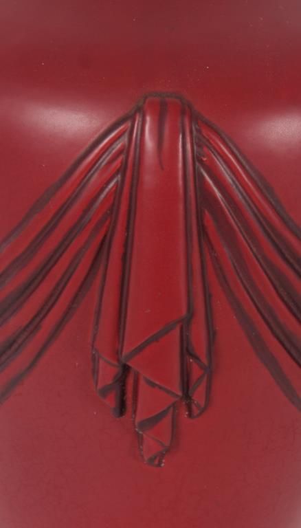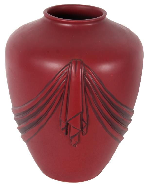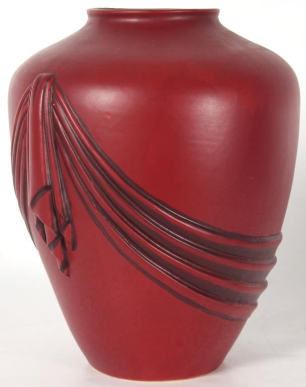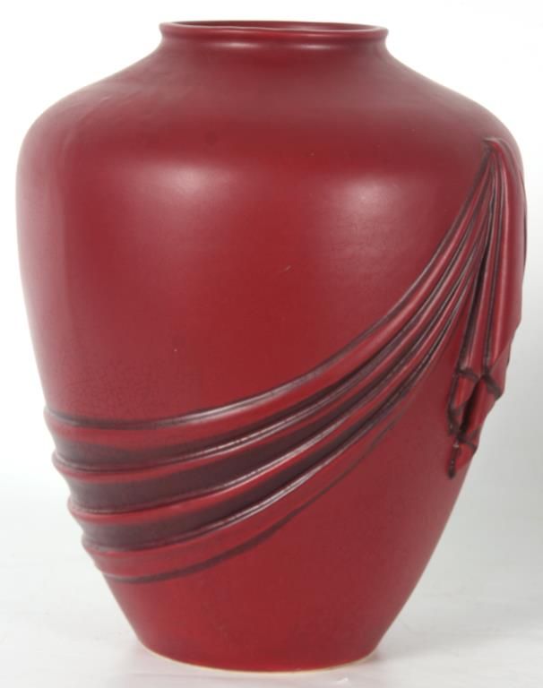 Large Weller Pottery Drapery Vase. Vase has a classic form, wrapped with a hanging drapery design and has a deep brick red glaze. Signed on the bottom, Weller Pottery Since1872. 13.5 in. high x 11 in. dia. & 4.75 in. dia. at the mouth.