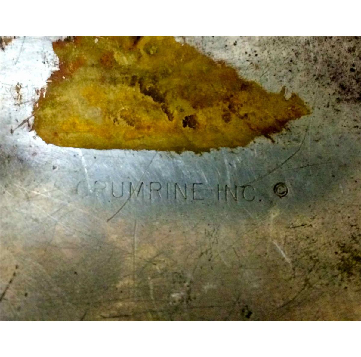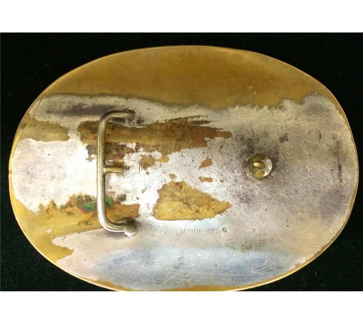 This “Texas” style belt buckle measures 5 1/2" wide by 4" tall and will fit a belt up to 1 1/2" wide. It has an eagle on the front of it. And has the Mark of Crumbrine Inc. on the reverse.