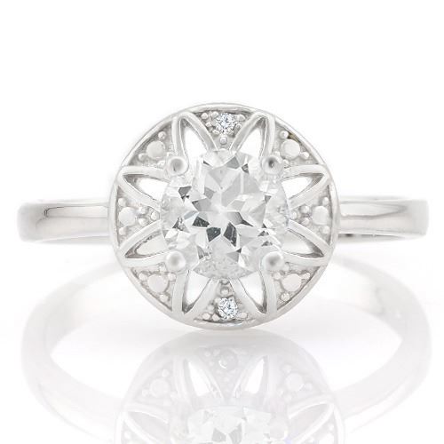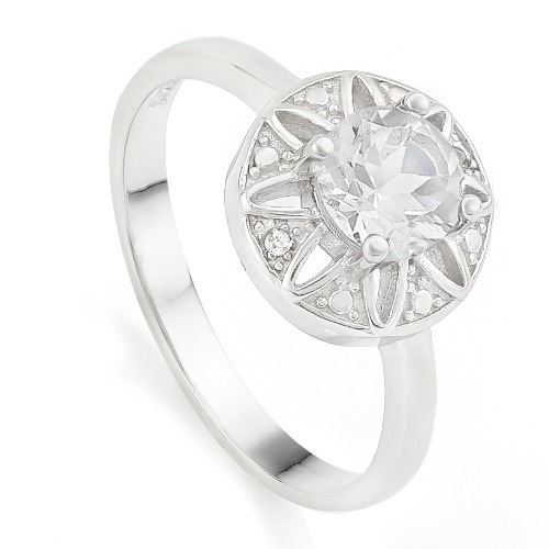 This ring has a vintage feel with an on-trend celestial design. Contains a 0.80ct genuine White Topaz gemstone with 0.01cts diamond accent. Mounting is Platinum over Sterling Silver for added brilliance. Size 7. 2.8g