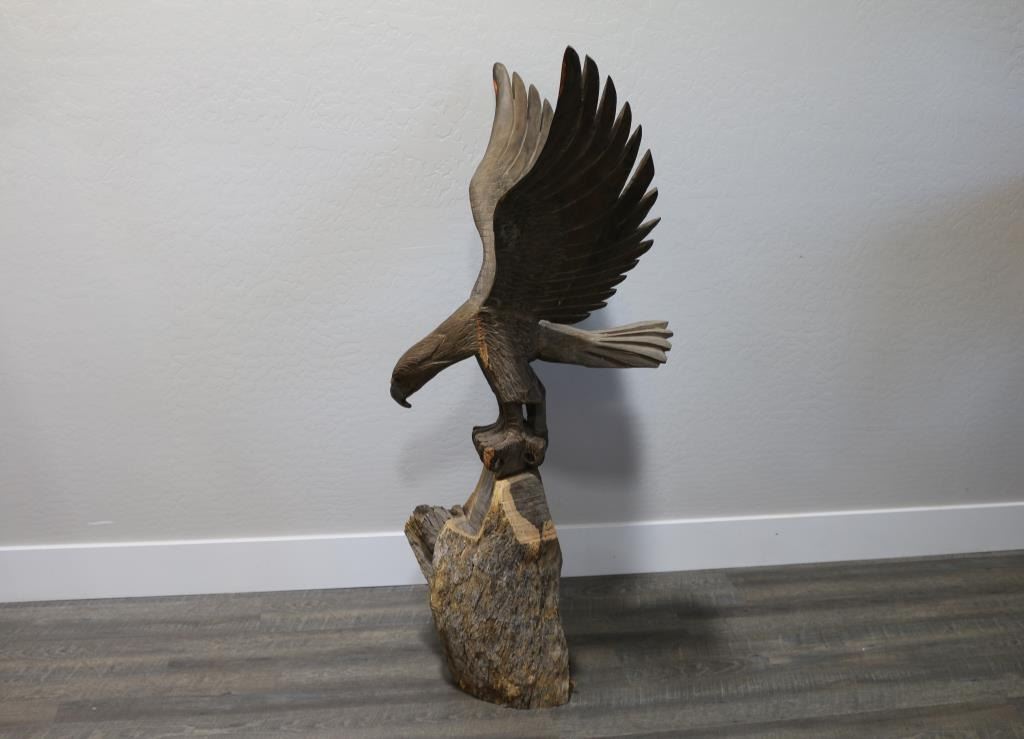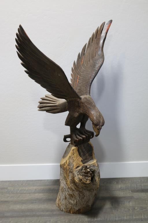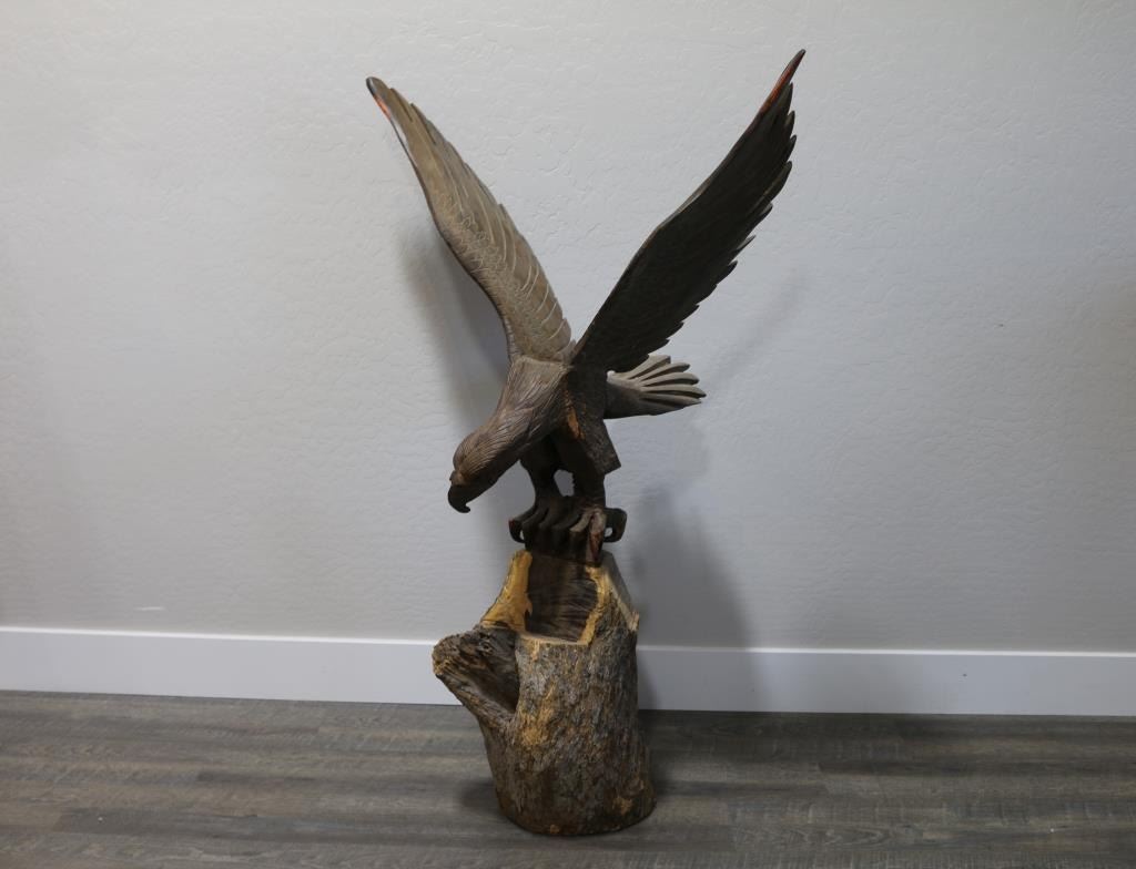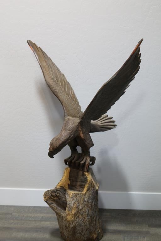 On tree trunk stand. Total piece measures 53". Wing span measures 34". 22" deep. Nicely carved, heavy piece. Local pickup only.