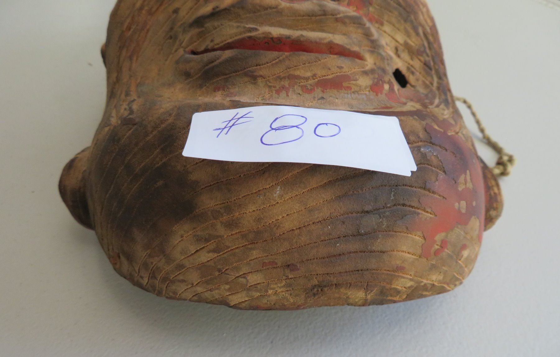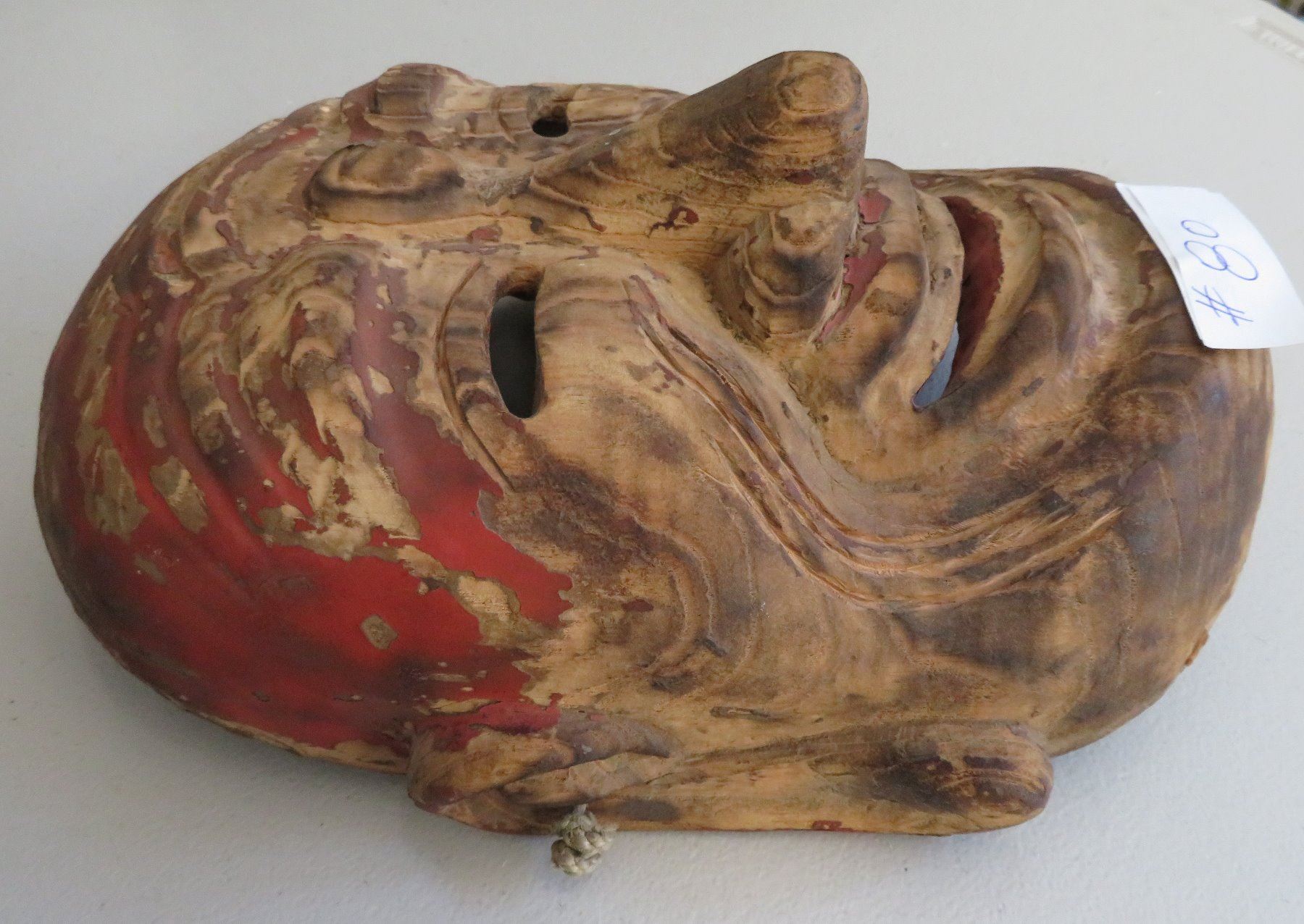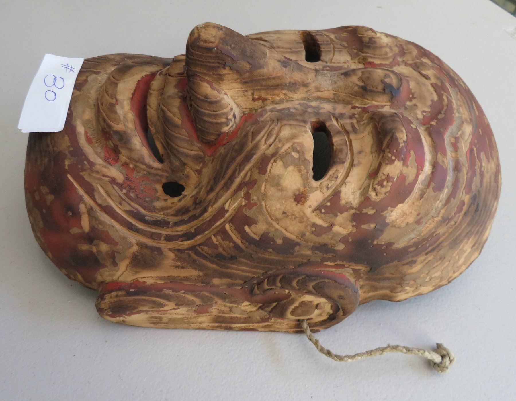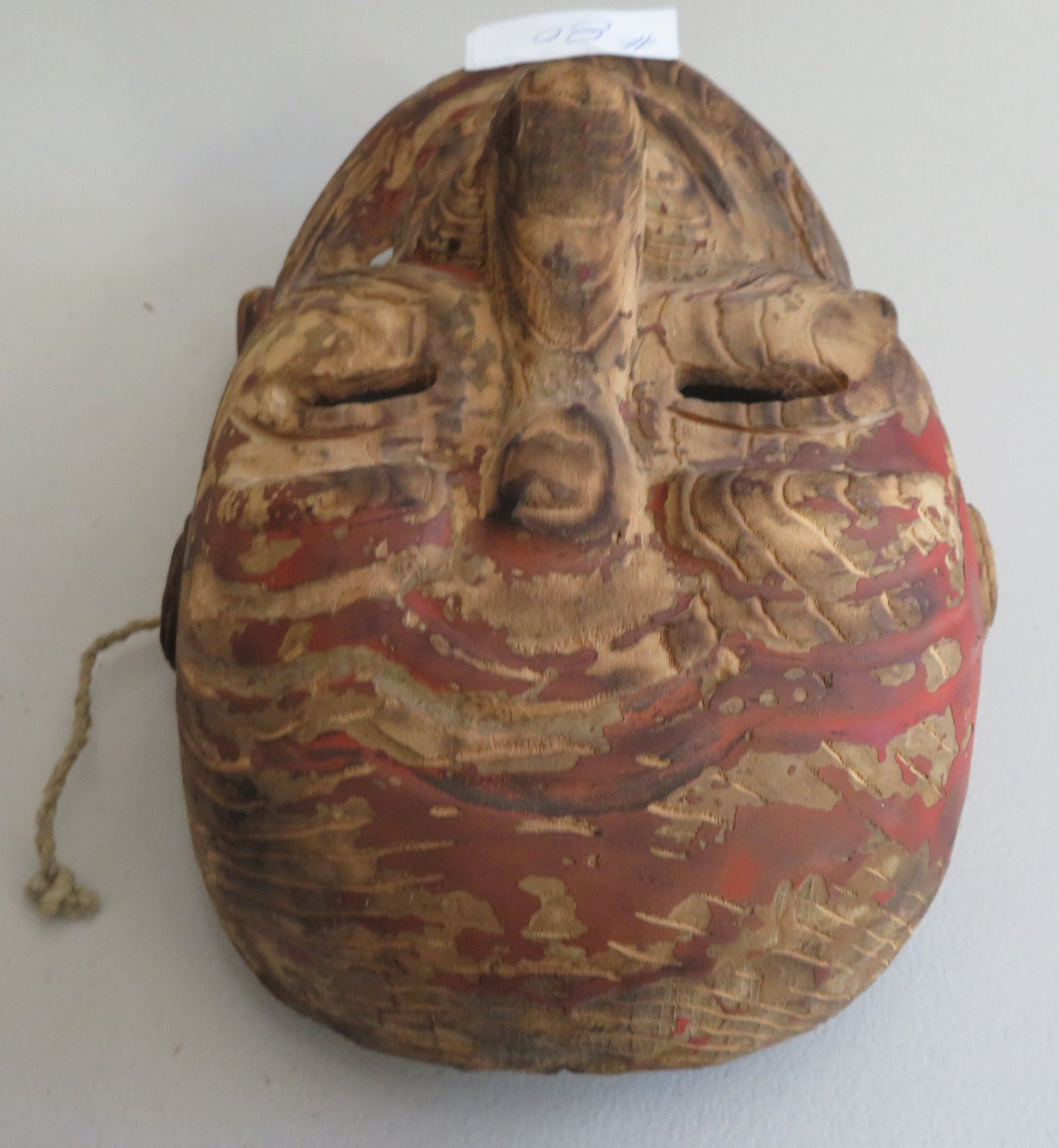Large Wood Mask, c. 1890s. Made of wood and paint, the item measures 14" x 8" x 5". China. Condition: Most of red paint has been lost, see images. Shipping: $32.50 w/insurance and signature, due to size.