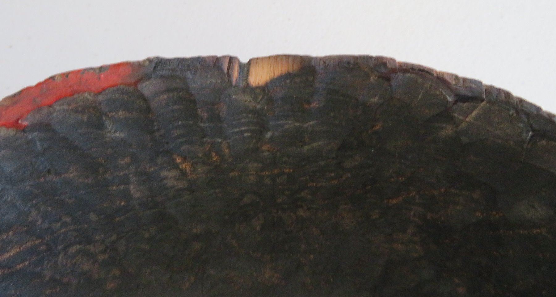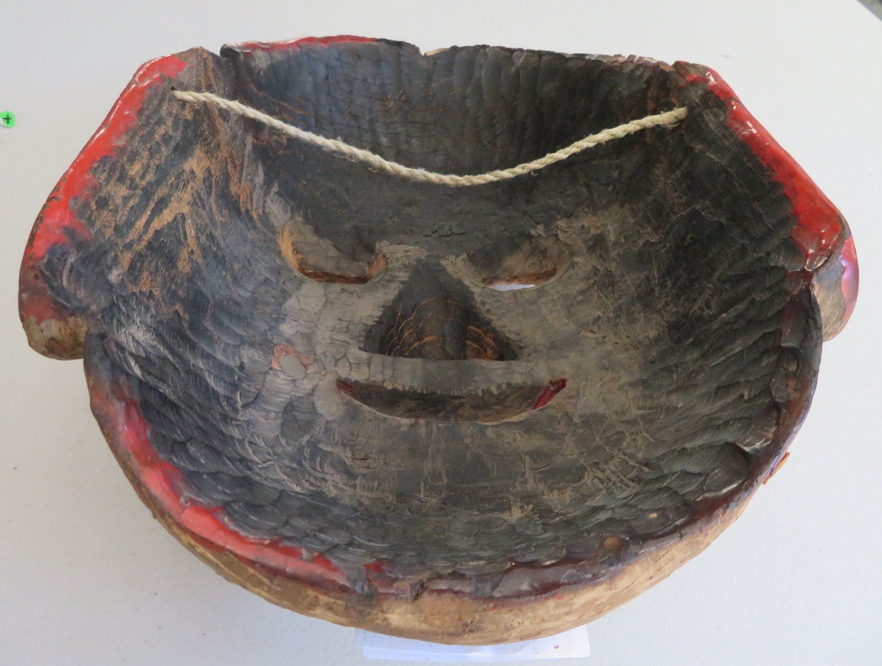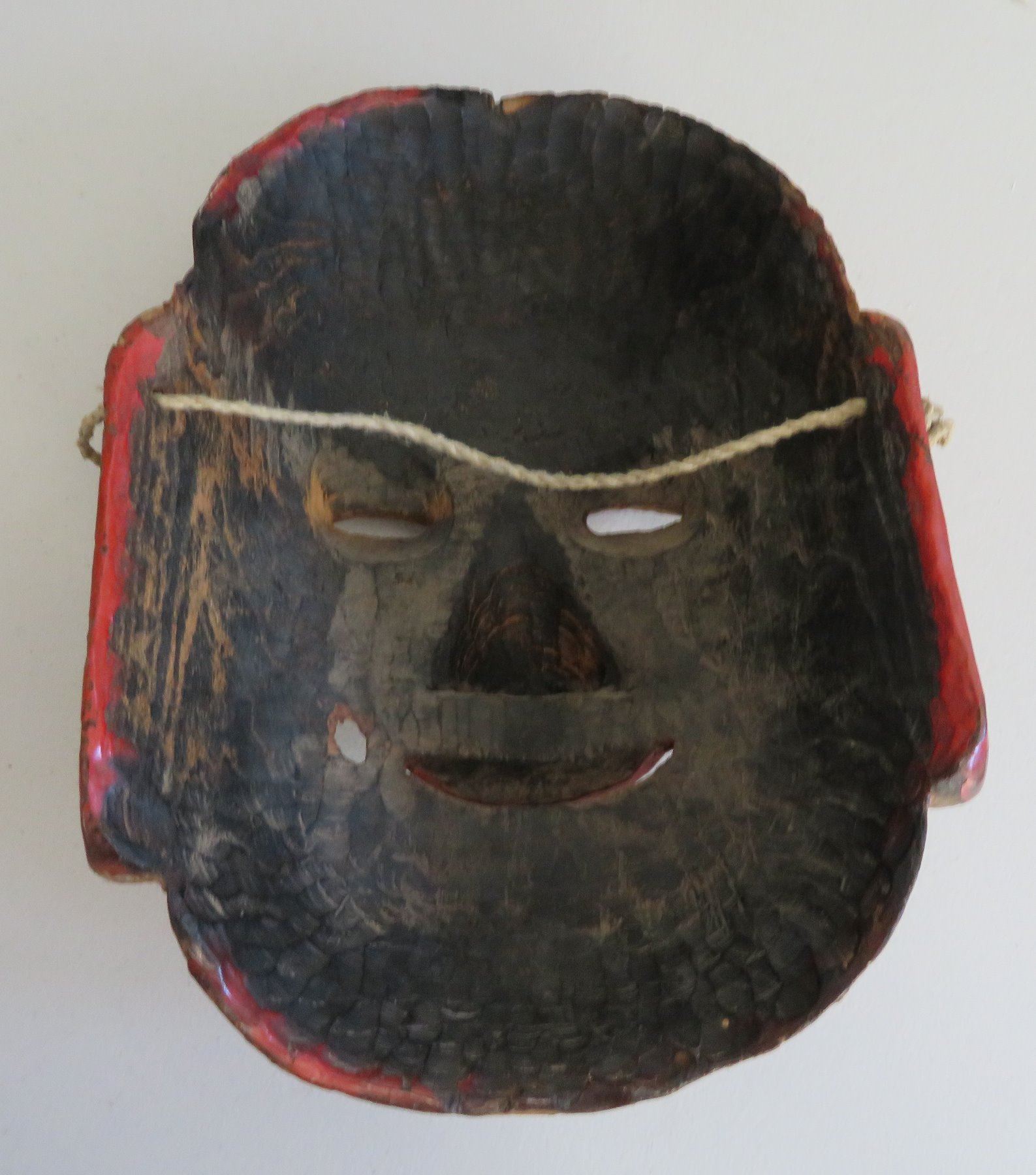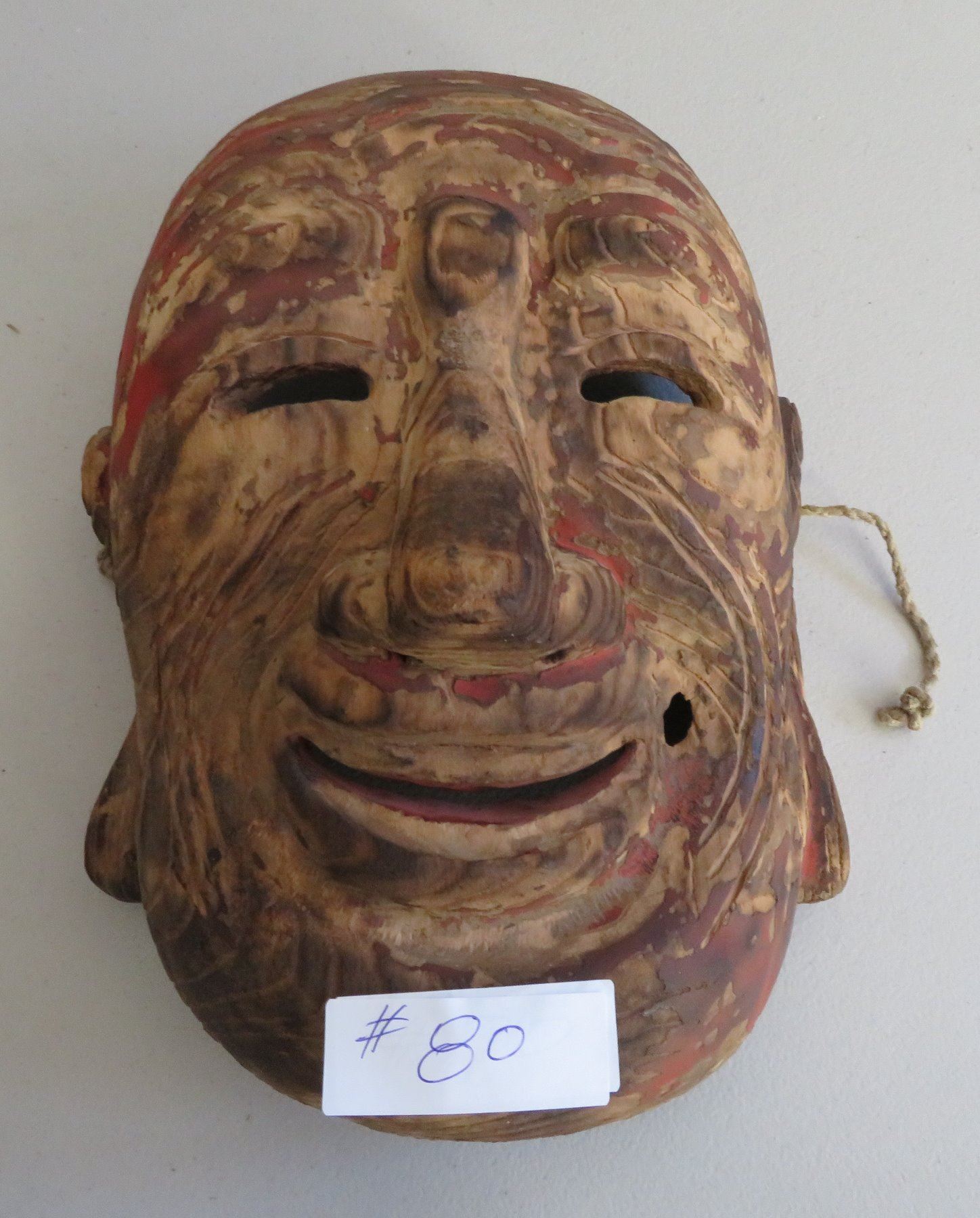 Large Wood Mask, c. 1890s. Made of wood and paint, the item measures 14" x 8" x 5". China. Condition: Most of red paint has been lost, see images. Shipping: $32.50 w/insurance and signature, due to size.