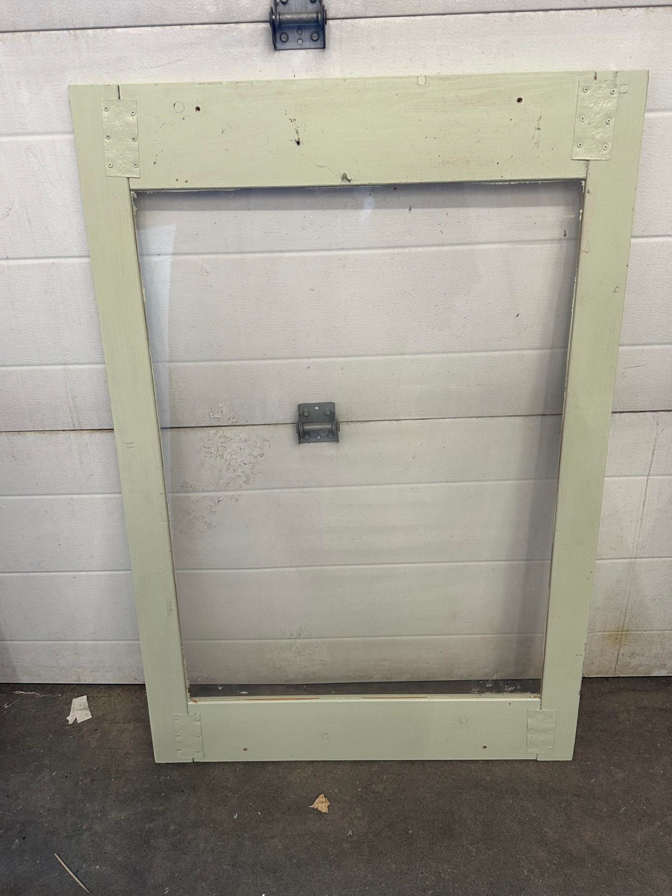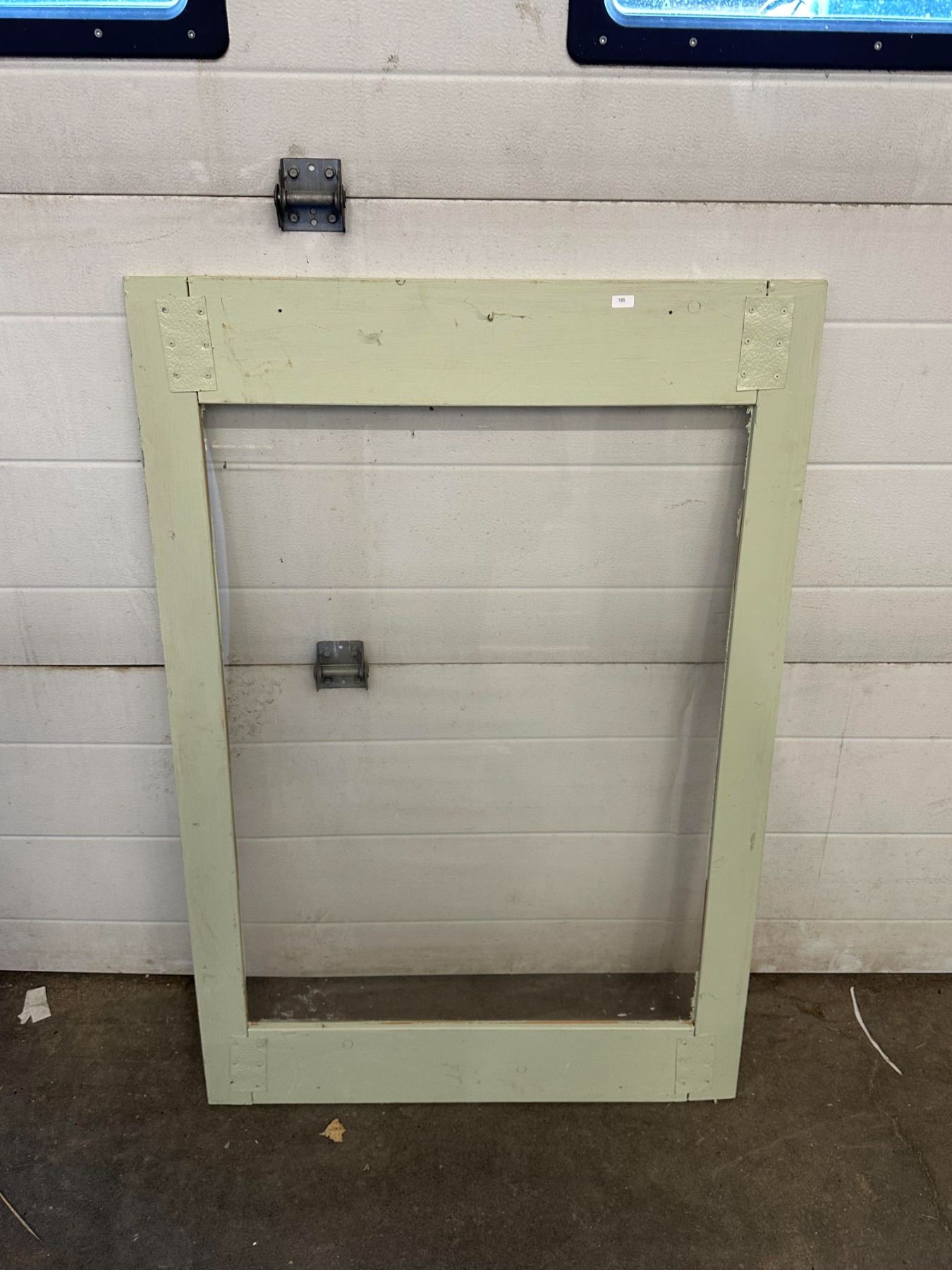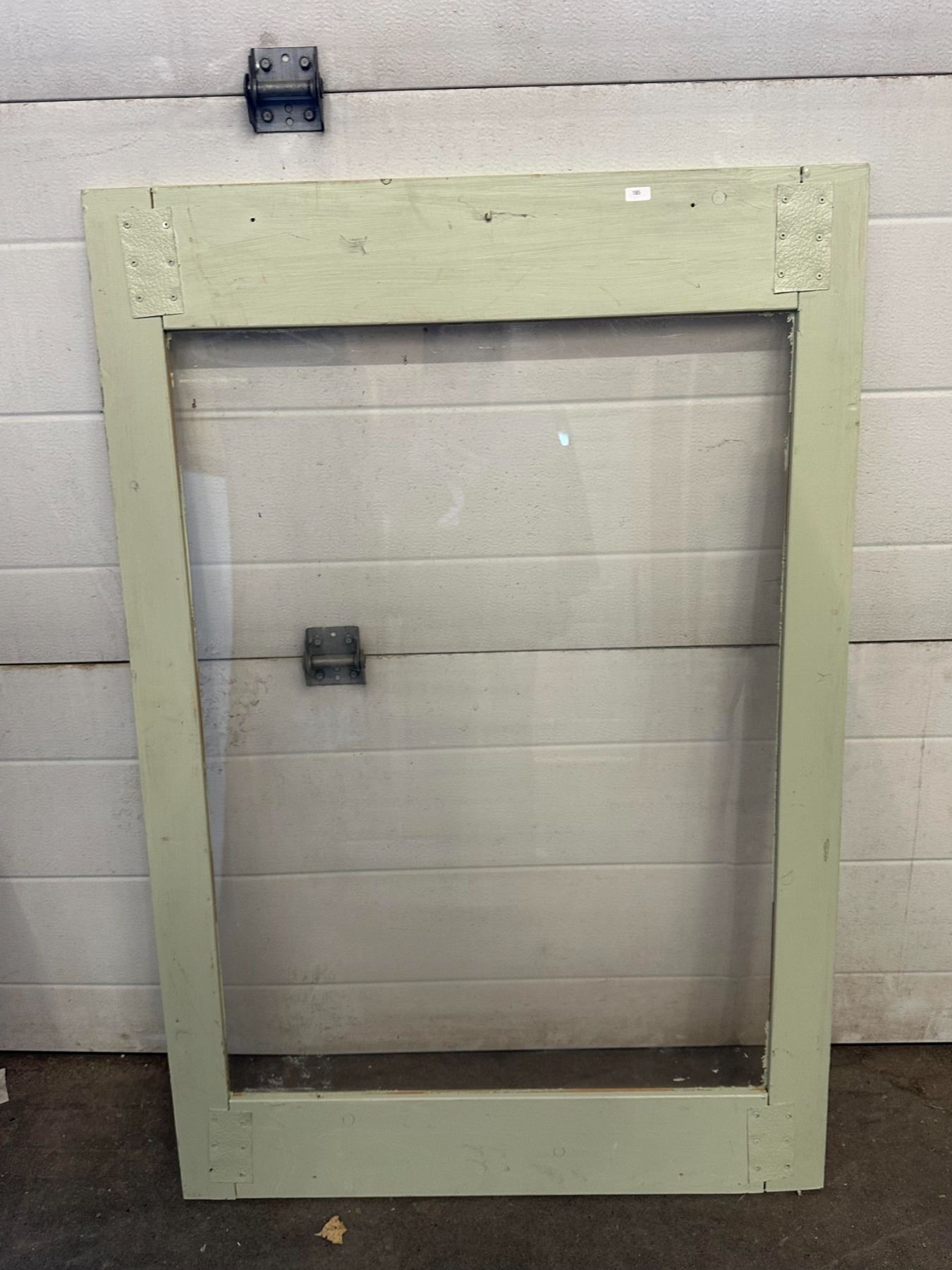 Oversized wooden window frame with intact glass. Approx. mid-century. Condition: paint wear and surface marks.