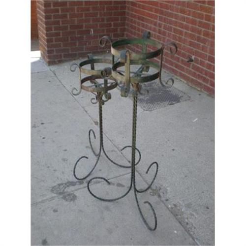 Large Wrought Iron Plant Stands. Great for out doors, as they can take the weather. They are very large and will cost some to ship, just so you know, they will be oversized, as the bases are wide. They measure 'Tall one' 43.25" X 16" W and 10" Middle or top. 'Shorter one' is 33" H X 15.50" W and 10" Top Diam. So as I said, they are very large at the bottom. They have great scroll work accents and twisted metal bases. Very unique and different. Extremely gorgeous though. An excellent addition to any garden. This isn't the new cheap wrought iron, this is solid vintage wrought iron. They will definitely stand the test of time.