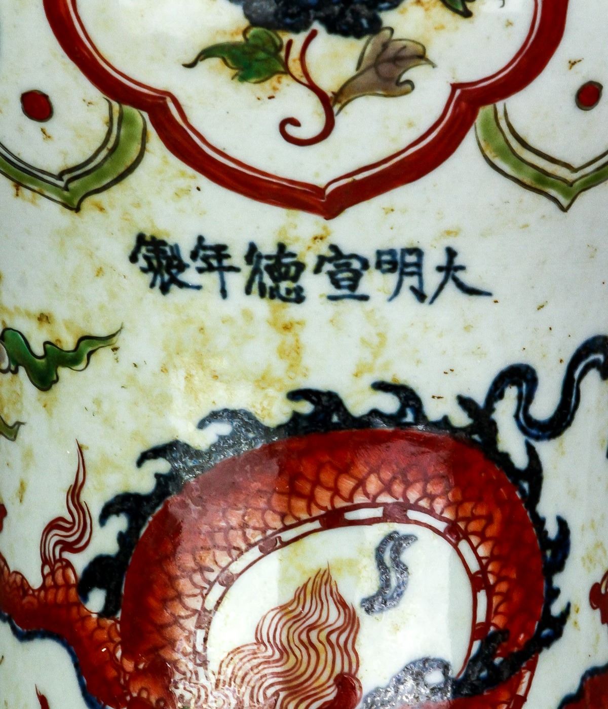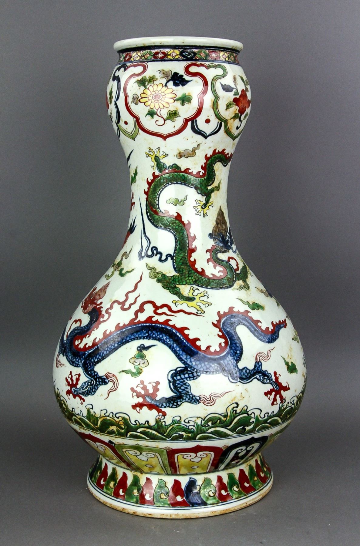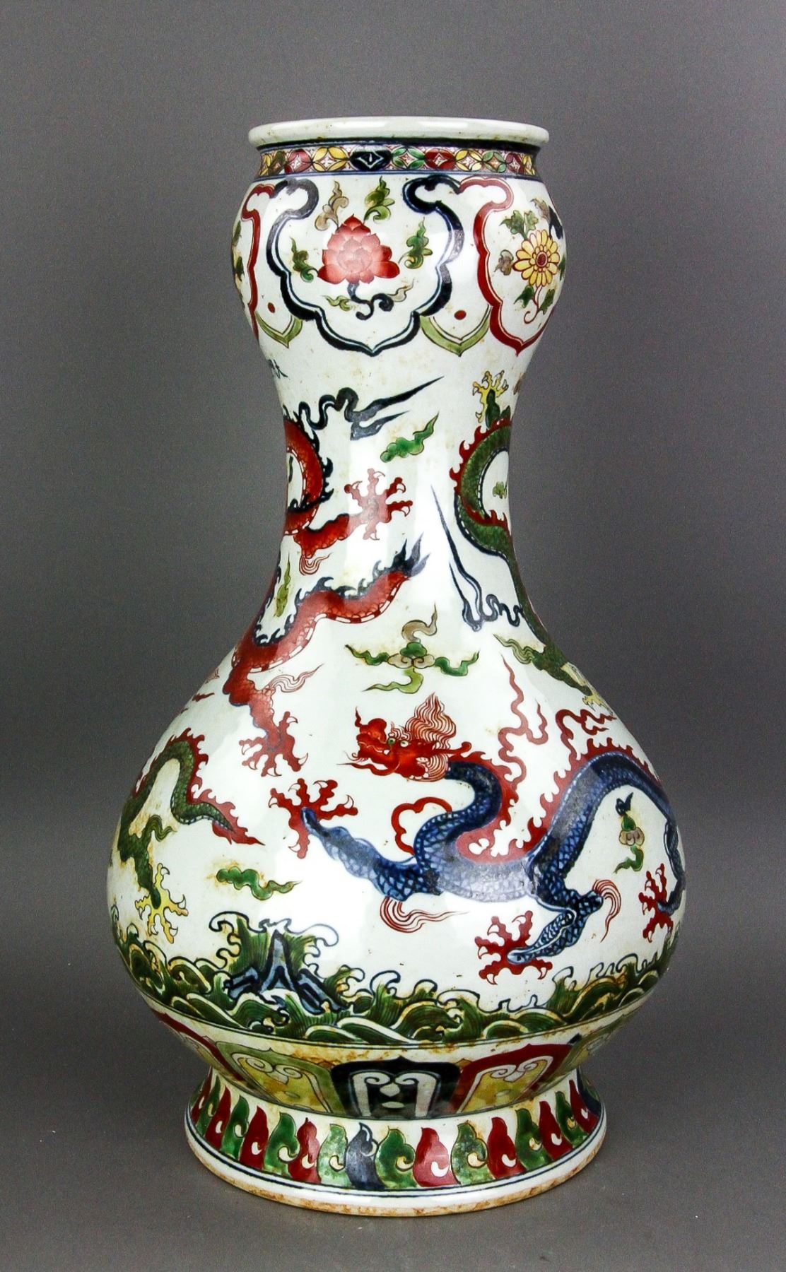 Chinese large Wucai porcelain vase; of pear-shaped body with garlic-shaped mouth; featuring five-clawed dragon amidst clouds; six-character Xuande mark on neck; unglazed base; H: 50 cm, D: 14 cm, 8 kg