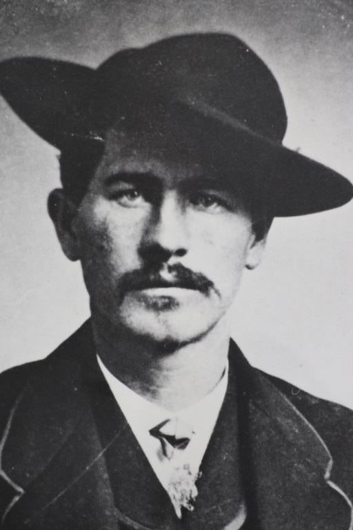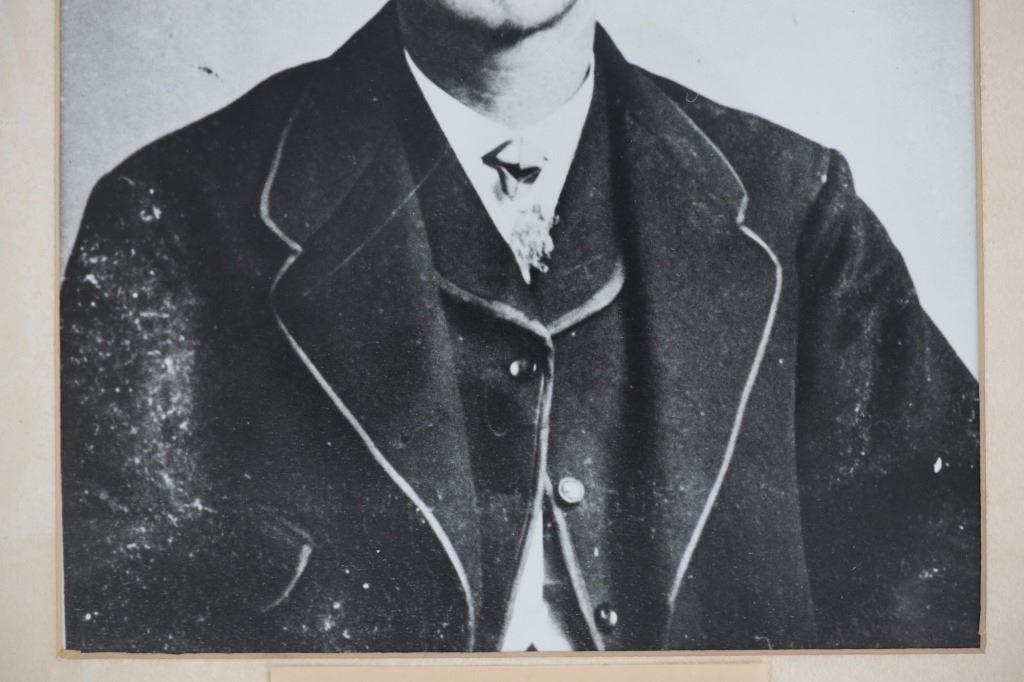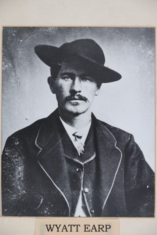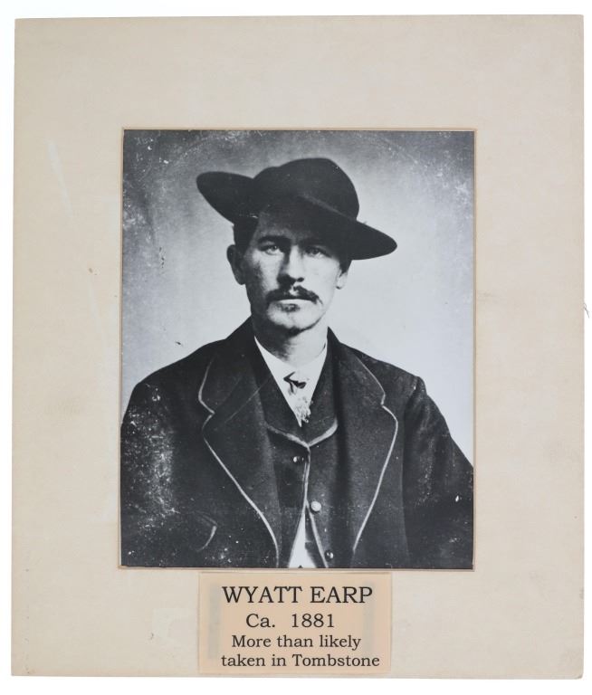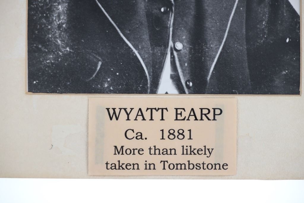 Presented in this lot is a Wyatt Earp Museum Photograph circa 1881. Provenance: Tombstone Western Heritage Museum, Tombstone, Arizona, museum rendition. Wyatt Earp was a legendary America Old West gunslinger, gambler, and lawman in Dodge City, Kansas, Deadwood in Dakota Territory and Tombstone in Arizona Territory. Earp was involved in the gunfight at the O. K. Corral, during which lawmen, which included his brothers Morgan and Virgil as well as Doc Holliday, killed three outlaw Cochise County Cowboys on October 26, 1881. After leaving Tombstone, Wyatt went to San Francisco to spend time with his convalescing brother Virgil, his wounds received during the Gunfight at the O. K. Corral in Tombstone. After leaving Tombstone in 1882, Wyatt and Josephine Earp eventually settled in the Los Angeles area from 1911 until his death in 1929. Earp's time in Los Angeles was split between summers in Los Angeles and the rest of the years at their "Happy Days" gold mining camp near Vidal, California. Even in his later years, Earp retained a notable presence, consulting on Western films and maintaining connections with celebrities like novelist Jack London, directors John Ford and Raoul Walsh, and actors Charlie Chaplin, William S. Hart and Tom Mix, who was a pallbearer at his funeral. The Tombstone Western Heritage Museum presented an ever-expanding collection of 12,000-plus objects related to Tombstone and the broader Old West. At the heart of the museum were original papers, photos, firearms, furniture, clothing, conveyances and other artifacts relating the history of the town and its citizens. A central display case was devoted to Earp family photos and keepsakes, including snapshots of brothers Virgil and Wyatt and a C.S. Fly–stamped photograph of Josephine Earp at age 18. One shelf held a locket of Josie’s, with facing photos of her and husband Wyatt. Above it a personal letter from Josephine, the canceled envelope addressed in Wyatt’s hand. Adjacent display cases held official and personal papers, possessions and photos (many by Fly) of such Tombstone icons as prospector and town founder Ed Schieffelin, first Mayor John Clum, gunsmith S.L. Hart, the aforementioned Earps and their McLaury and Clanton nemeses. Here, too, were mementos of the nameless everymen and women— miners and cowboys, actors, gamblers, saloon girls and prostitutes—who lived and died within blocks of this corner. The attached Tombstone Western Heritage Museum label on the matting border face, "WYATT EARP Ca. 1881 More than likely taken in Tombstone". Photograph exhibits scratches, matting exhibits scratches and soiling. Visible image measures 7.5"W x 9.25"L, matting is 12.125"W x 14.125"L, combined weight is U6.