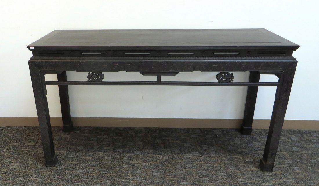 Apron and legs are carved with repeating pattern. Floating top panel sits above an oval pierced apron. Carved dragon medallions are featured between apron and stretchers. Mortice and tendon joinery. NO RESERVE! ! Most items in this sale have no reserve