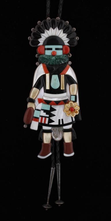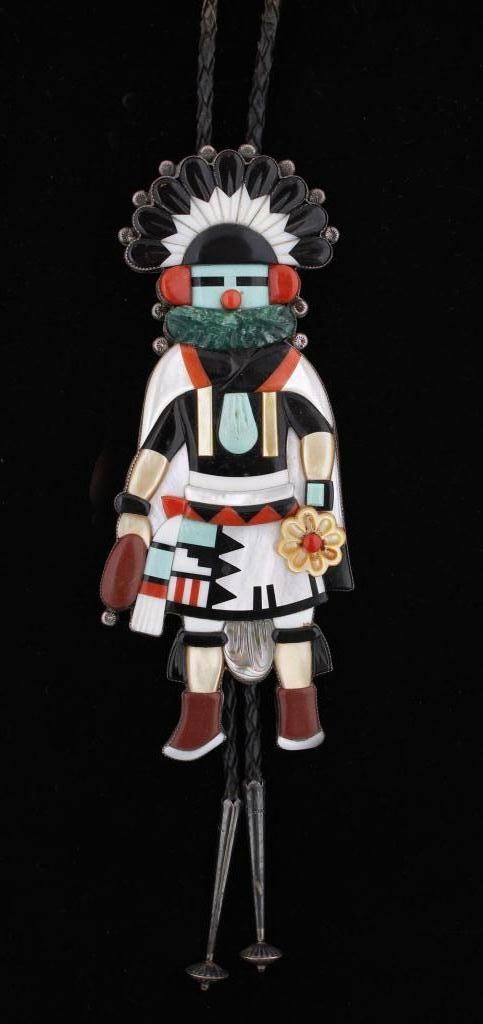 Large Zuni Kachina Bolo Tie by A DewaSet in sterling silver, signed on back, inlaid semi-precious s