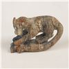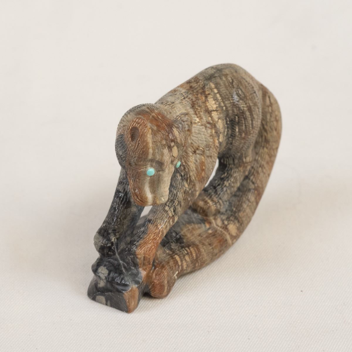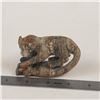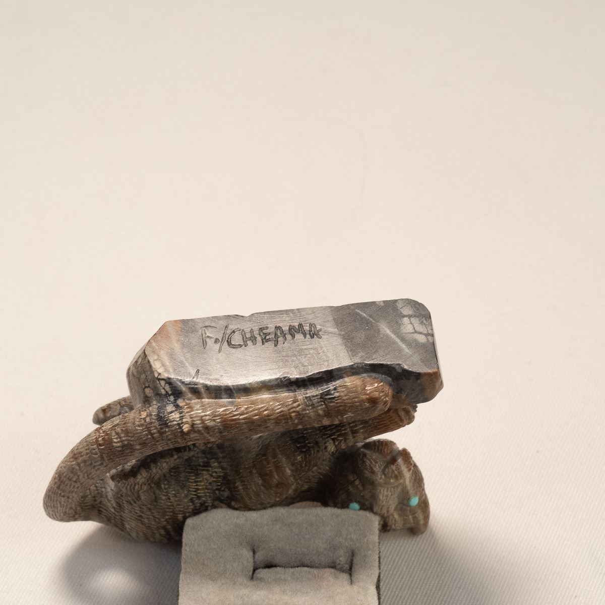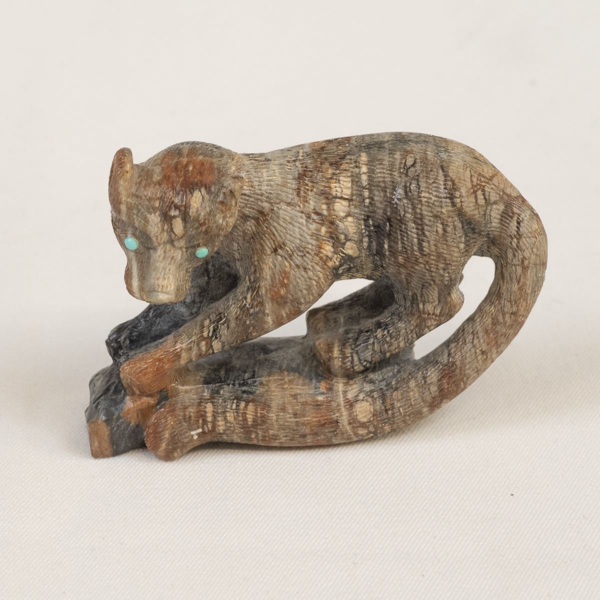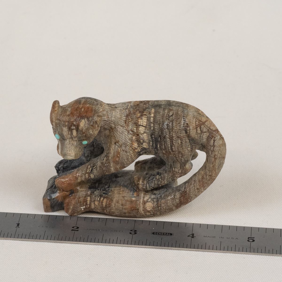 Large Native American Zuni Picasso Marble Mountain Lion Fetish by Fabian Cheama, measures 2.25'' x 3.5'', turquoise eyes, signed on the bottom