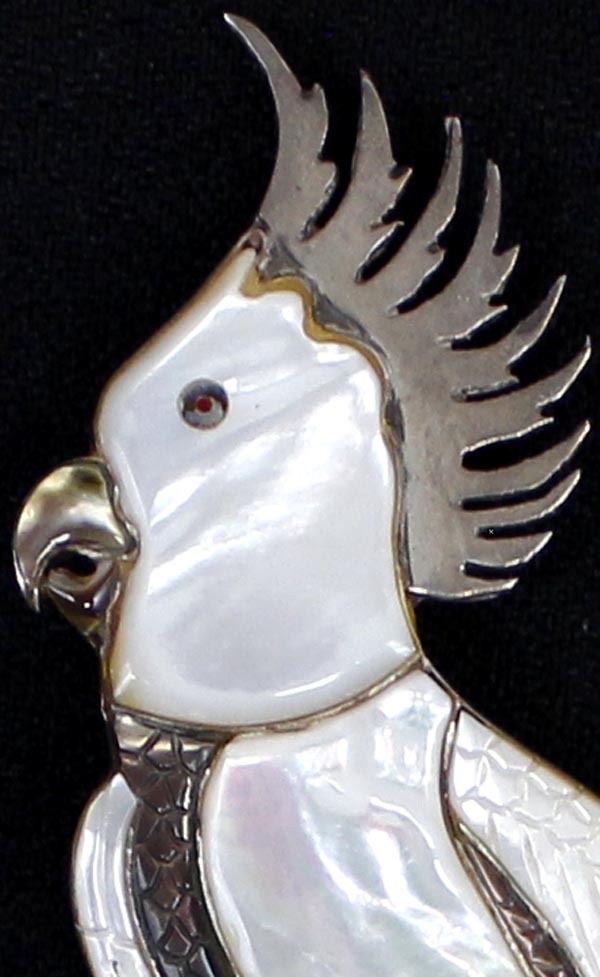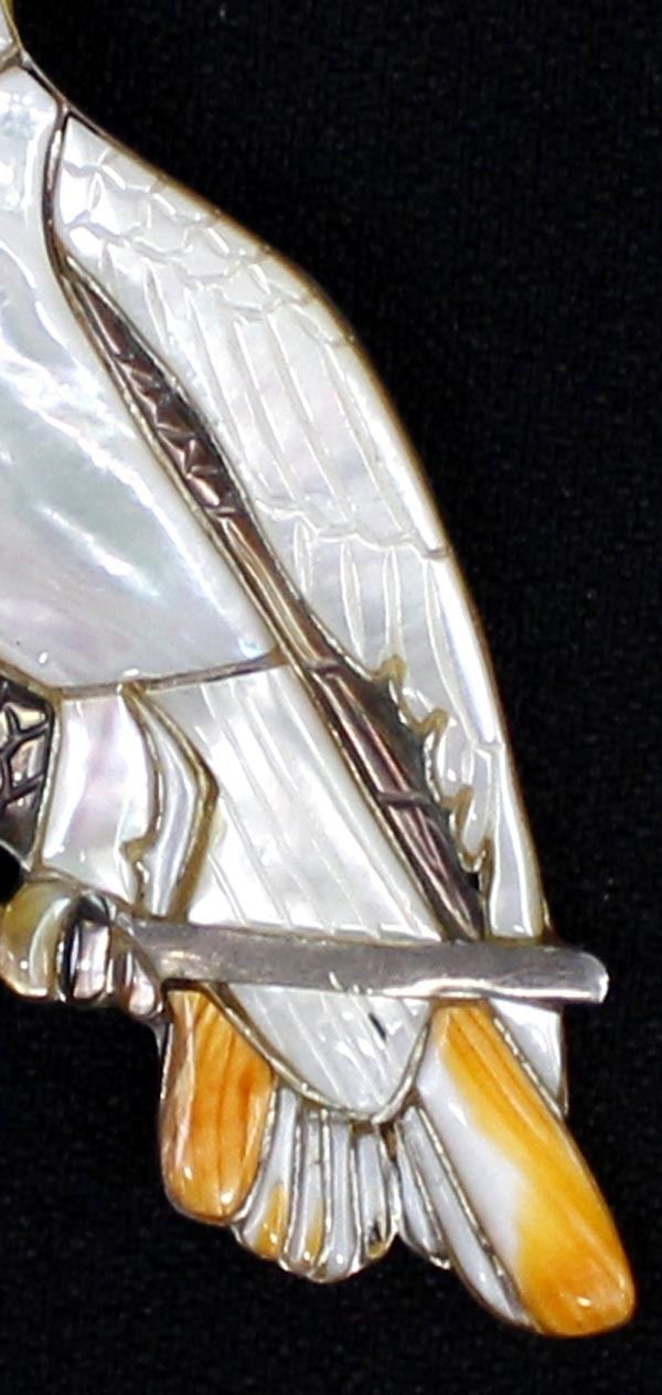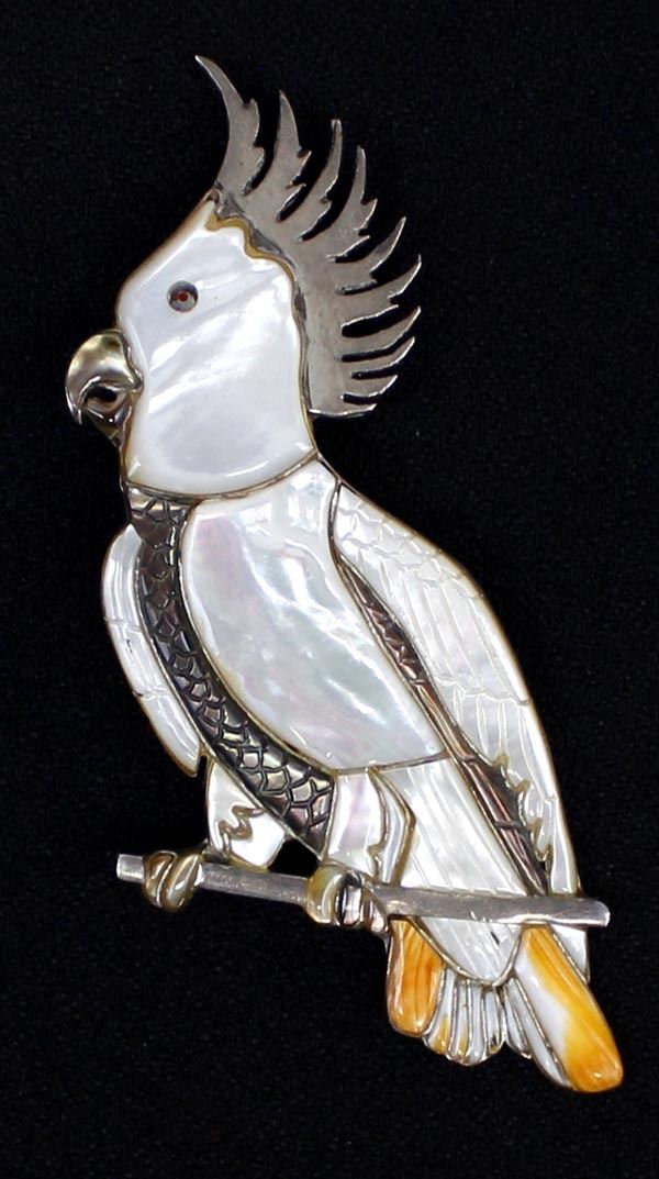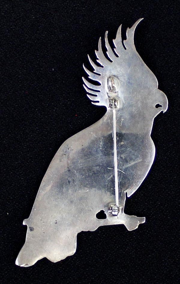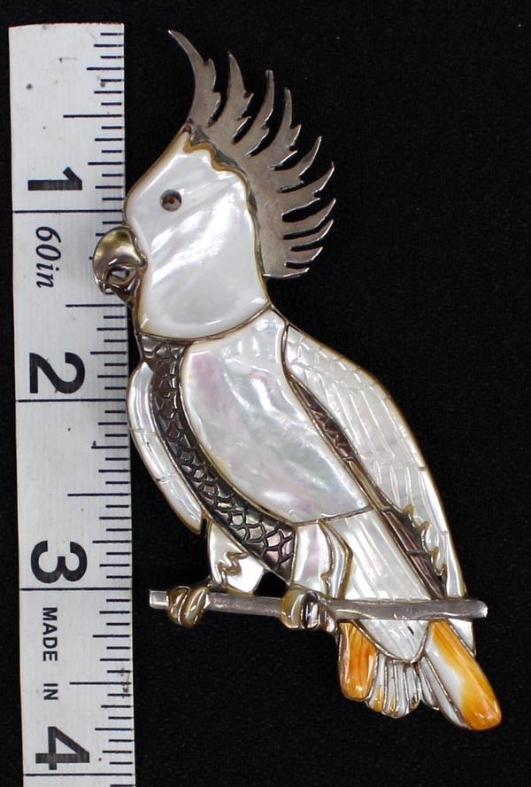 Large Native American Zuni Sterling Inlay Cockatoo Pin Pendant, measures 2'' x 4.25'', stamped sterling, inlay includes orange shell and mother of pearl