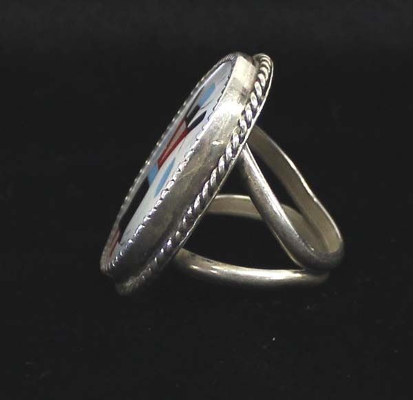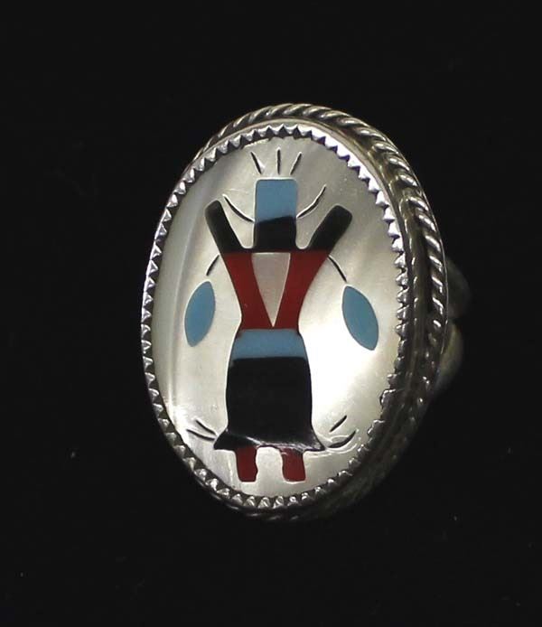 Large Vintage Native American Zuni Sterling Inlay Crown Dancer Ring, Size 6.75, measures 1.25'' x 1'', inlay includes mother of pearl, tuquoise, onyx (or jet), and coral